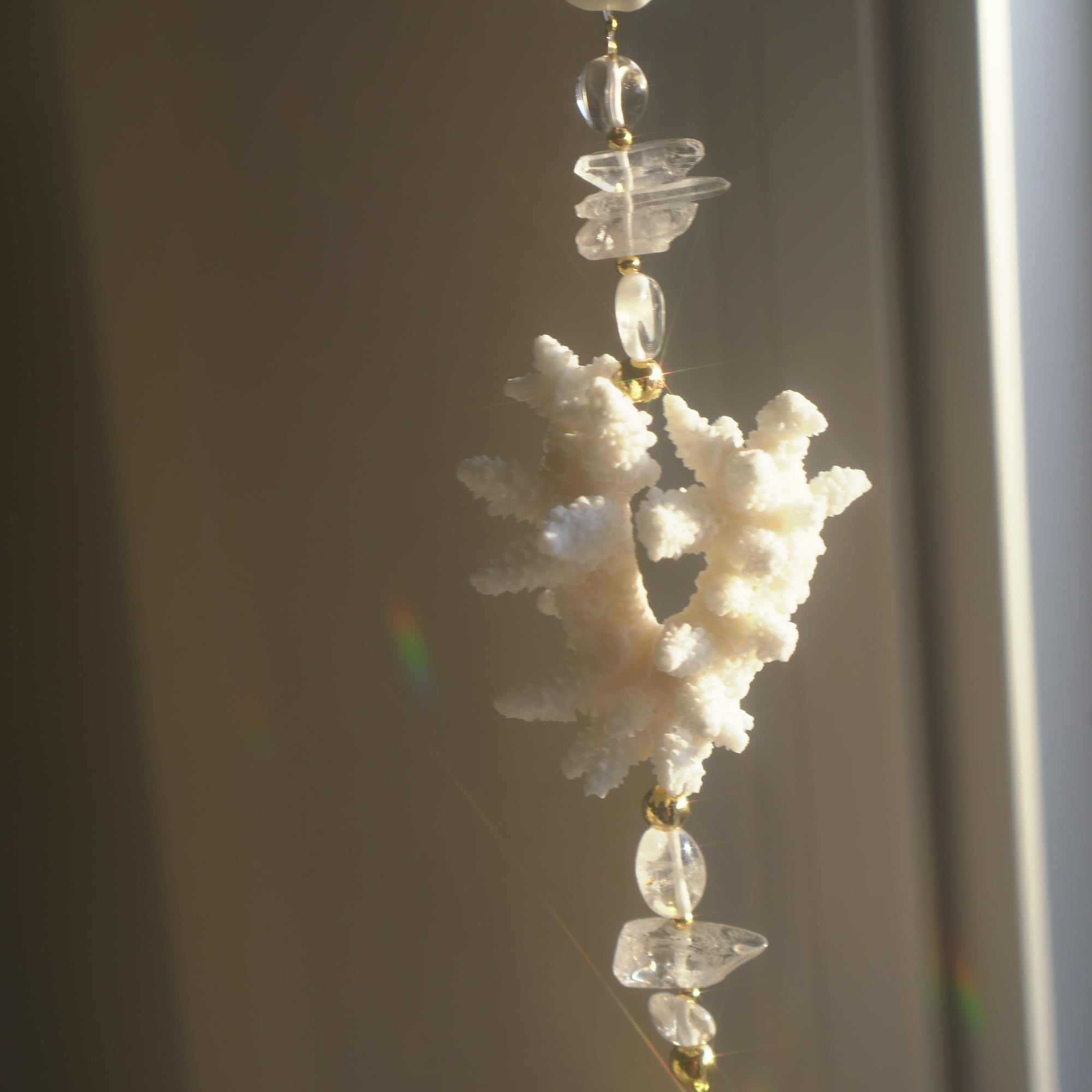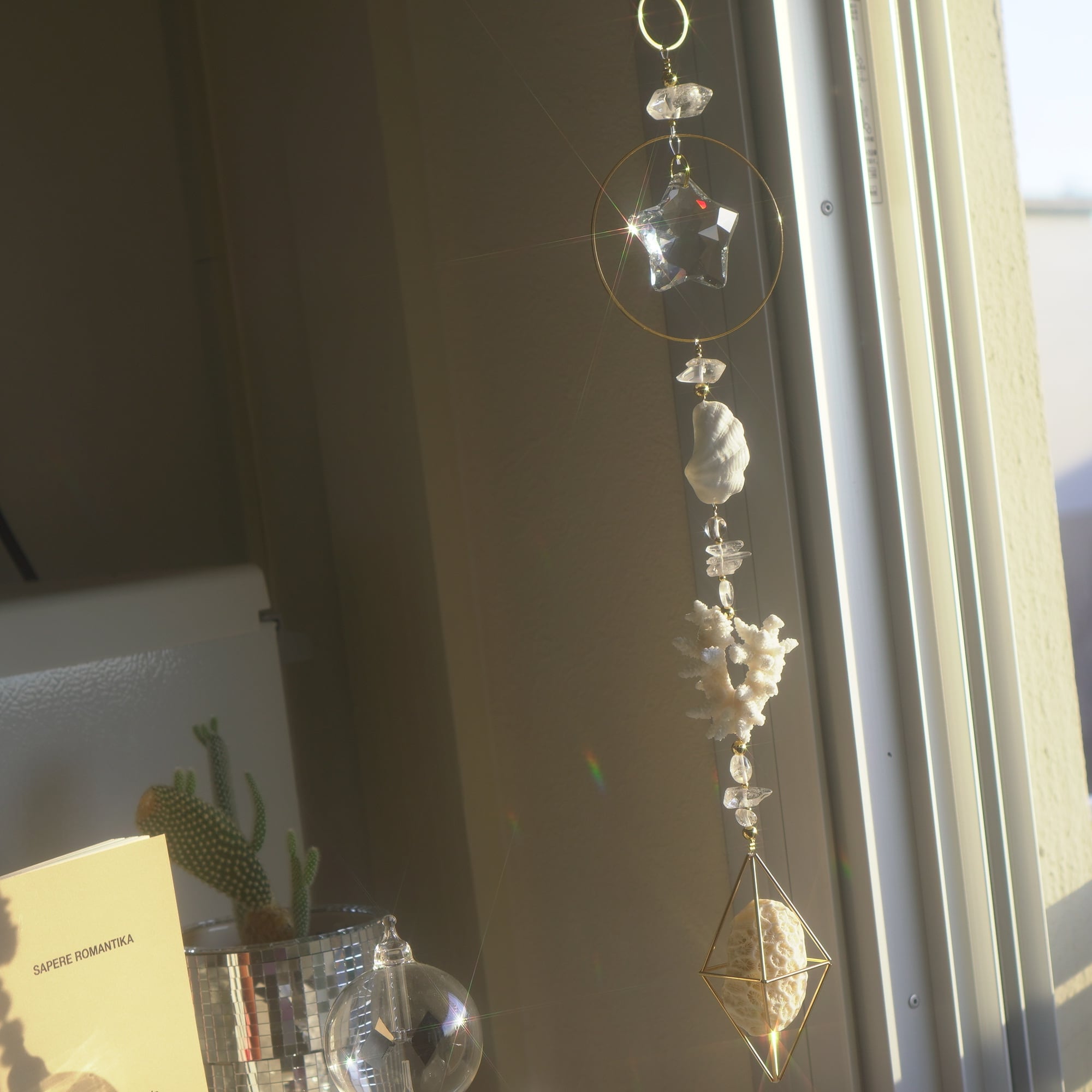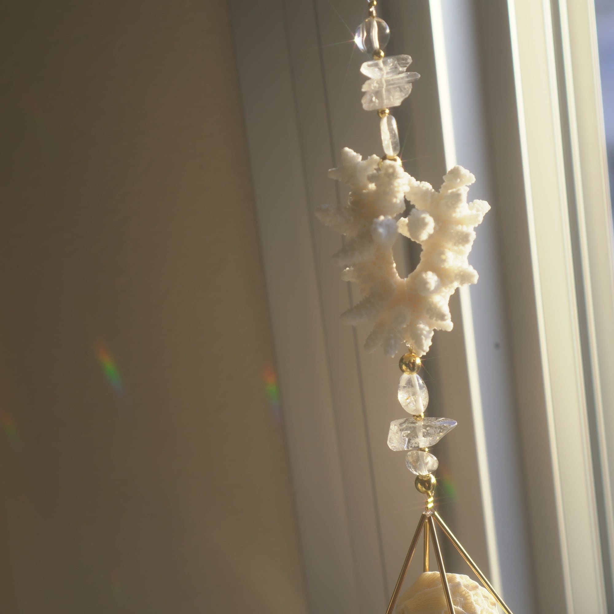 こちらは白化珊瑚・キクメイシ・シャコガイの美しい欠片とサンキャッチャーガラスを合わせた光のオーナメント。