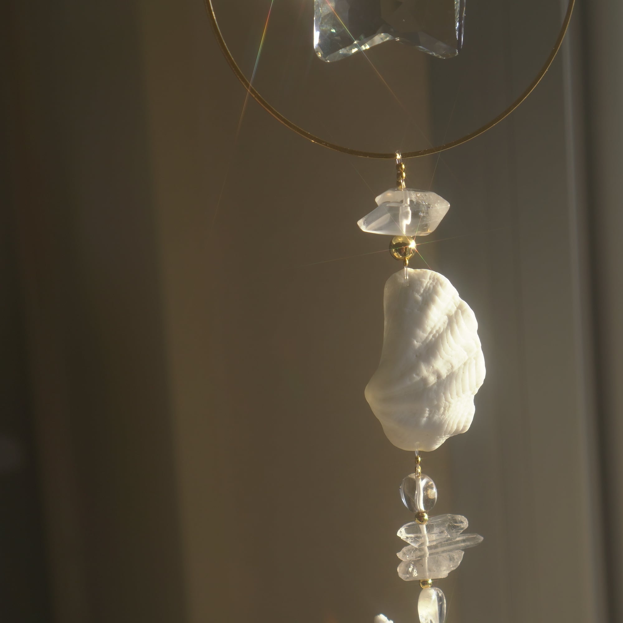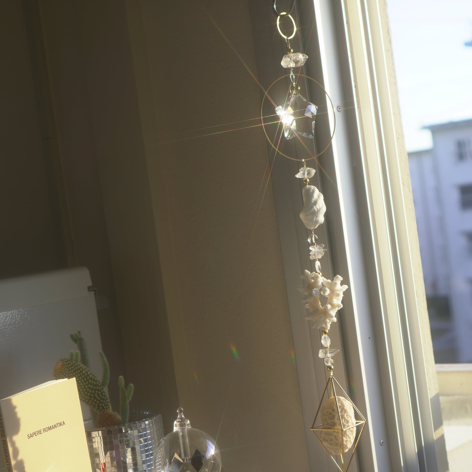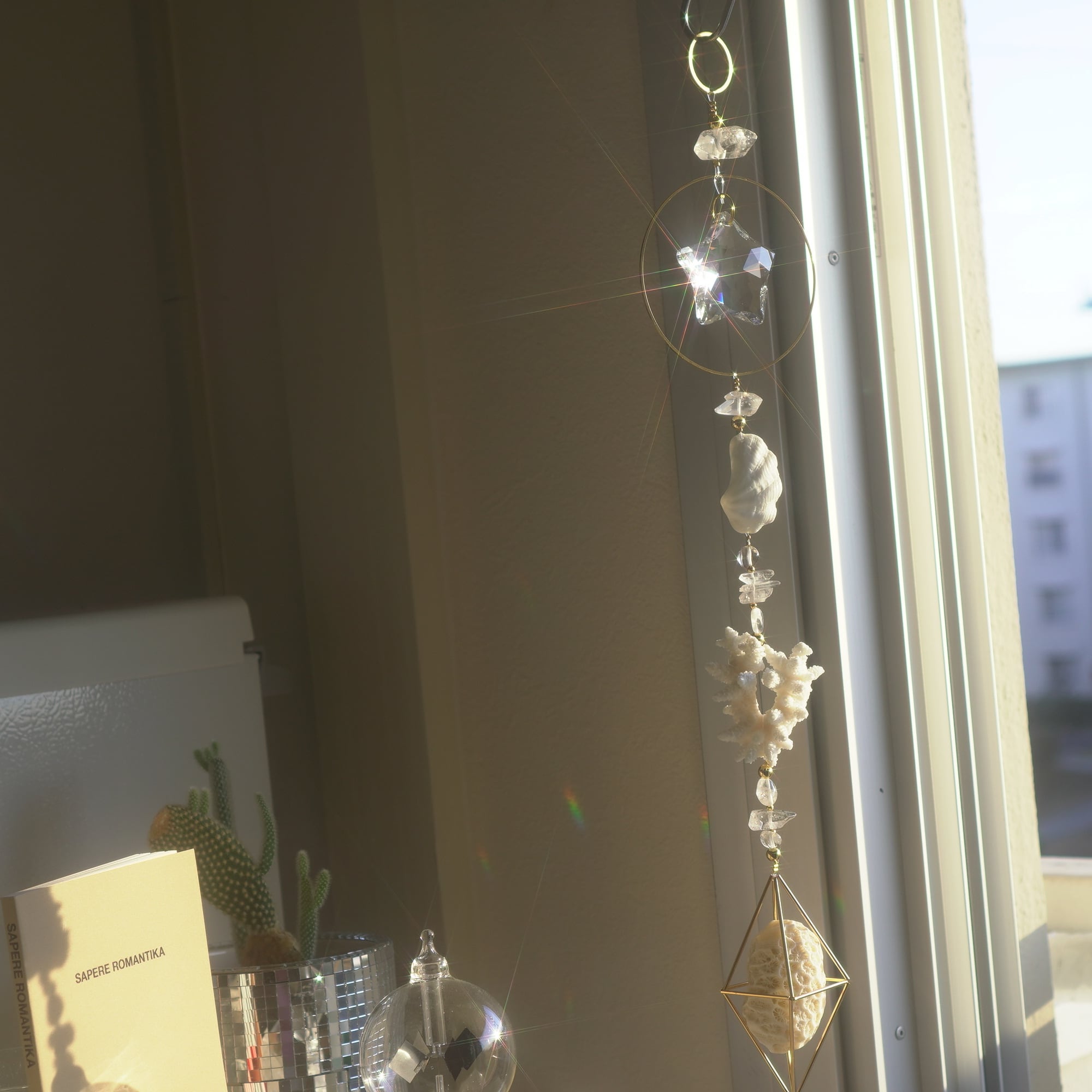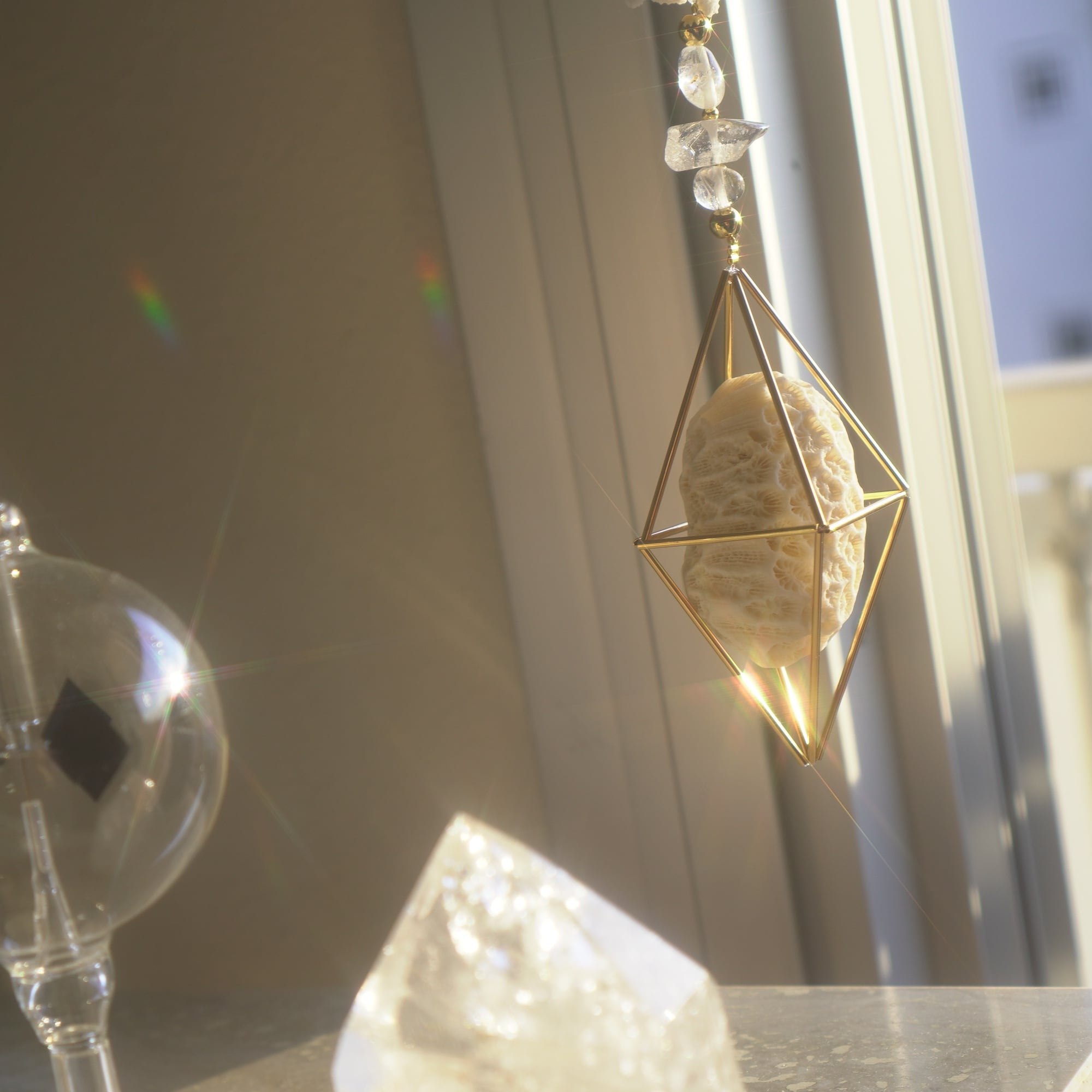 こちらは白化珊瑚・キクメイシ・シャコガイの美しい欠片とサンキャッチャーガラスを合わせた光のオーナメント。