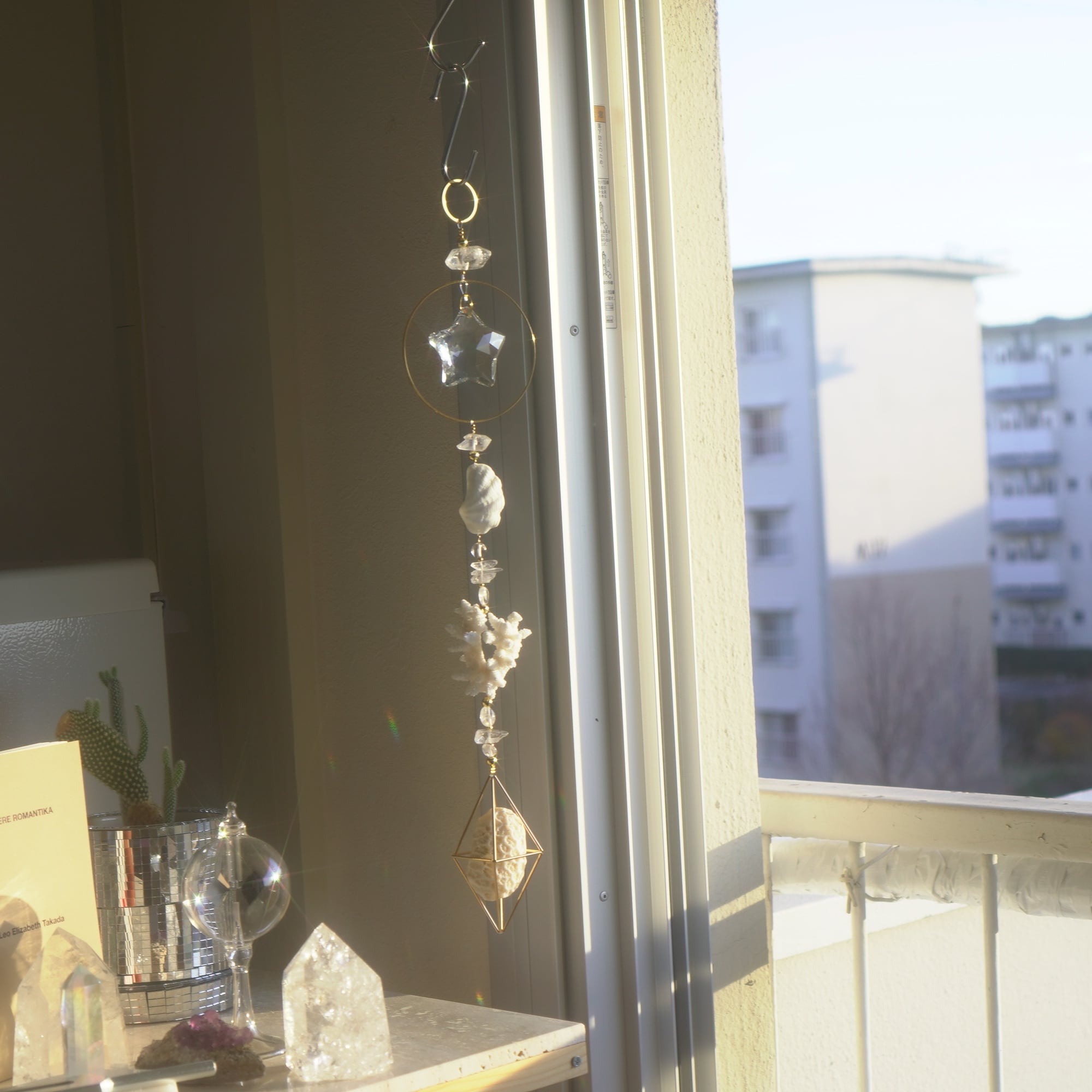 光を浴びるとピースの間を繋いでいる天然水晶やサンキャッチャーガラスと共にキラキラと輝き、お部屋にたくさんの光の粒が舞います。