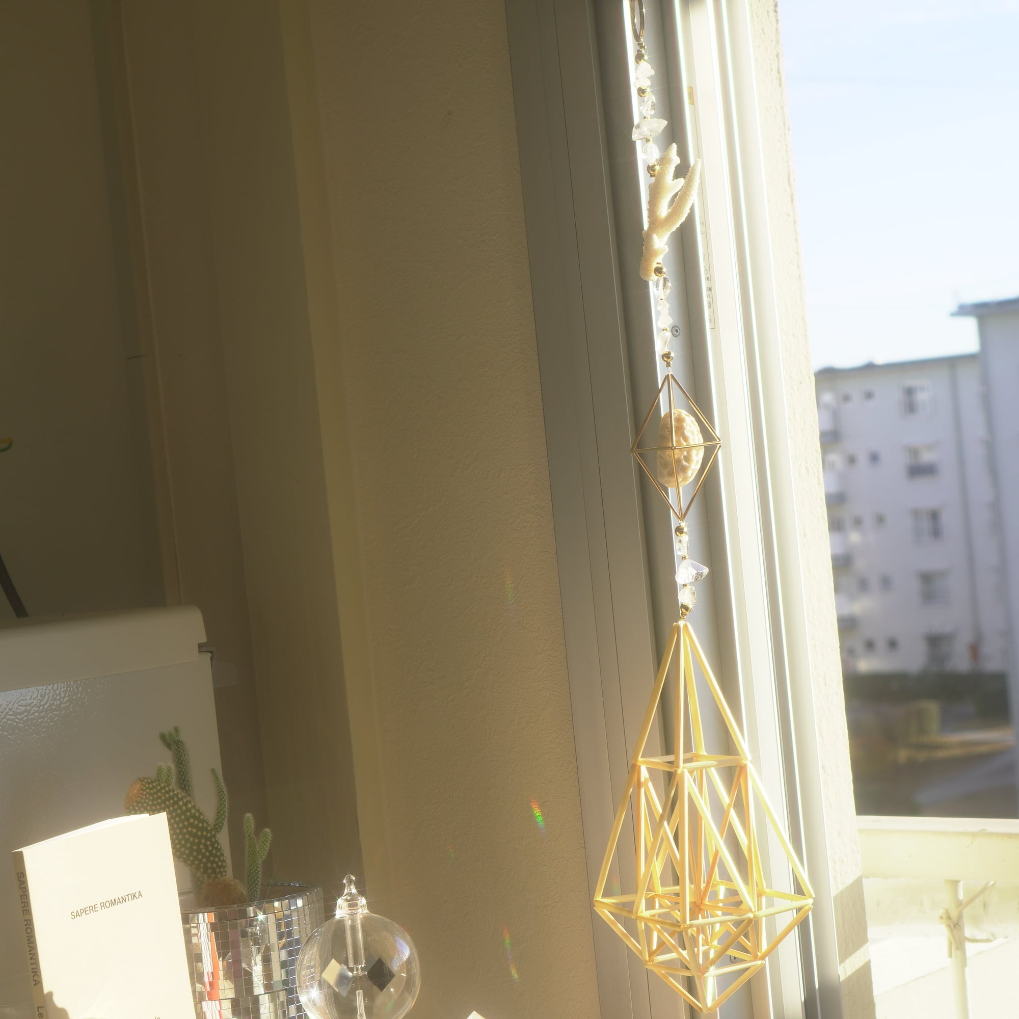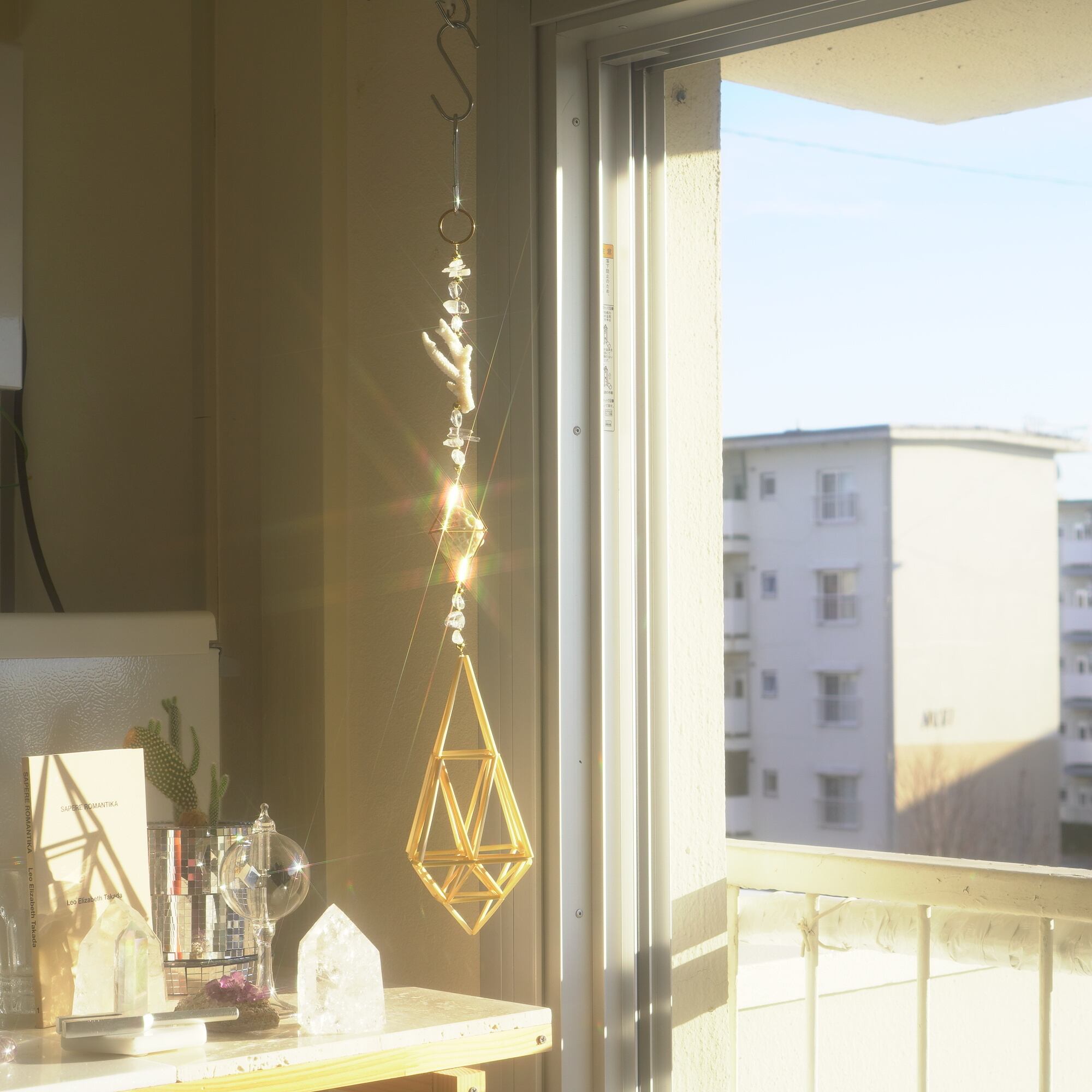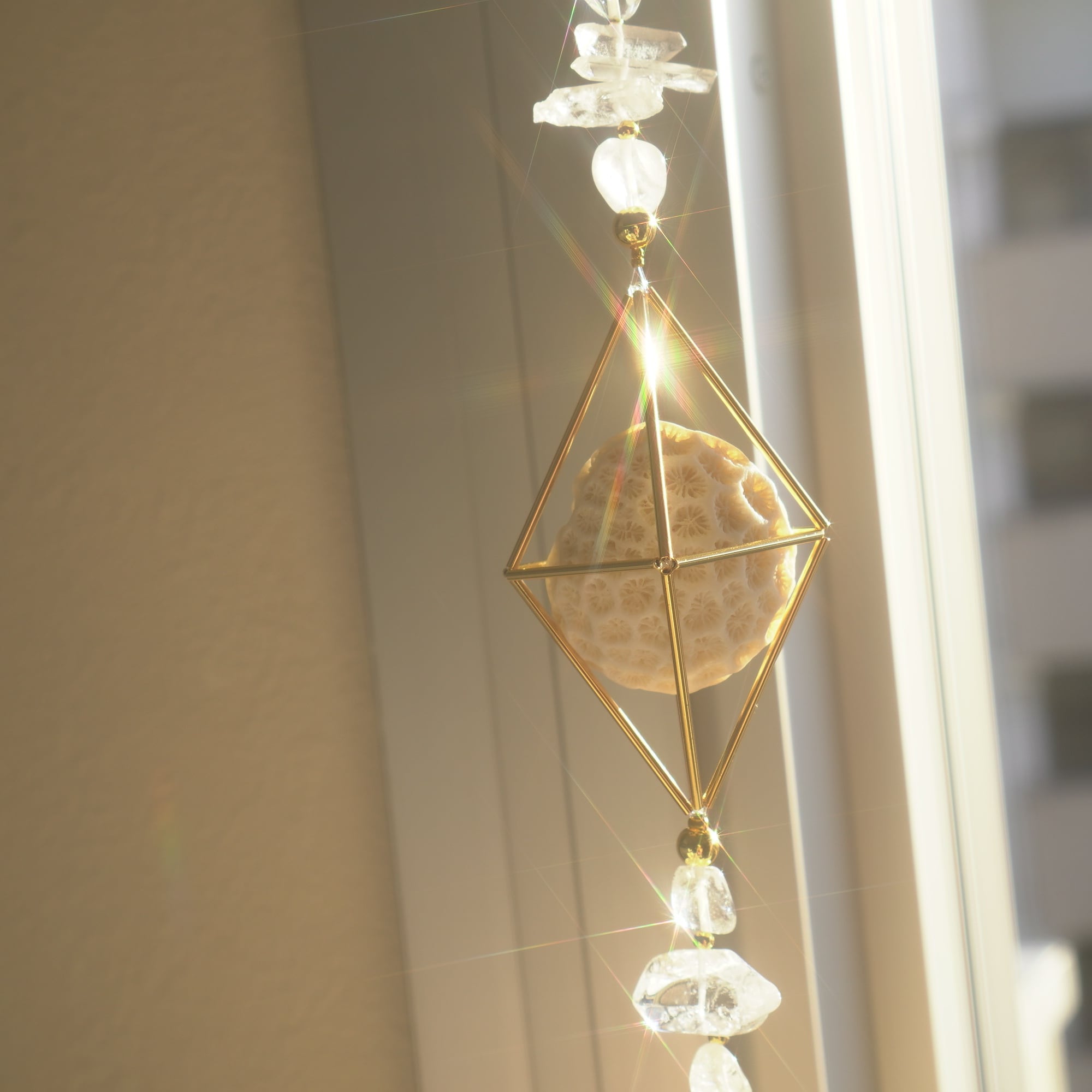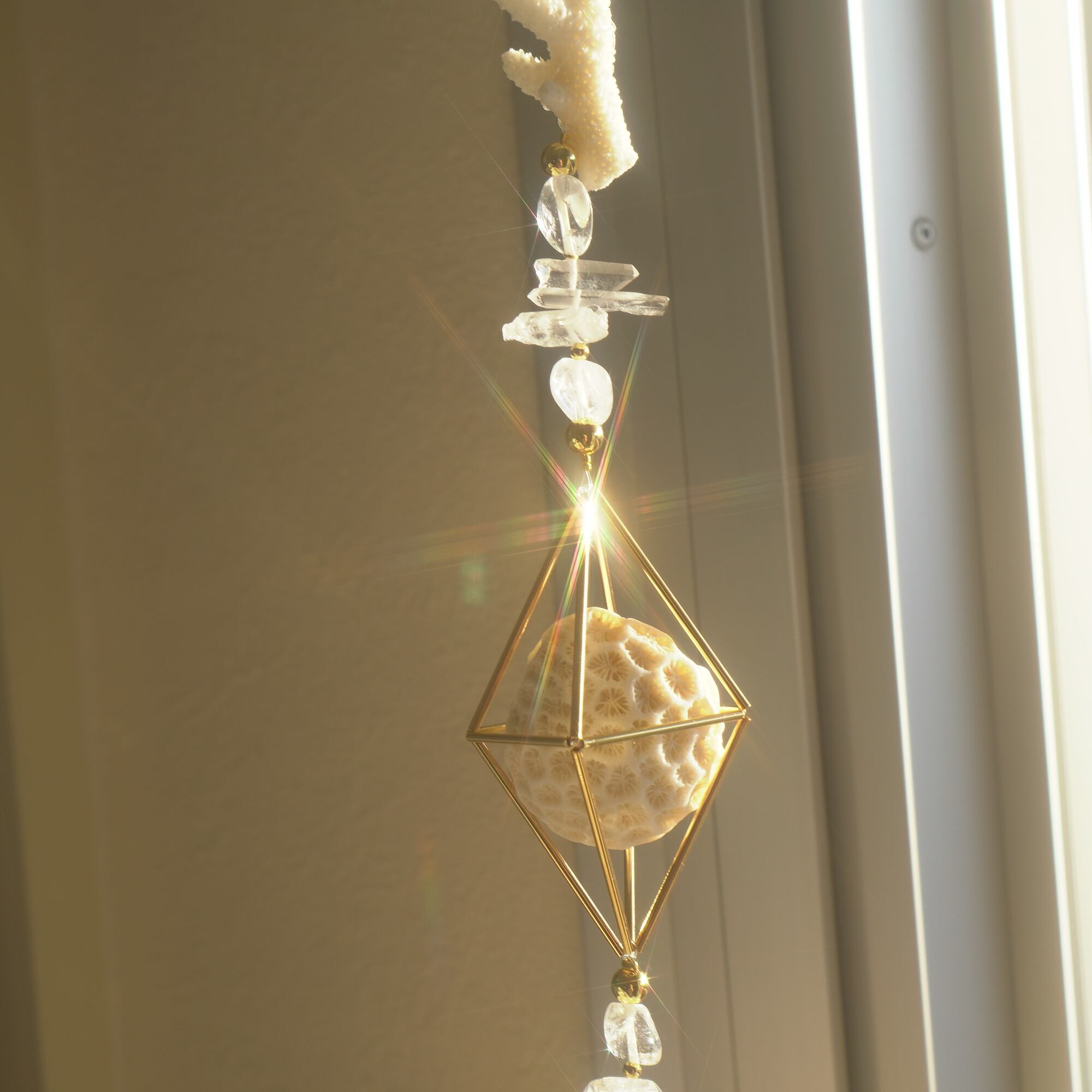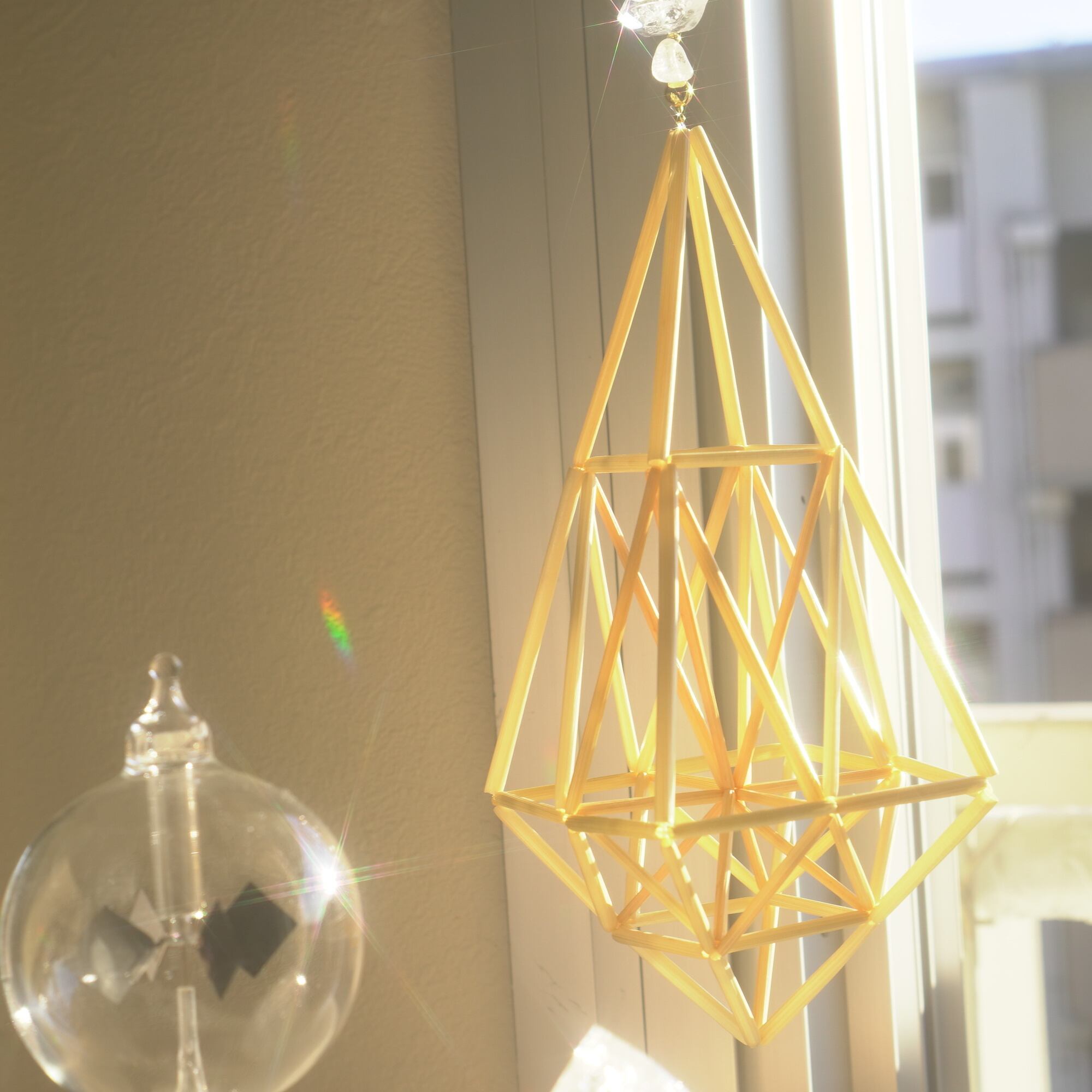 光を浴びるとピースの間を繋いでいる天然水晶や18Kゴールドメッキのビーズたちと共にキラキラと輝き、幾何学の中で光が錯綜するような麦わらヒンメリが軽い風に乗りフワフワと揺れ動きます。