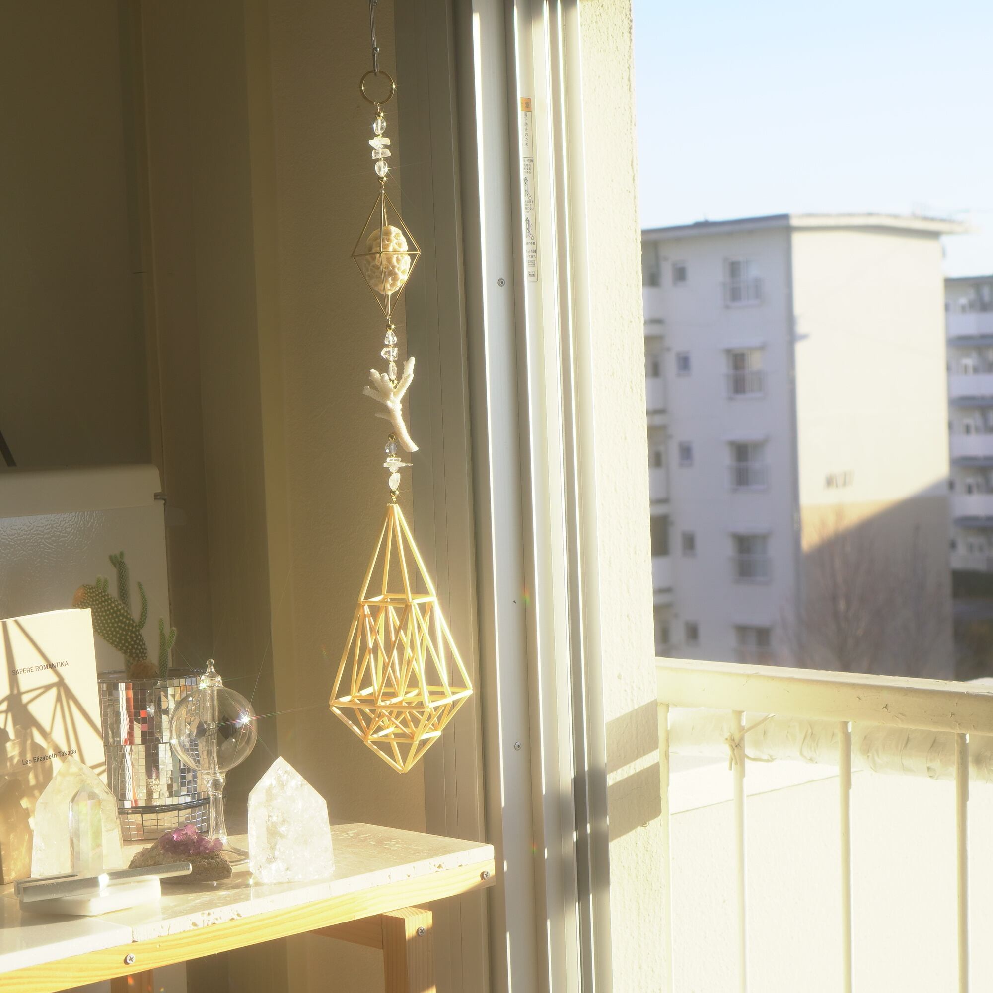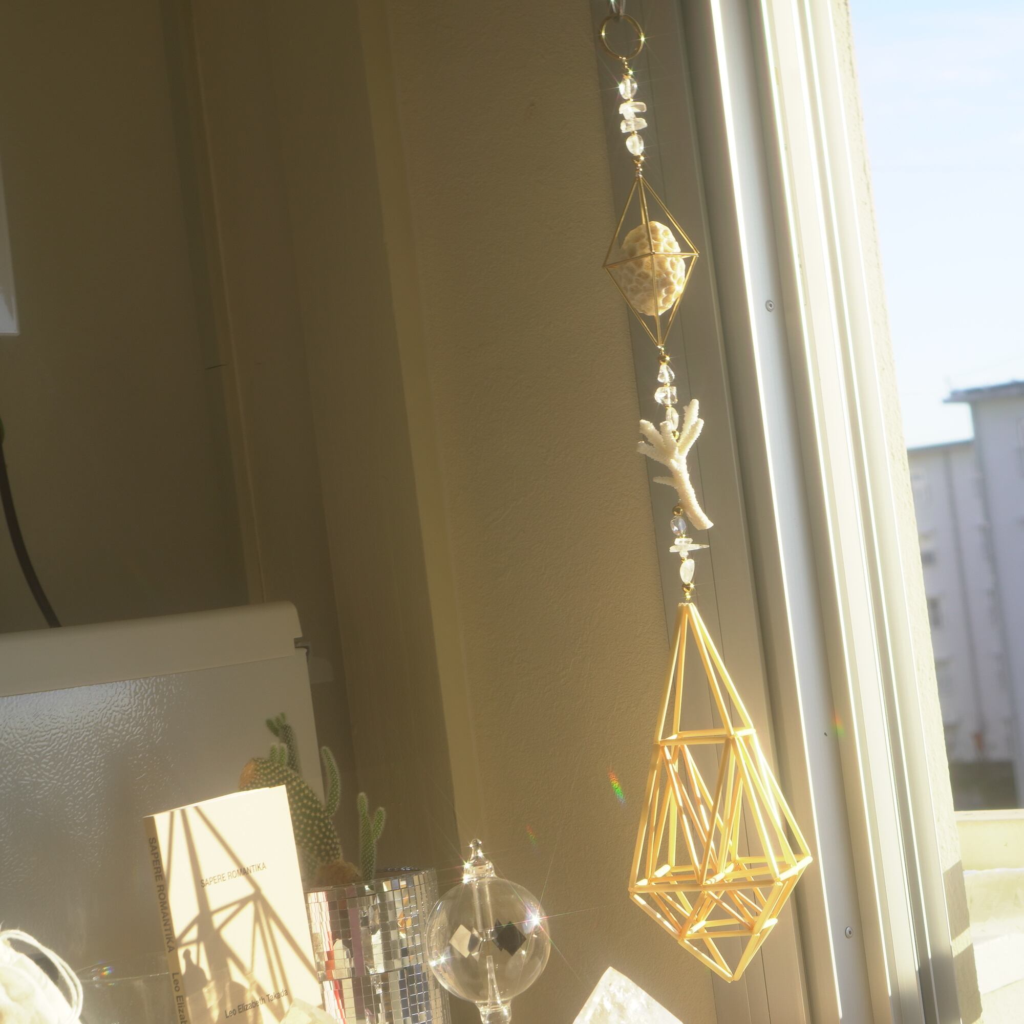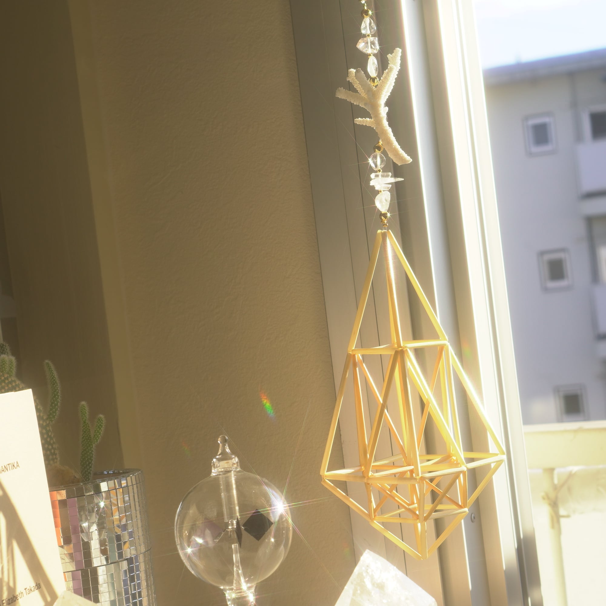光を浴びるとピースの間を繋いでいる天然水晶や18Kゴールドメッキのビーズたちと共にキラキラと輝き、幾何学の中で光が錯綜するような麦わらヒンメリが軽い風に乗りフワフワと揺れ動きます。