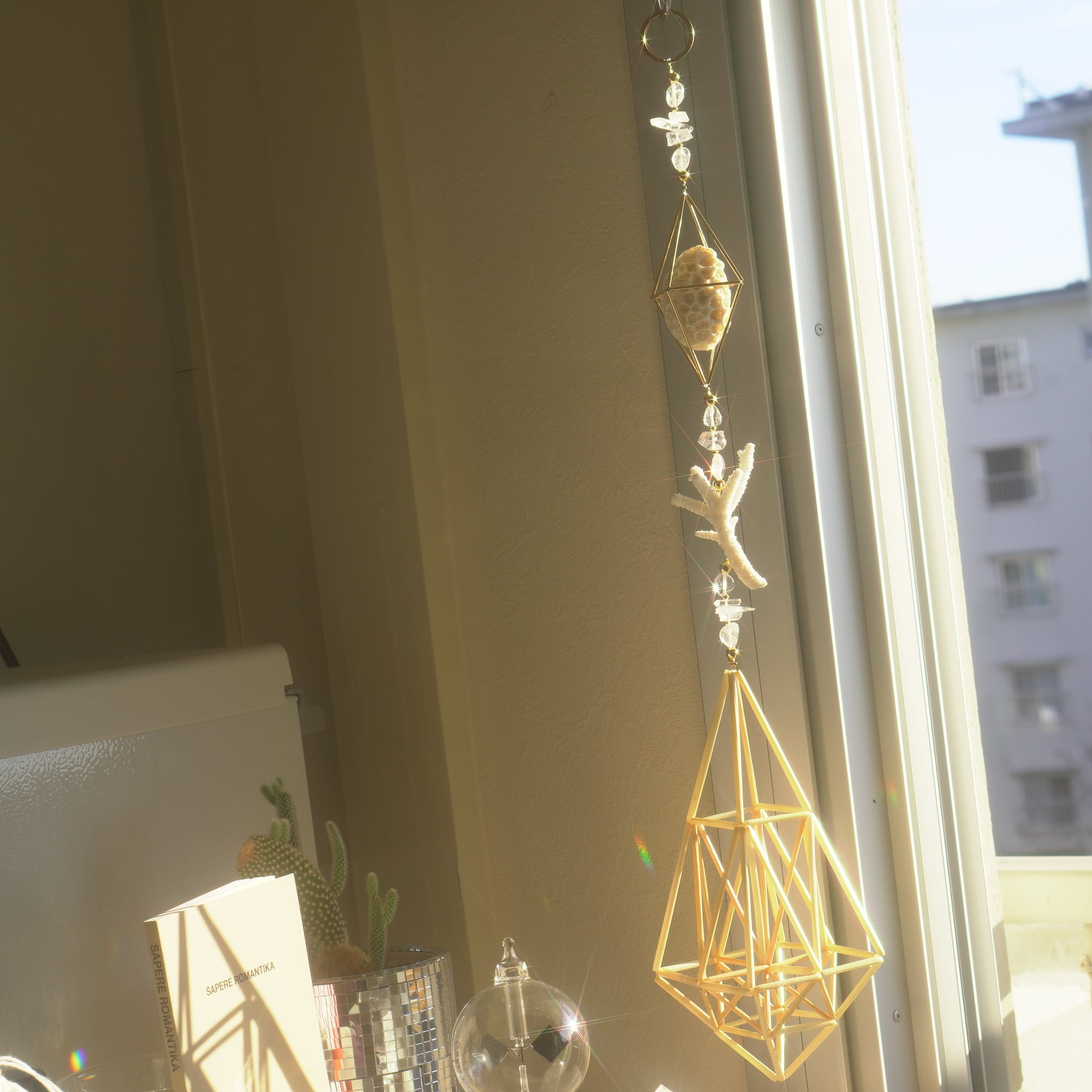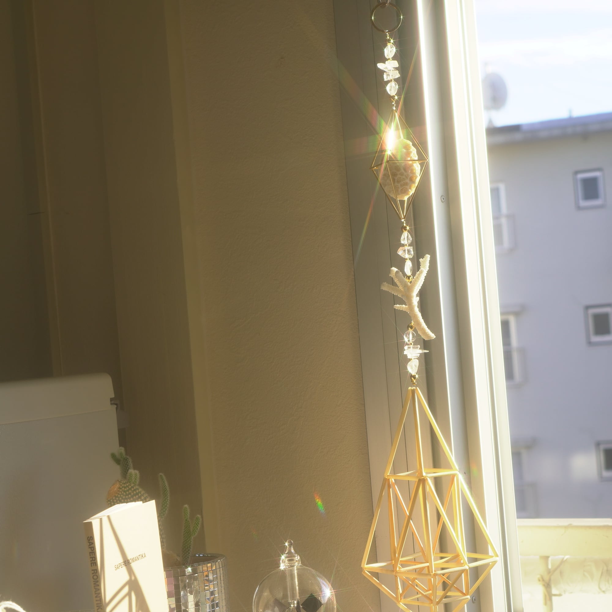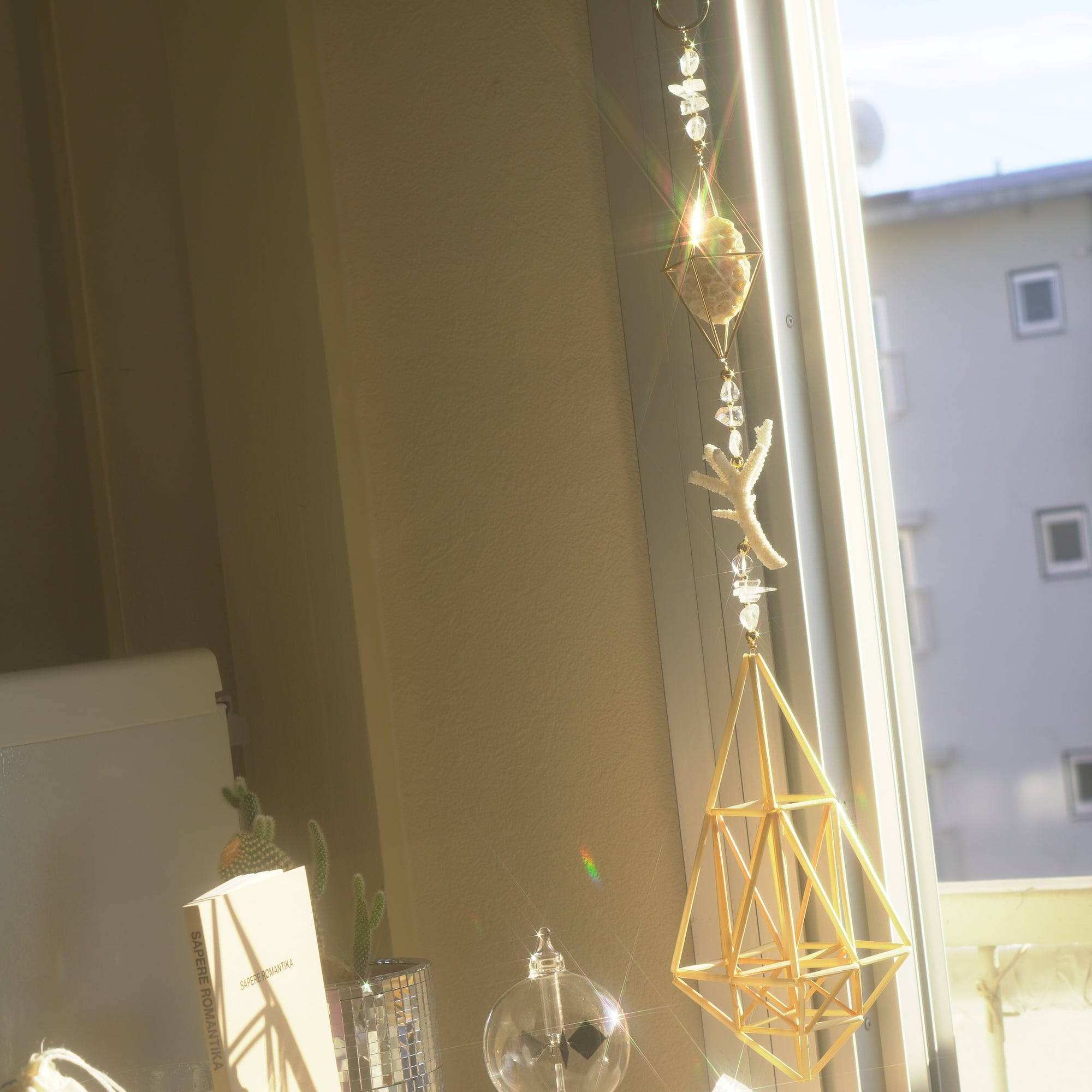 光を浴びるとピースの間を繋いでいる天然水晶や18Kゴールドメッキのビーズたちと共にキラキラと輝き、幾何学の中で光が錯綜するような麦わらヒンメリが軽い風に乗りフワフワと揺れ動きます。