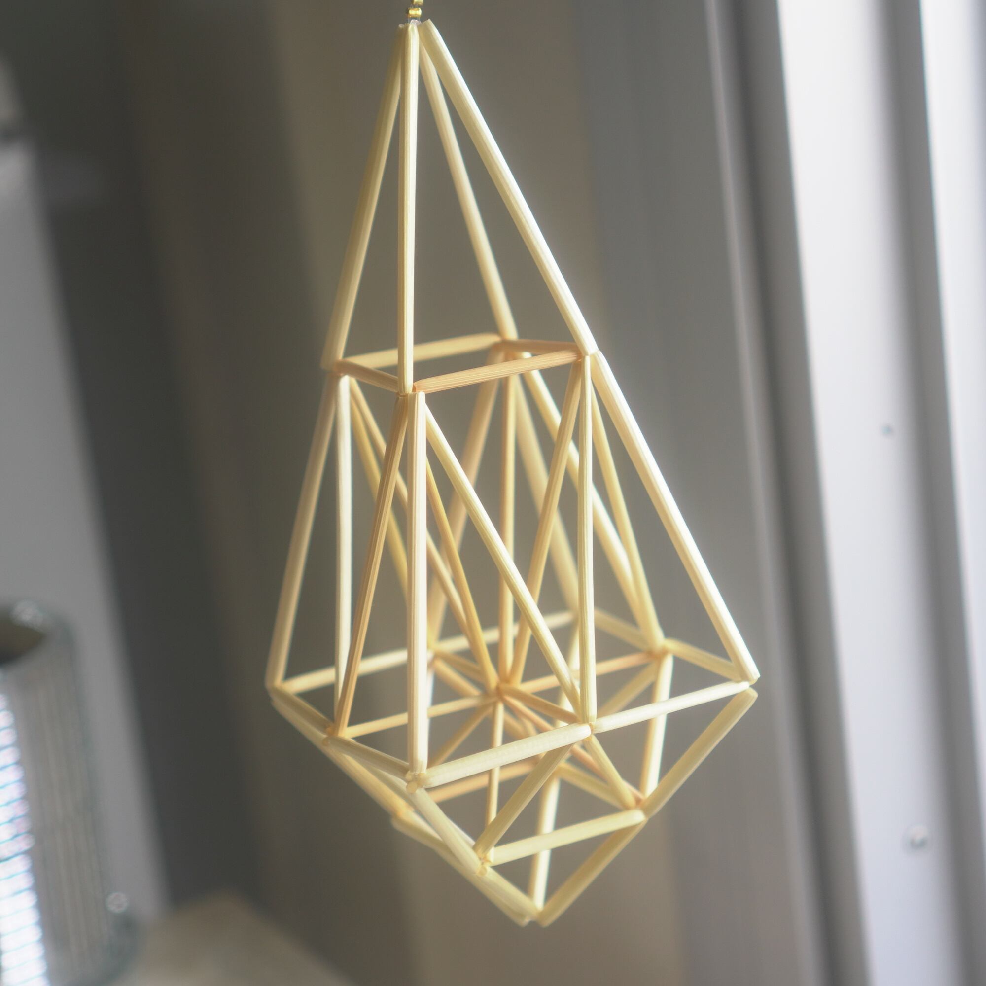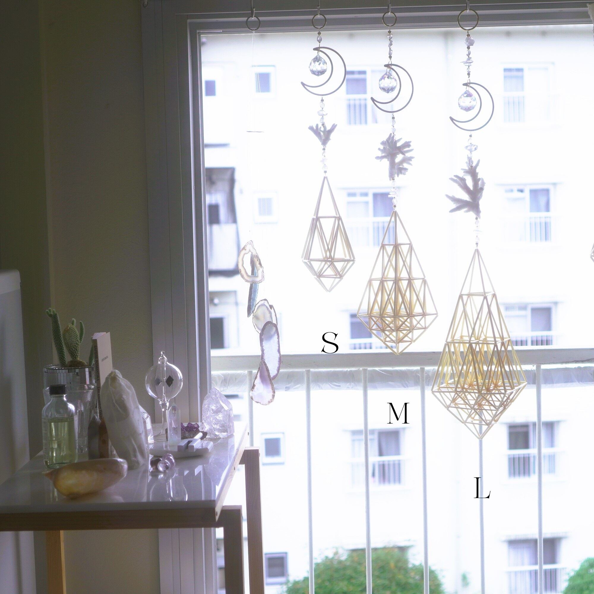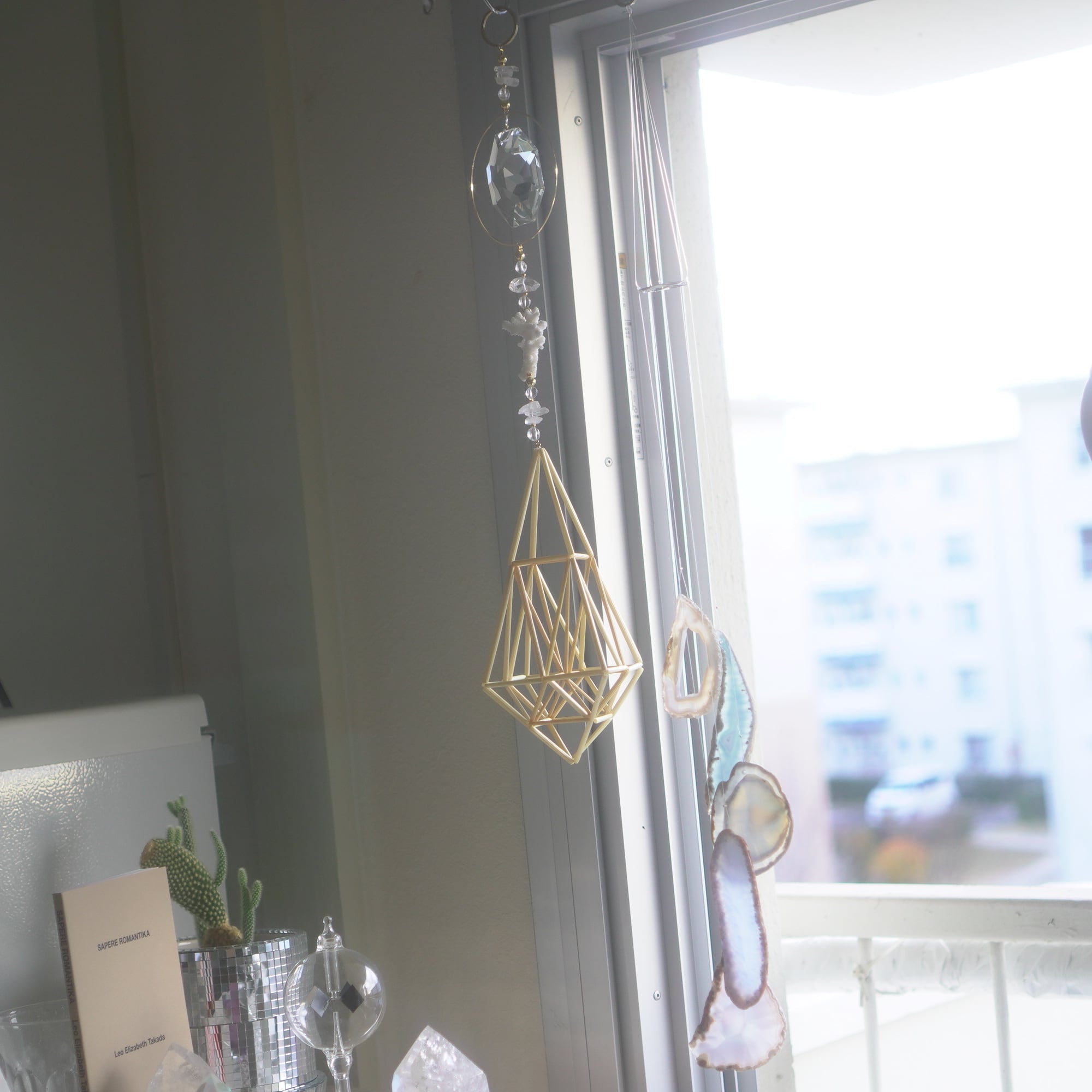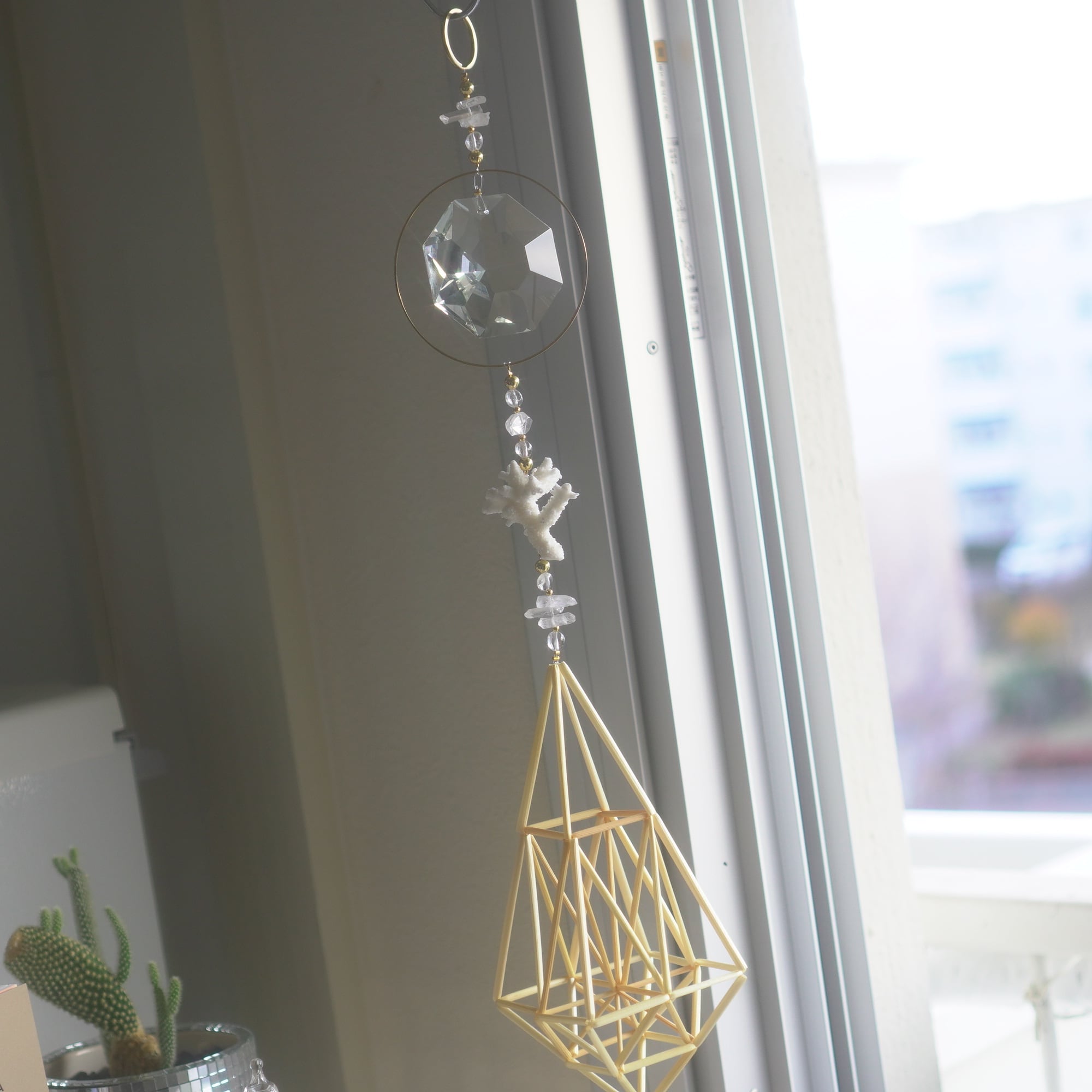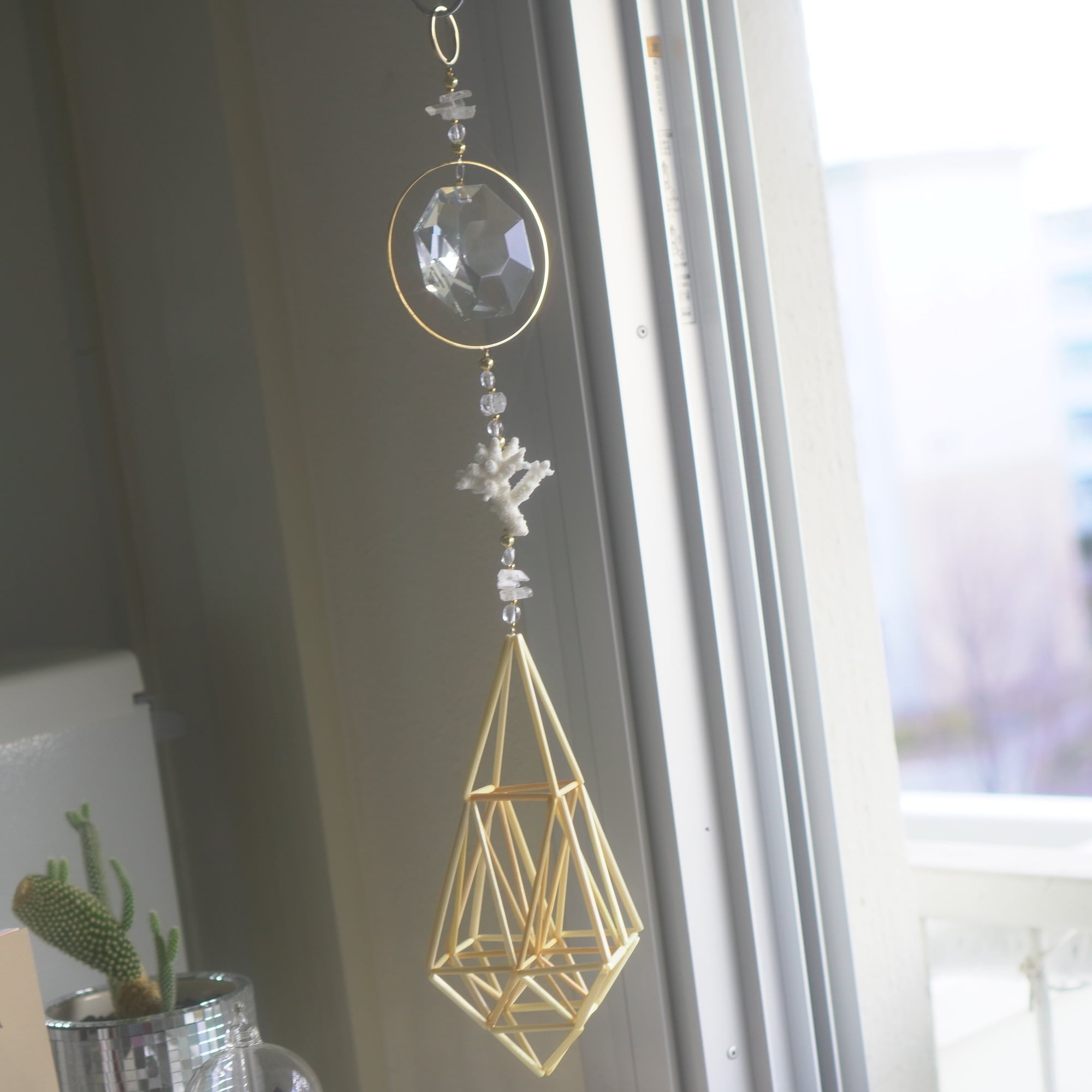 光を浴びるとピースの間を繋いでいる天然水晶や18Kゴールドメッキのビーズたちと共にキラキラと輝き、幾何学の中で光が錯綜するような麦わらヒンメリが軽い風に乗りフワフワと揺れ動きます。