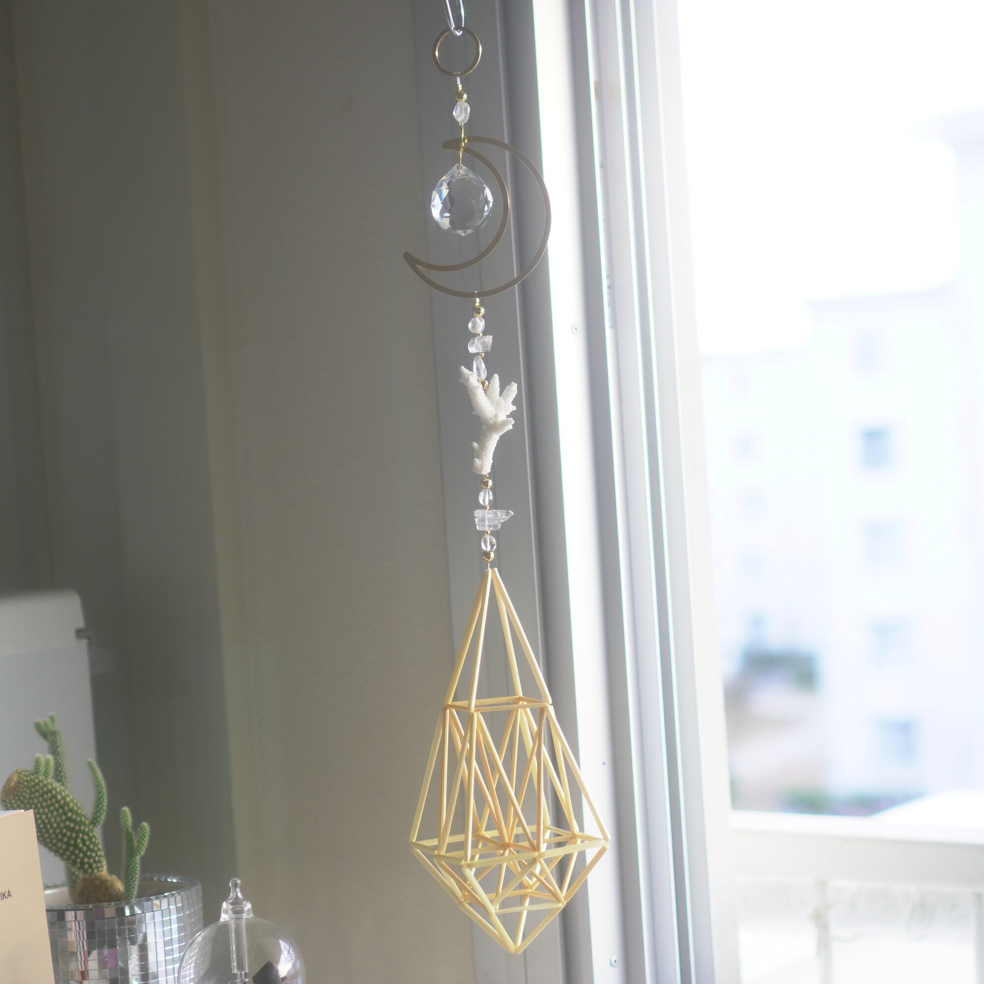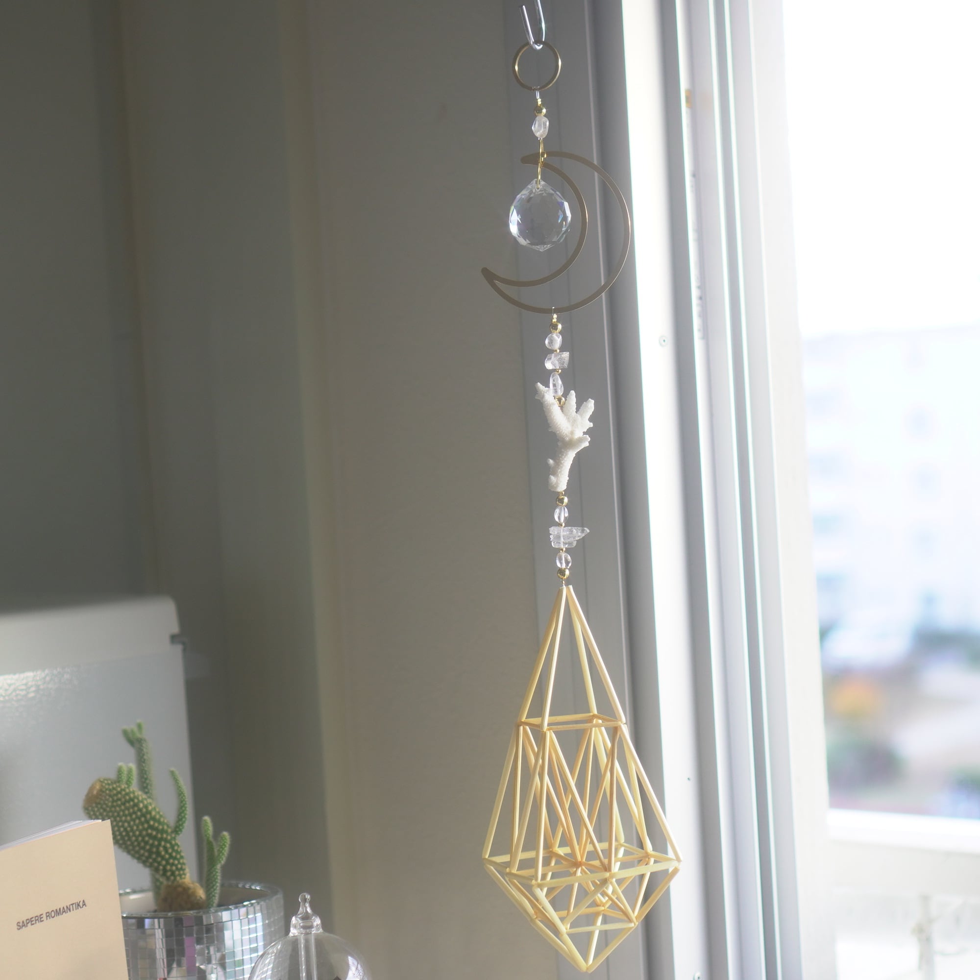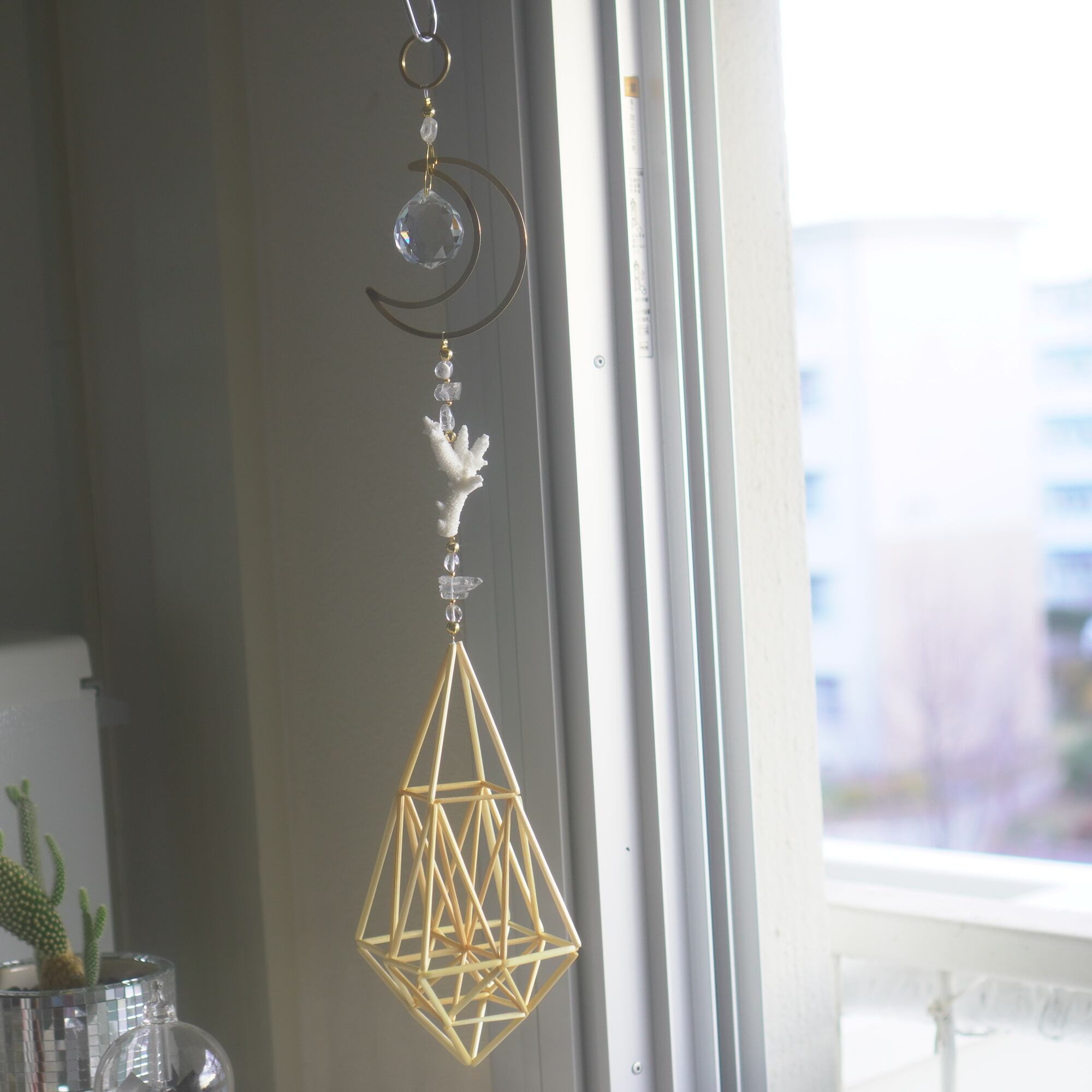 光を浴びるとピースの間を繋いでいる天然水晶や18Kゴールドメッキの月やビーズたちと共にキラキラと輝き、幾何学の中で光が錯綜するような麦わらヒンメリが軽い風に乗りフワフワと揺れ動きます。