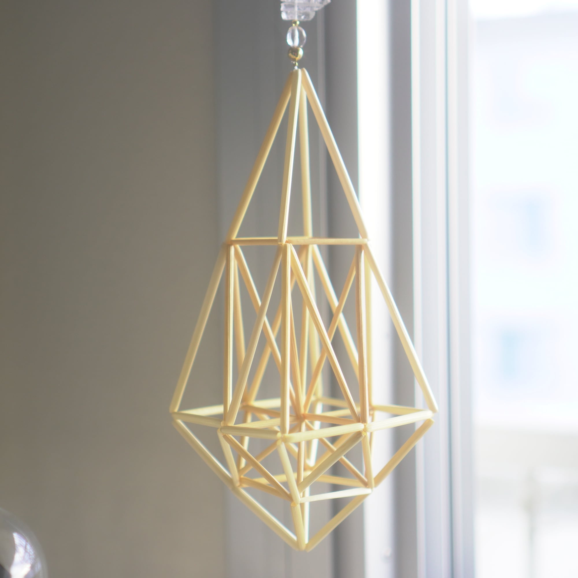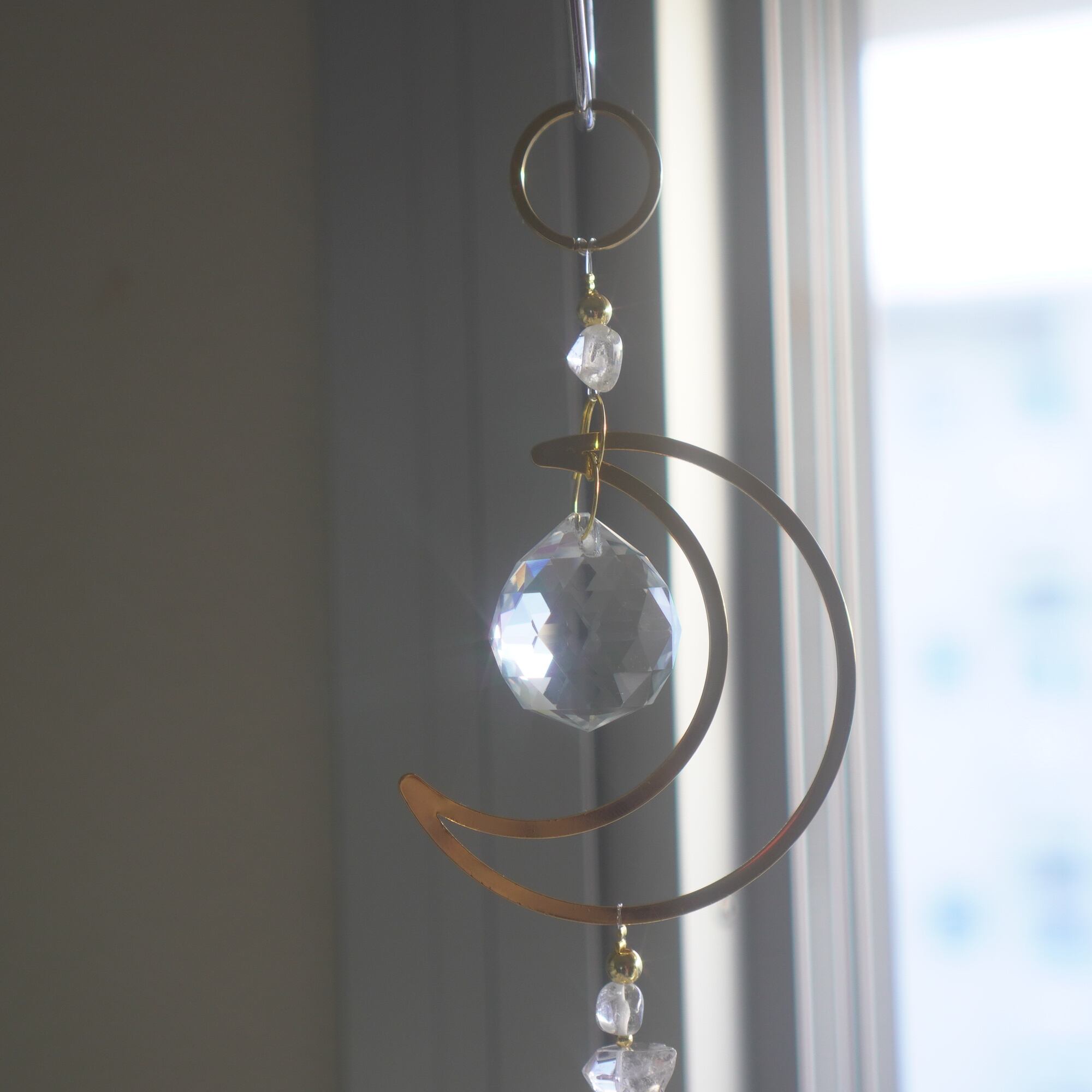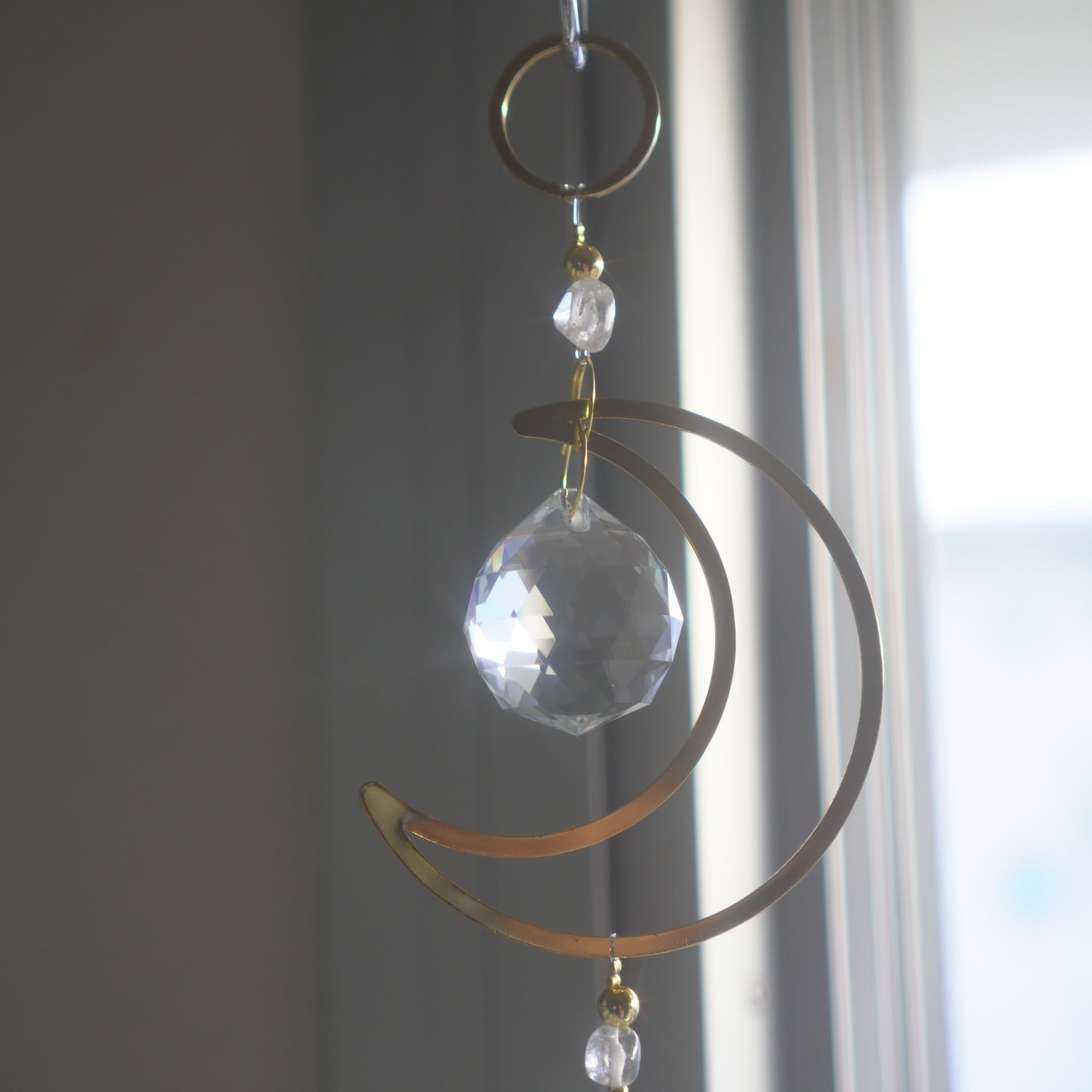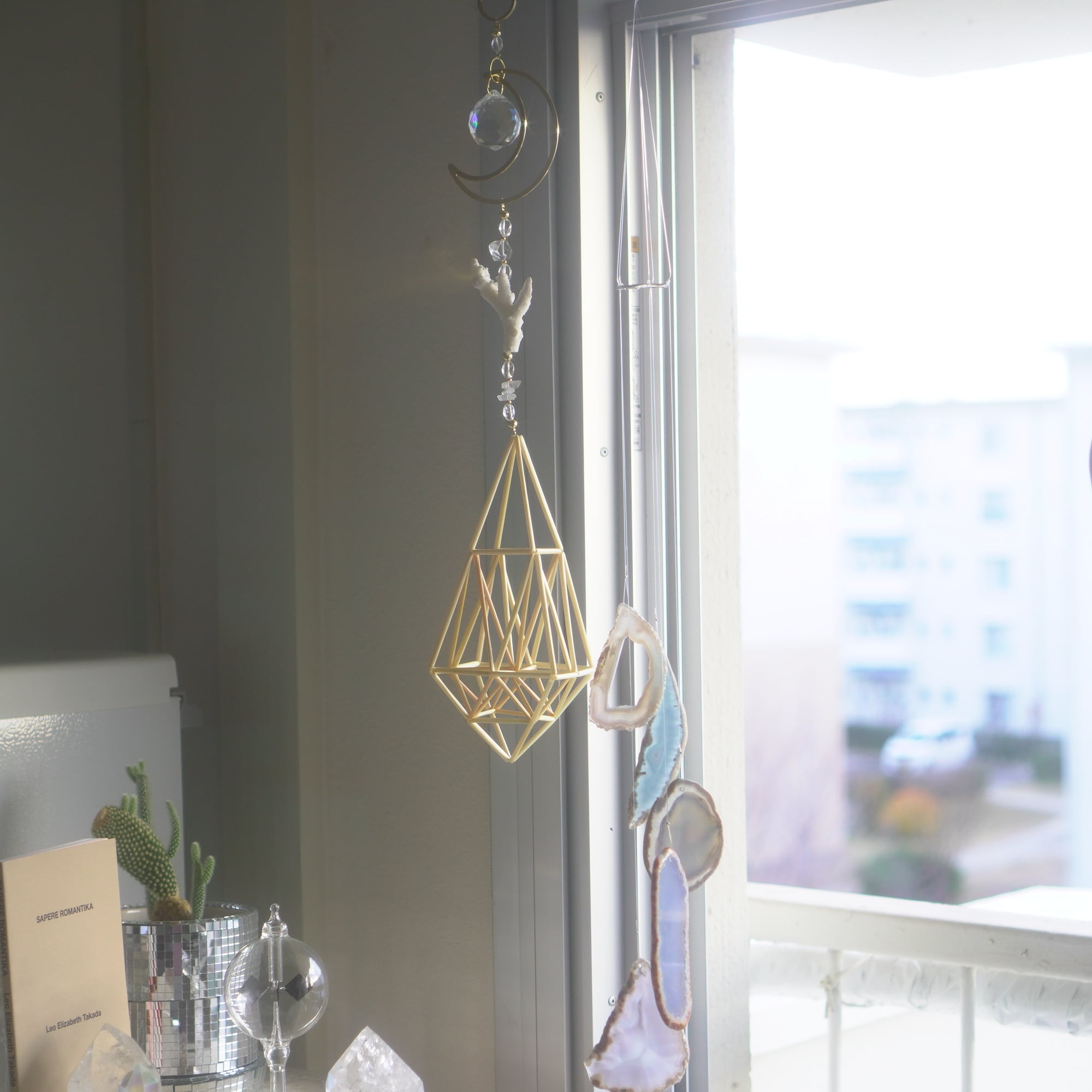 光を浴びるとピースの間を繋いでいる天然水晶や18Kゴールドメッキの月やビーズたちと共にキラキラと輝き、幾何学の中で光が錯綜するような麦わらヒンメリが軽い風に乗りフワフワと揺れ動きます。