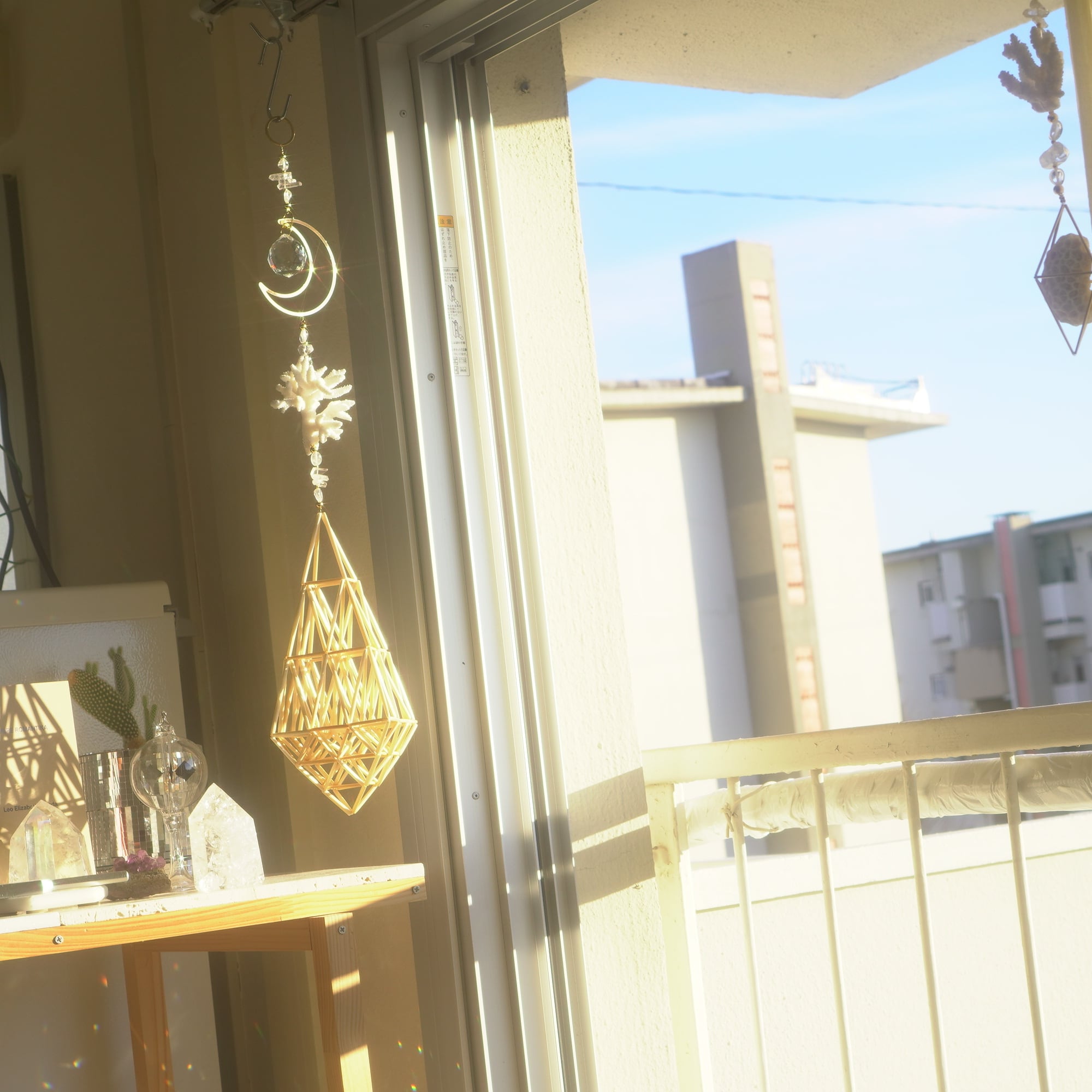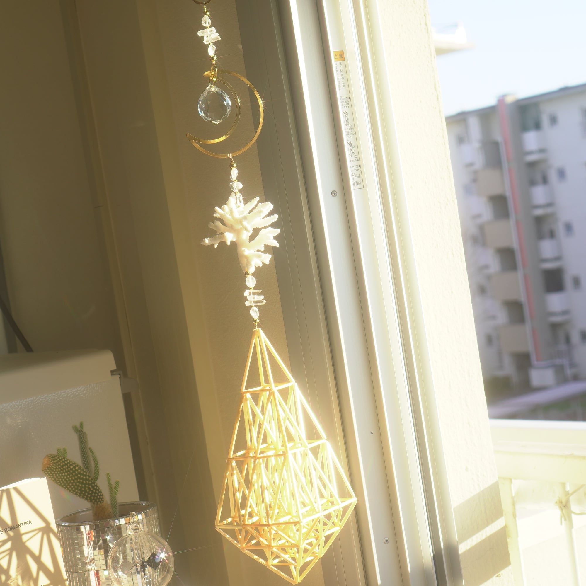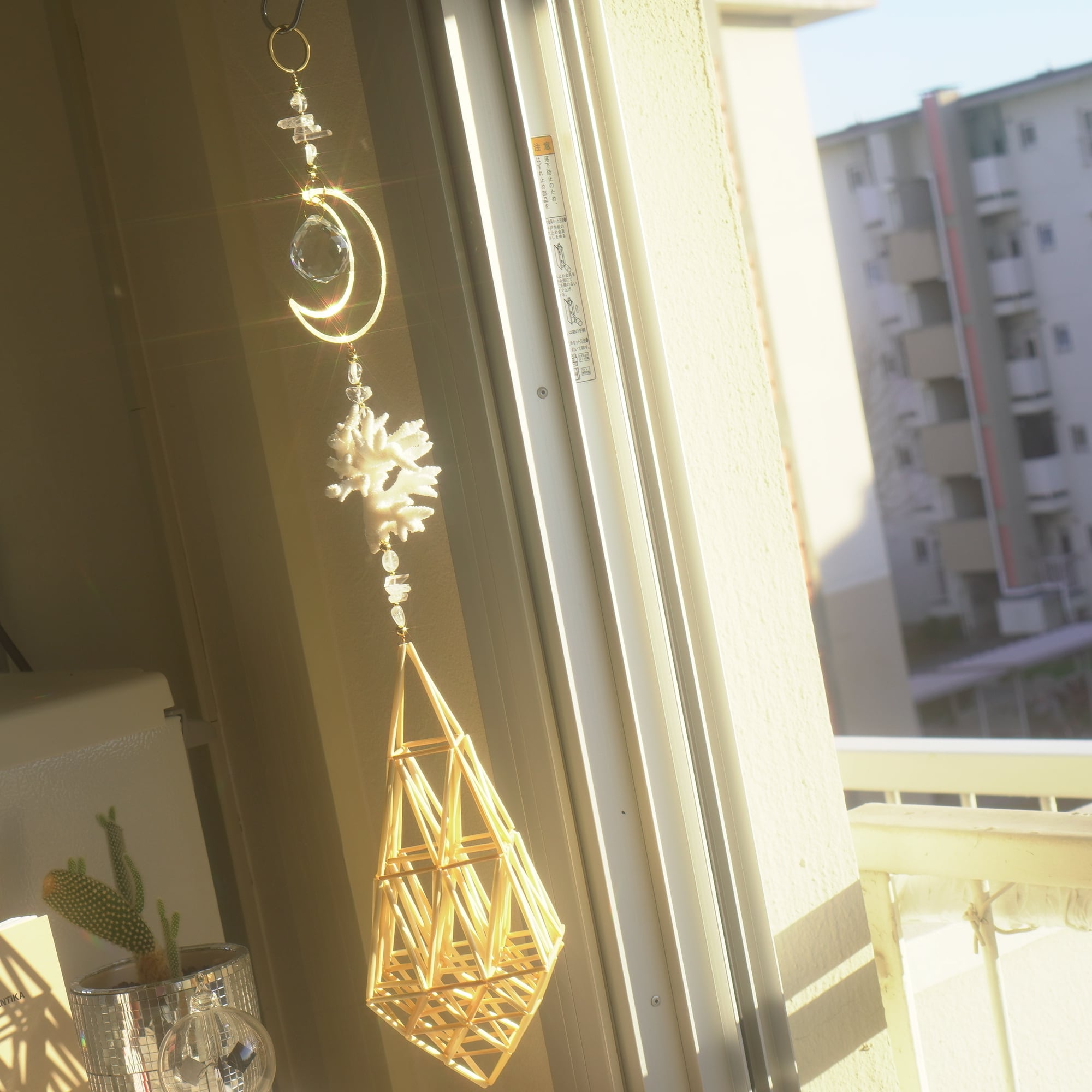 光を浴びるとピースの間を繋いでいる天然水晶や18Kゴールドメッキの月やビーズたちと共にキラキラと輝き、幾何学の中で光が錯綜するような麦わらヒンメリが軽い風に乗りフワフワと揺れ動きます。