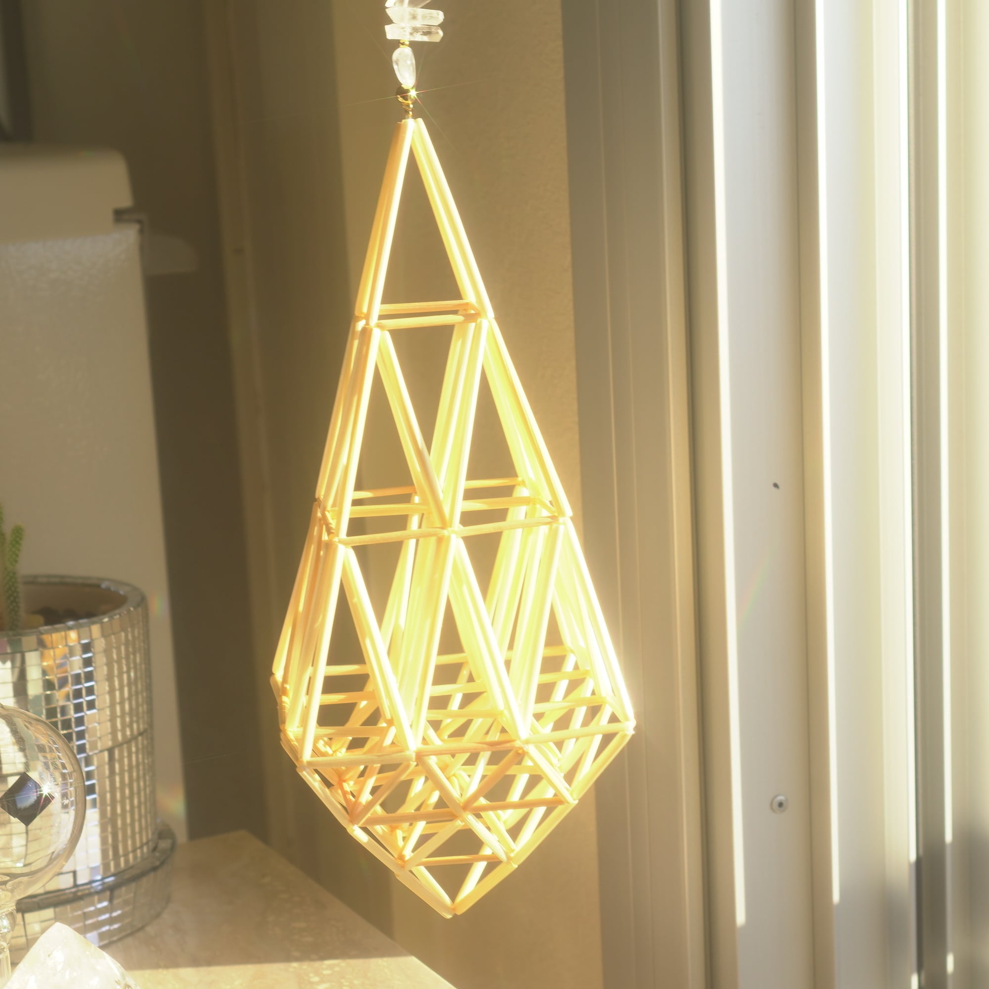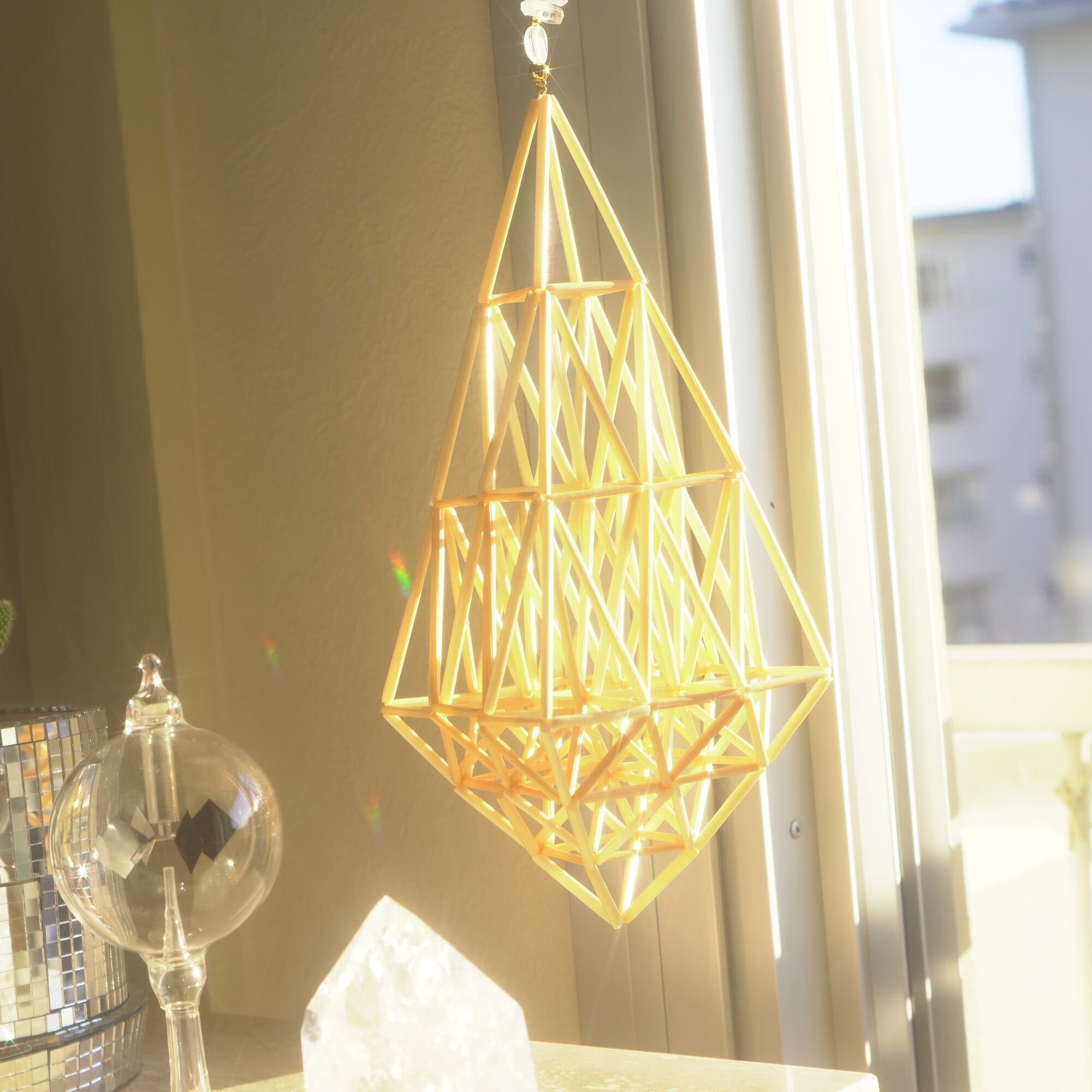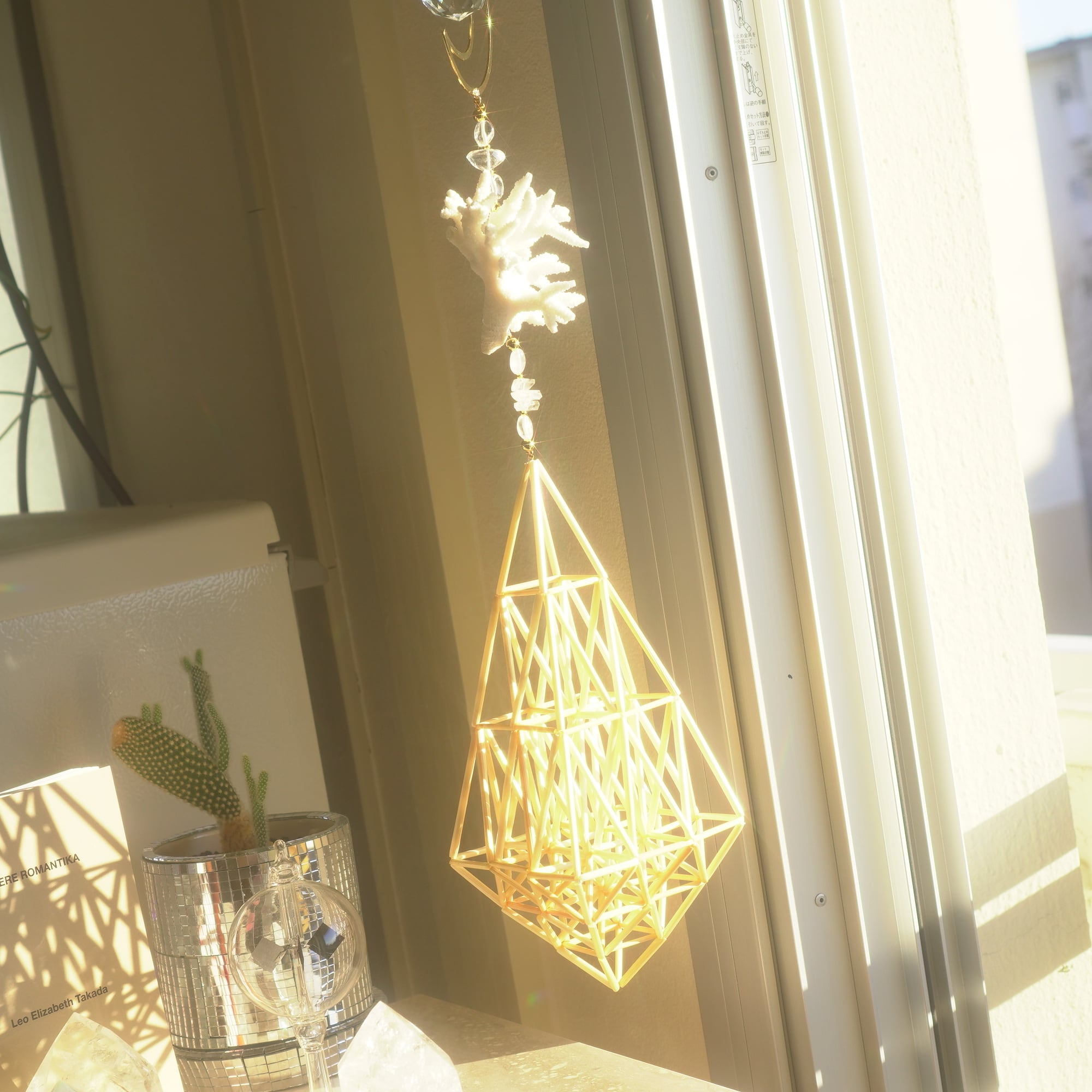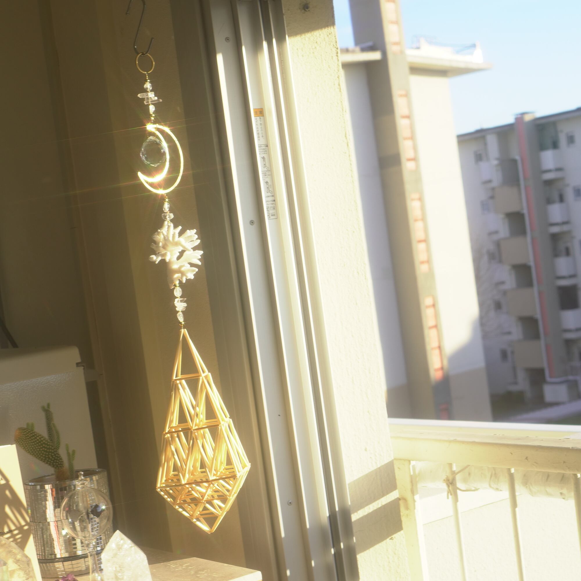 光を浴びるとピースの間を繋いでいる天然水晶や18Kゴールドメッキの月やビーズたちと共にキラキラと輝き、幾何学の中で光が錯綜するような麦わらヒンメリが軽い風に乗りフワフワと揺れ動きます。