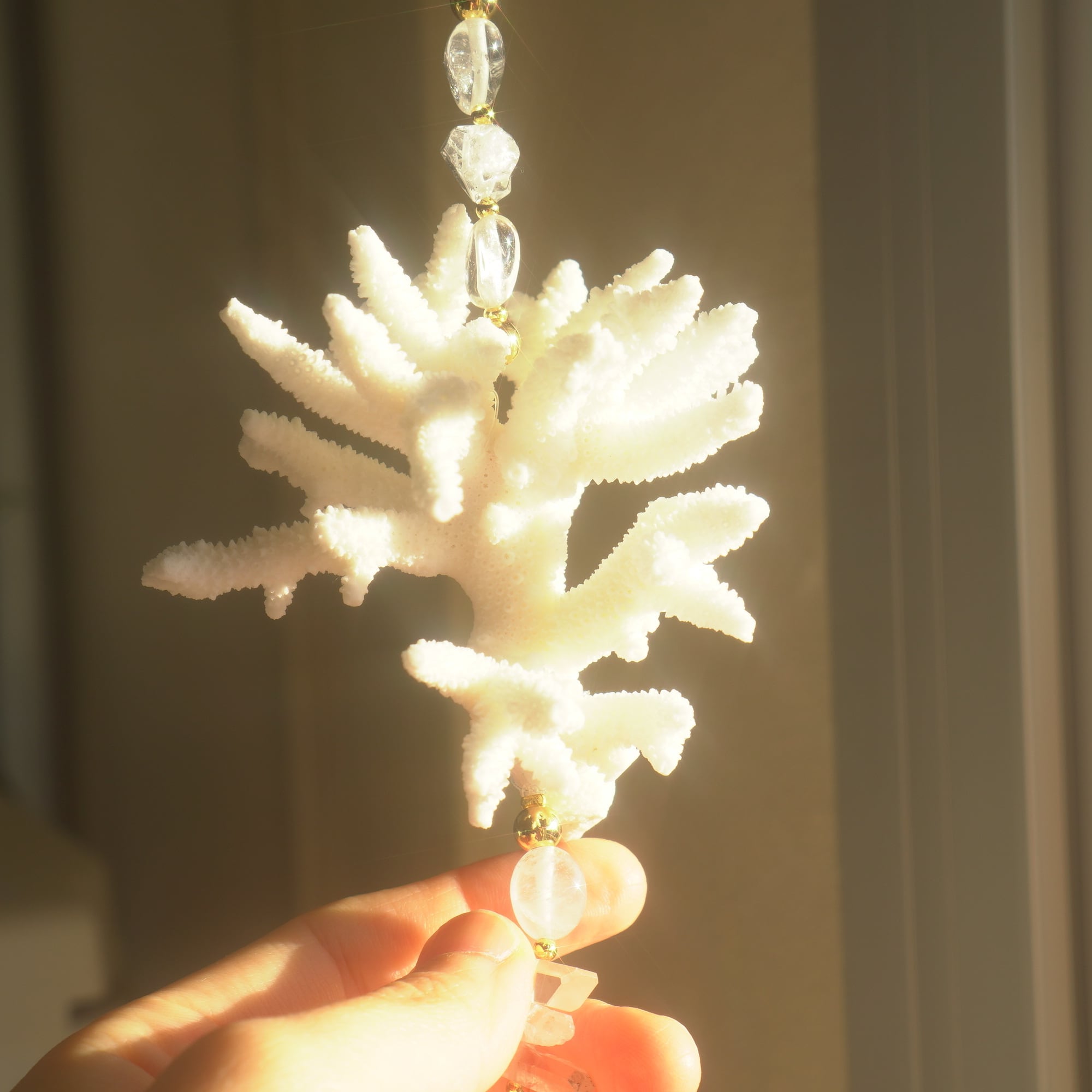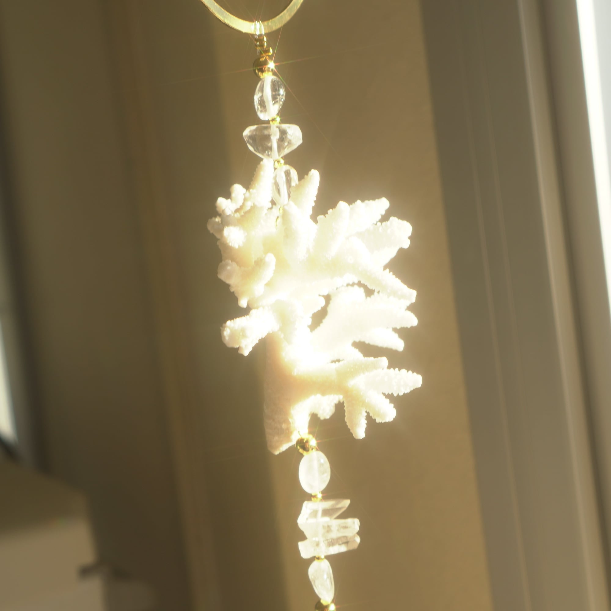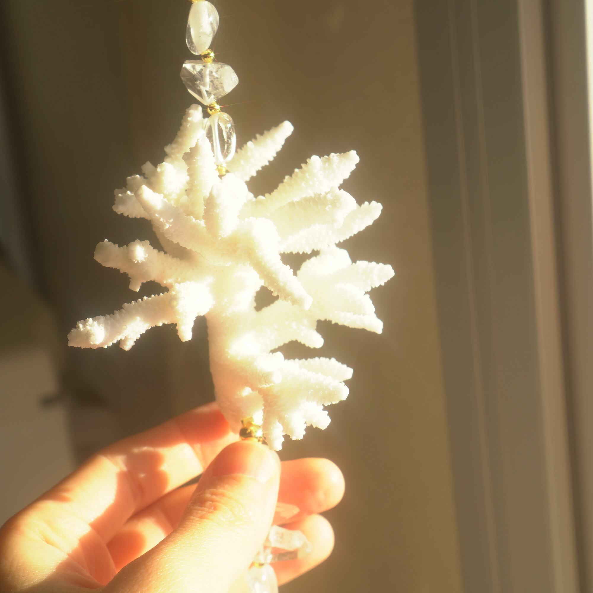 白化珊瑚は、元々がストレスで藻を追い出して自ら白くなった状態のものですが、長い年月をかけて海で洗われ、岸辺に辿り着く頃にはどこか発光するような小さな天使のような美しい姿をしています。(痛みから転化し地球の浄化と再生の光のエネルギーを宿している物質ではないかと私自身は解釈しております)