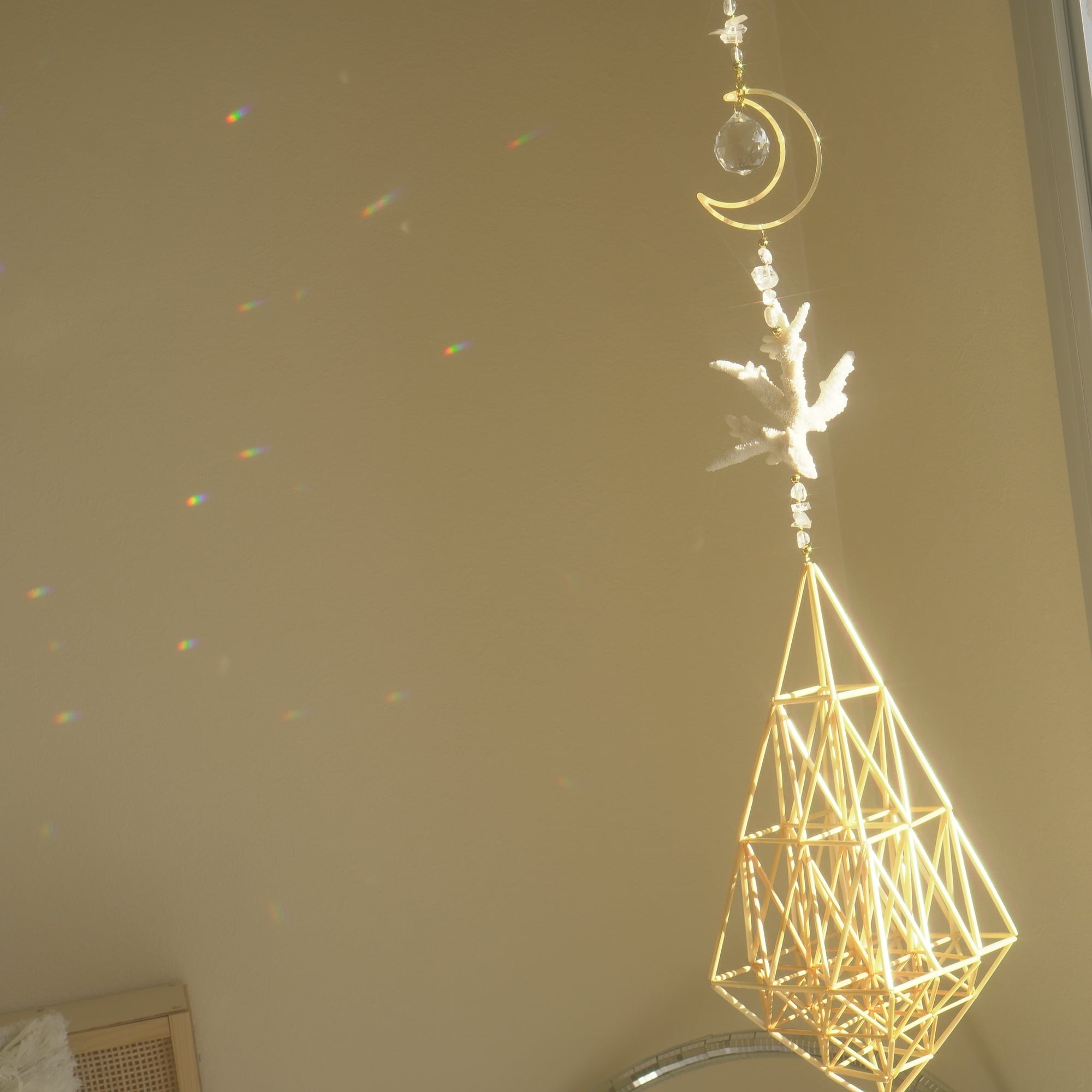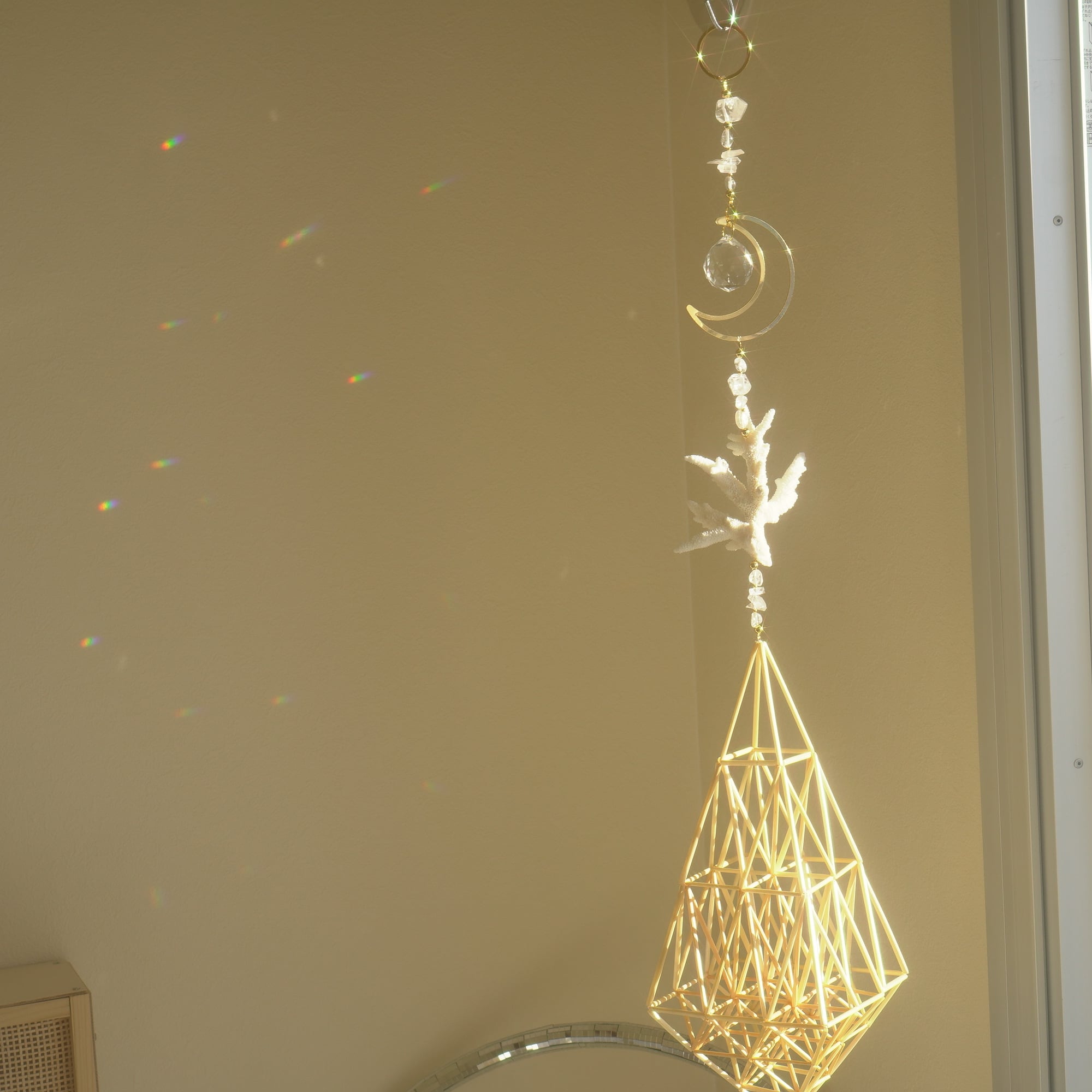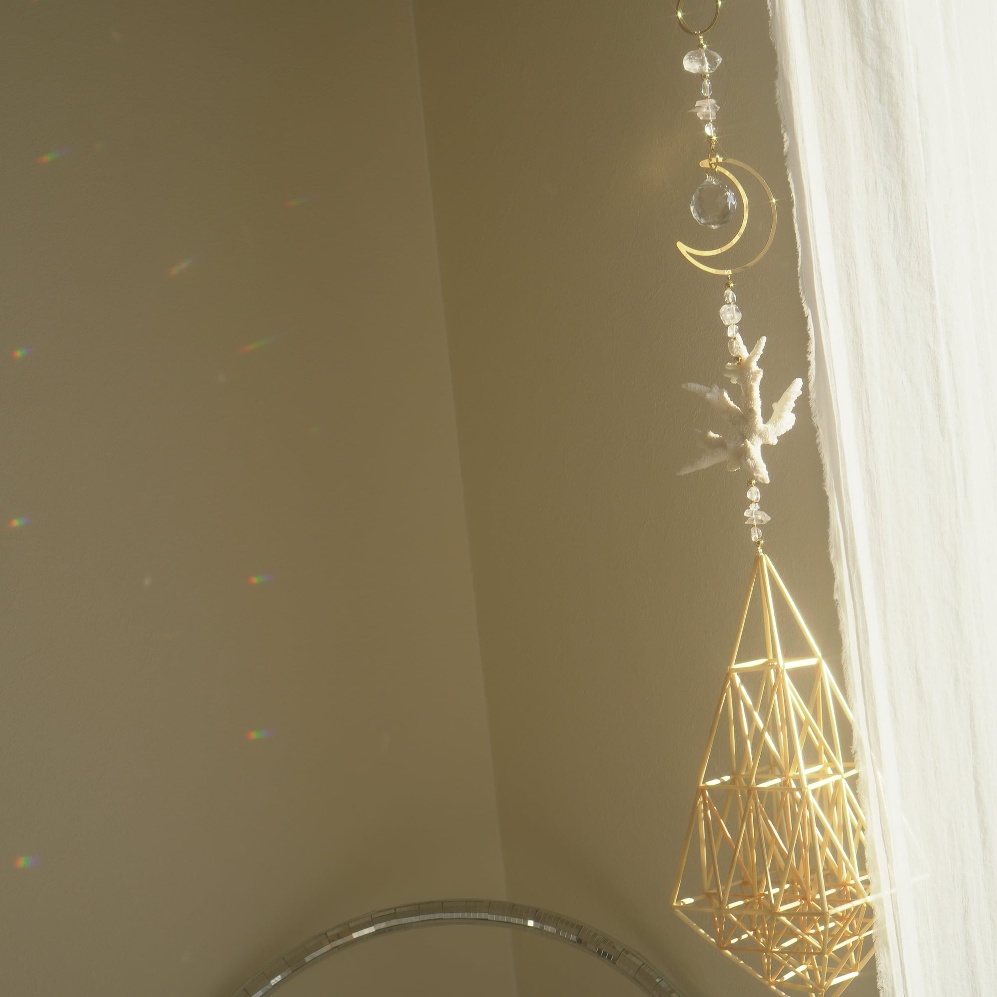 光を浴びるとピースの間を繋いでいる天然水晶や18Kゴールドメッキの月やビーズたちと共にキラキラと輝き、幾何学の中で光が錯綜するような麦わらヒンメリが軽い風に乗りフワフワと揺れ動きます。