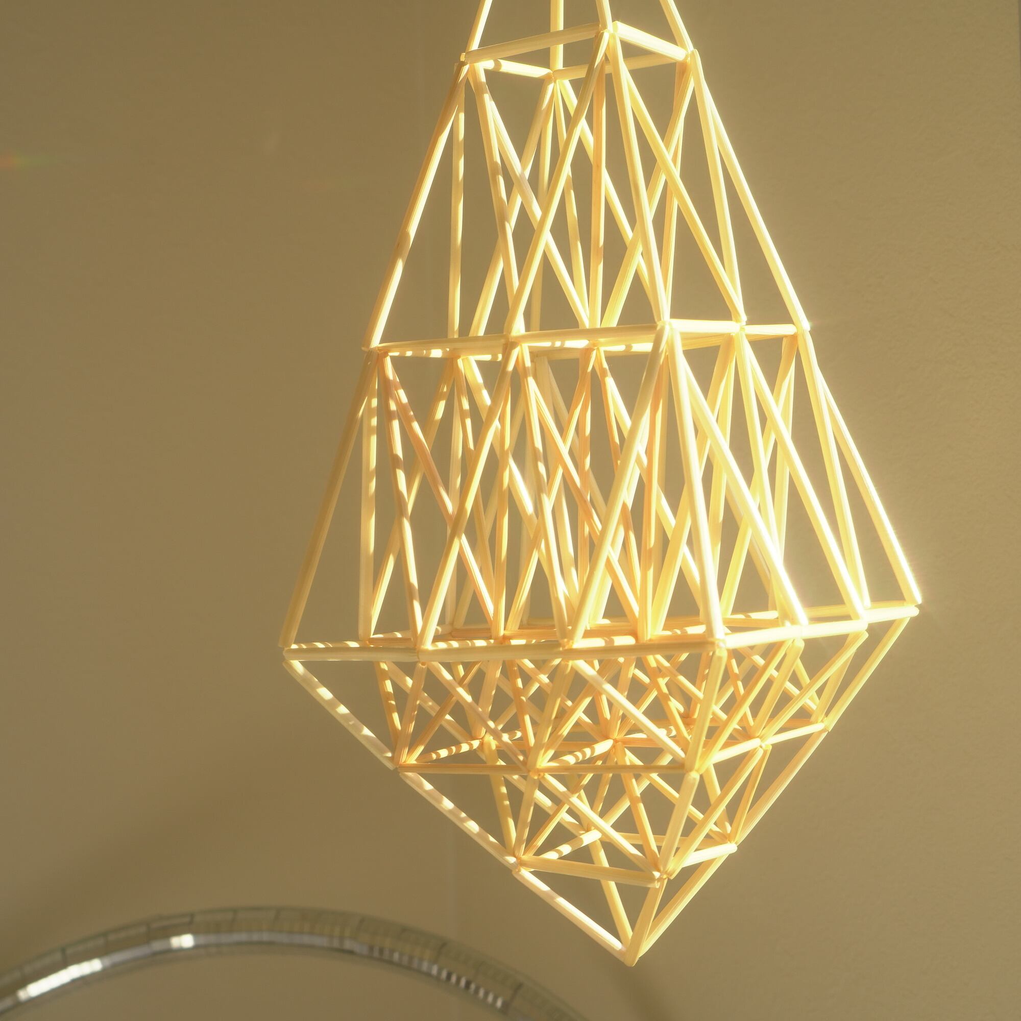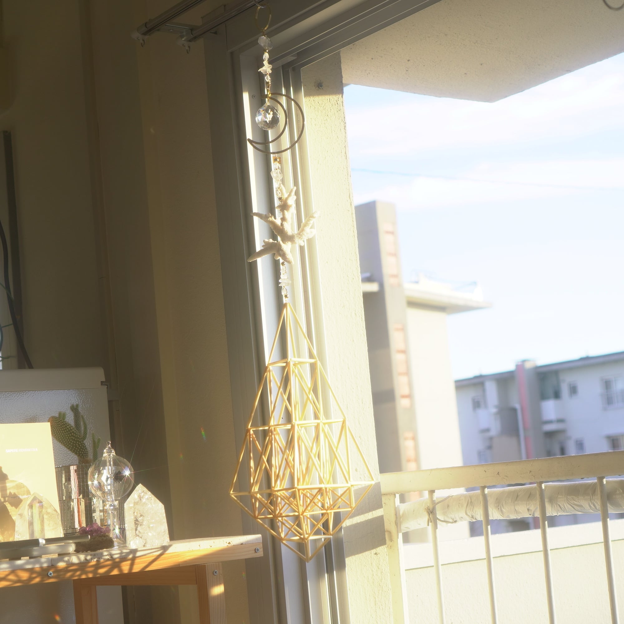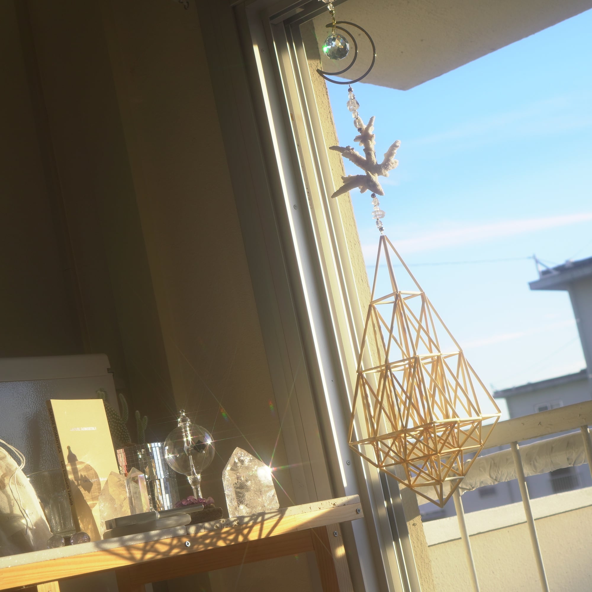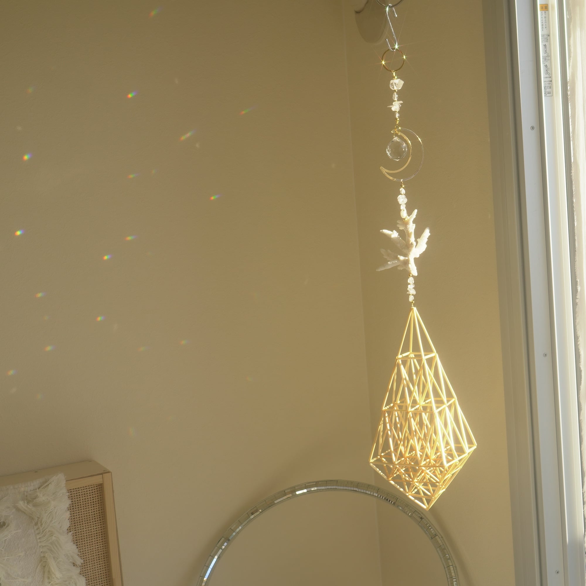 光を浴びるとピースの間を繋いでいる天然水晶や18Kゴールドメッキの月やビーズたちと共にキラキラと輝き、幾何学の中で光が錯綜するような麦わらヒンメリが軽い風に乗りフワフワと揺れ動きます。