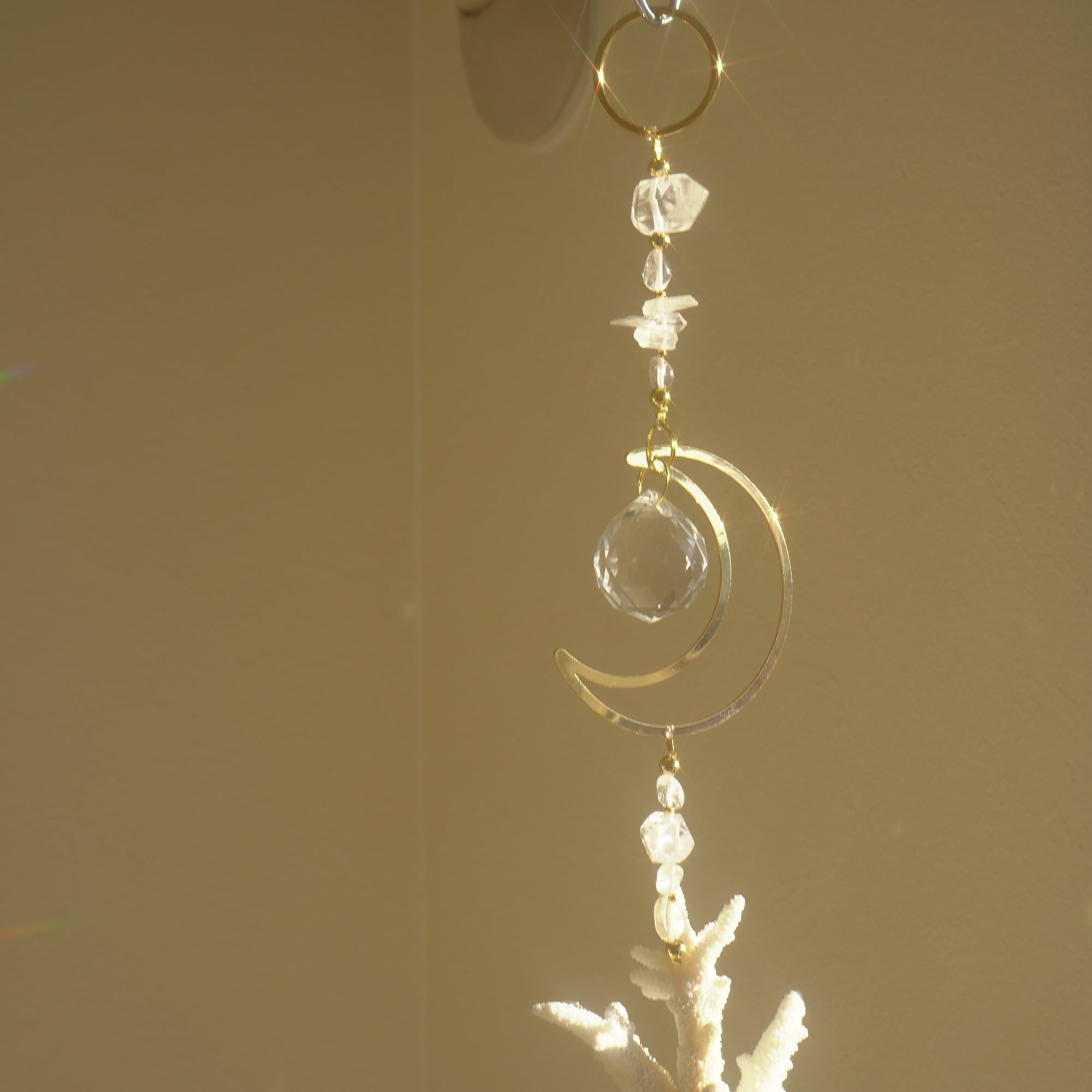 こちらは白化珊瑚の美しい欠片と8cmの大きな輝く月パーツ・麦わらで編んだヒンメリを合わせた光のオーナメント。