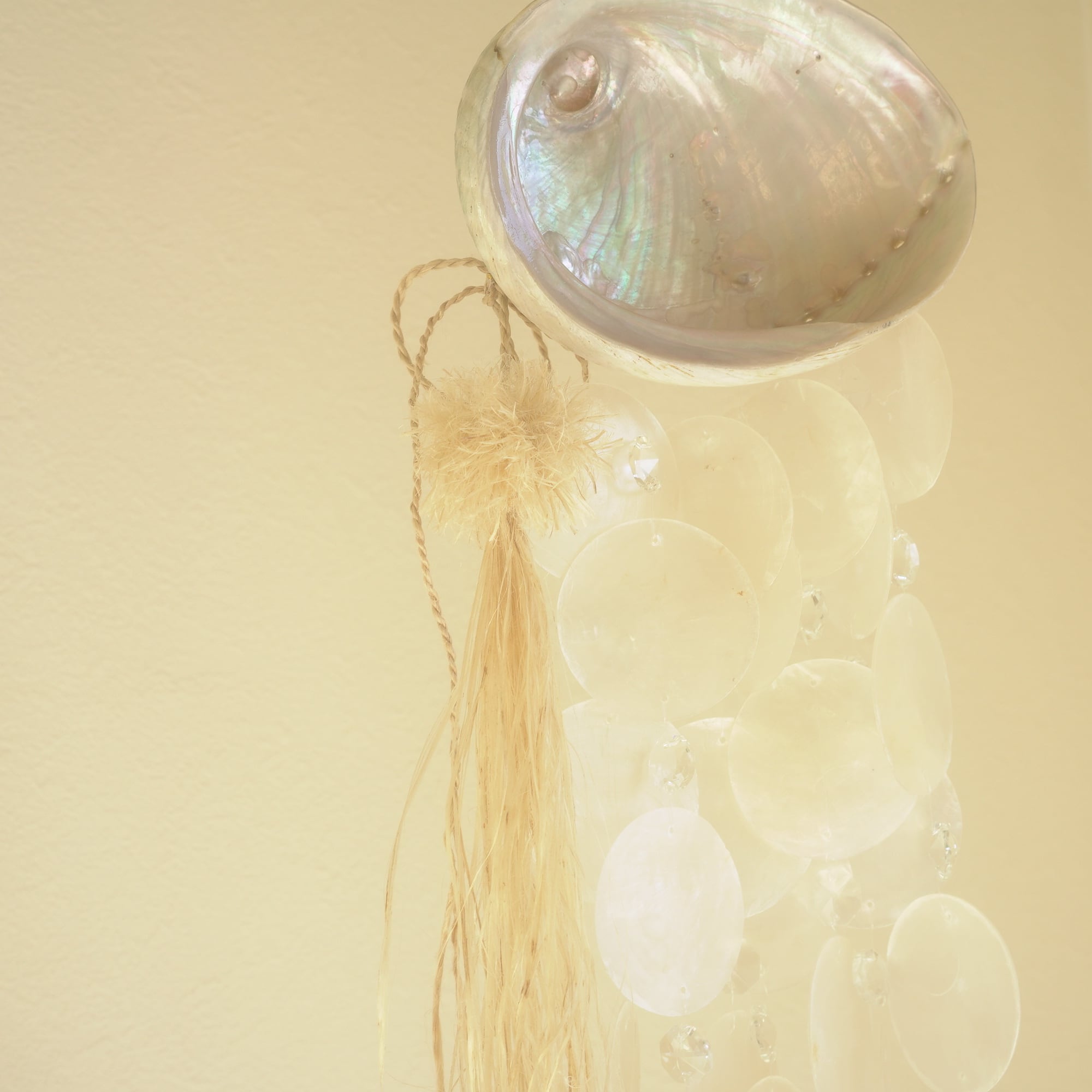 アバロンシェル自体も本来平置きでセージやパロサントなどの受け皿として使われることが多く、海の由来から浄化の意味を持っており、精麻も祓い清める・触れたものをゼロに戻し本来の力を取り戻させる等の作用があります。同じく海のパワーを持つカピス貝同士が重なり合うチャイムと合わさることで、そこに在るのを眺めるだけでほっと安心できるような、神聖な神具のような存在感のアイテムになればいいなと願っています。