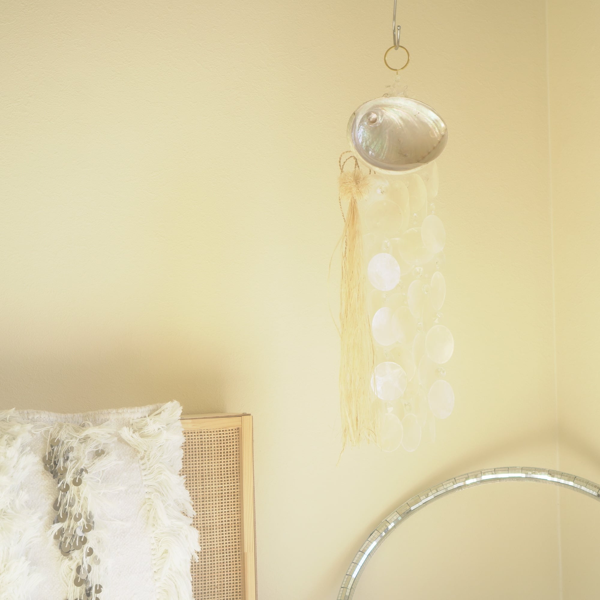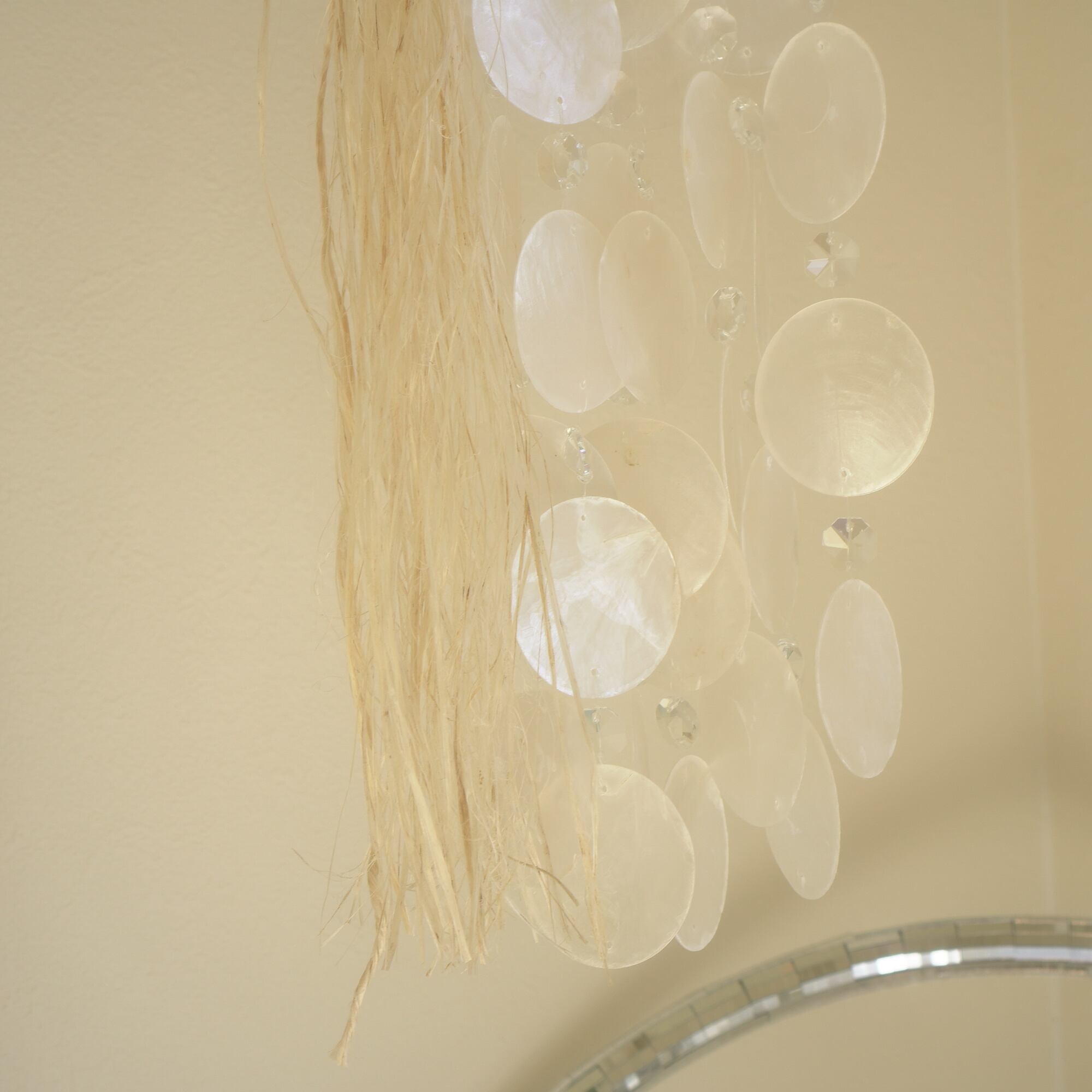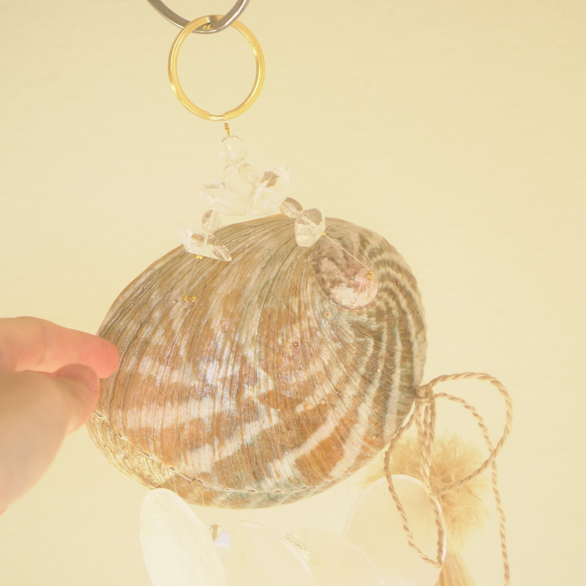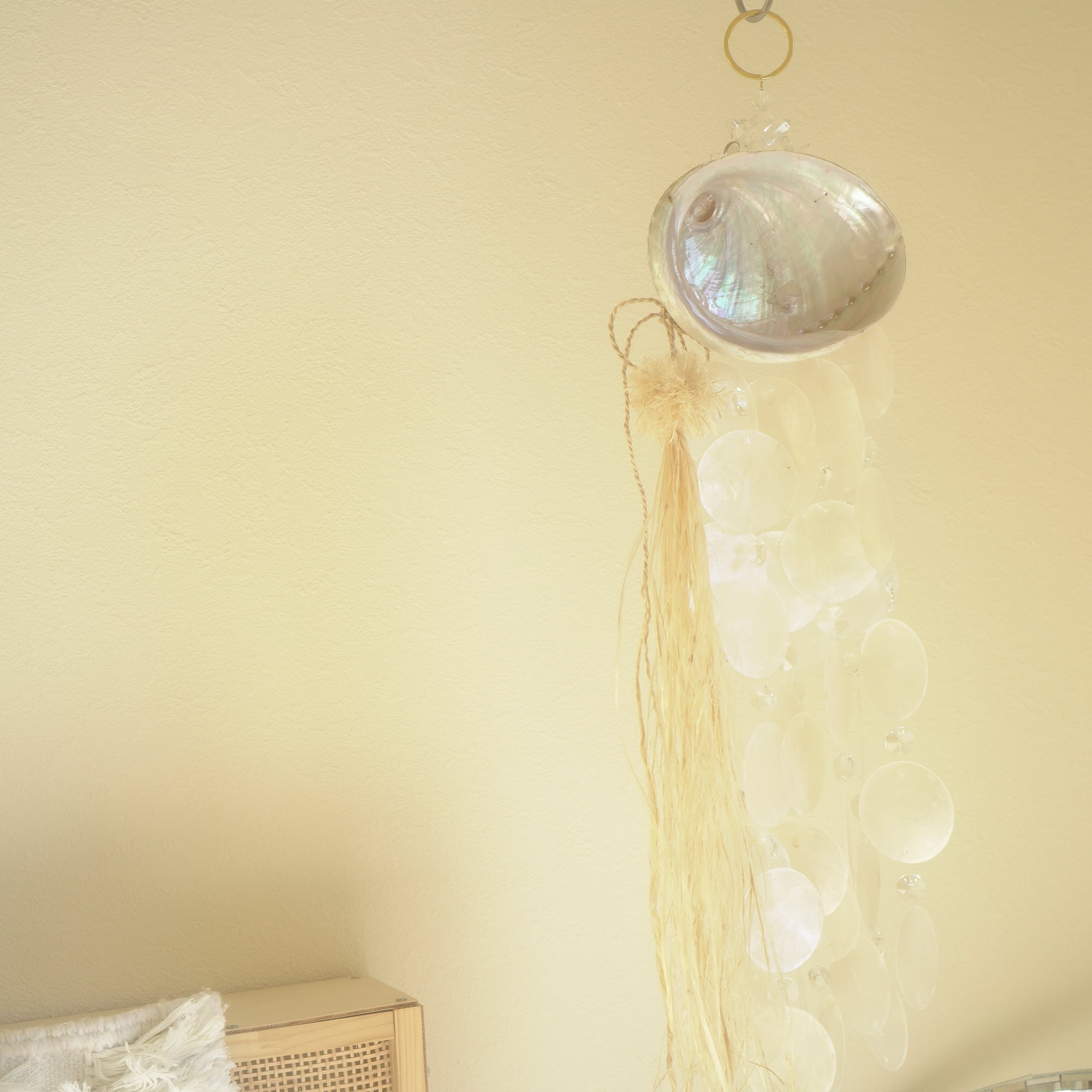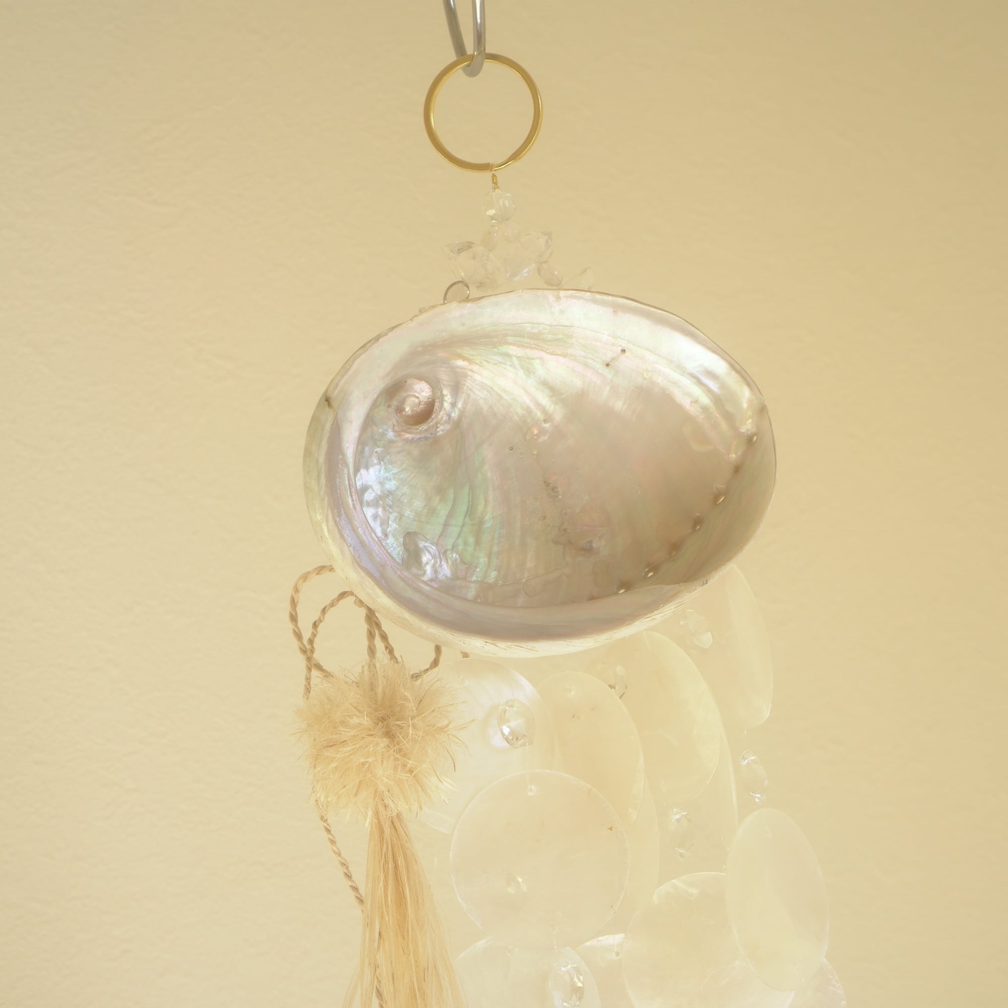 下部に乳白色のカピスシェルと、水しぶきのような透明感を出すために小さなサンキャッチャーガラスを交互に編み込んでおり、また、シェル+シェルの重なりだけでなく、シェル+ガラスの重なりが加わることで、より微細な音色を奏でてくれます。(サンキャッチャー自体は小粒なので、光のプリズムは控えめ)