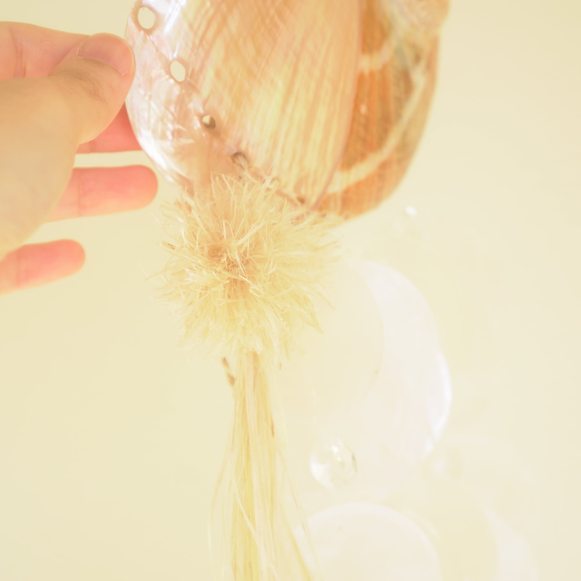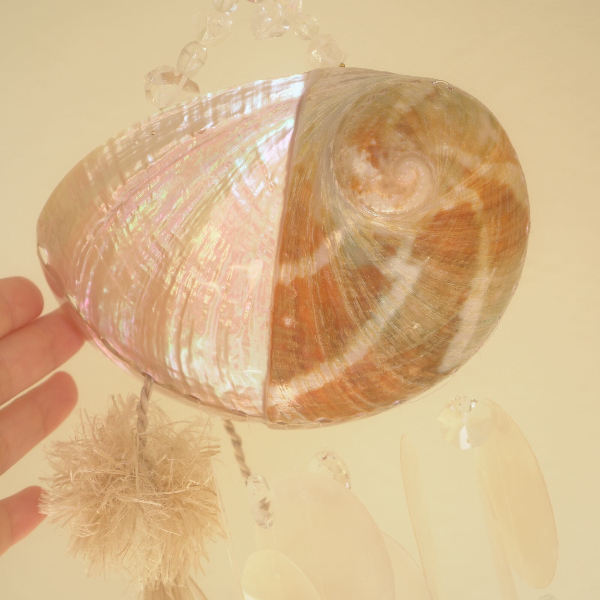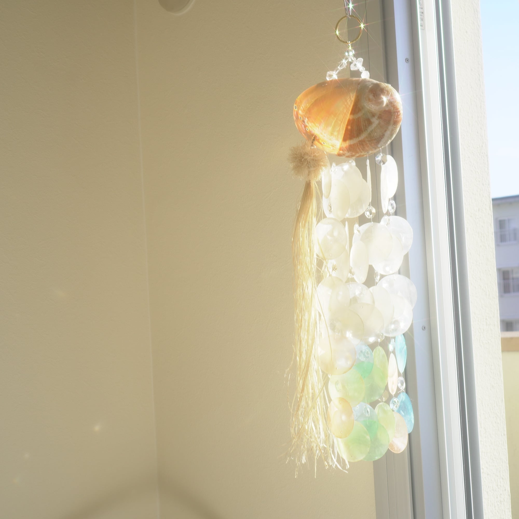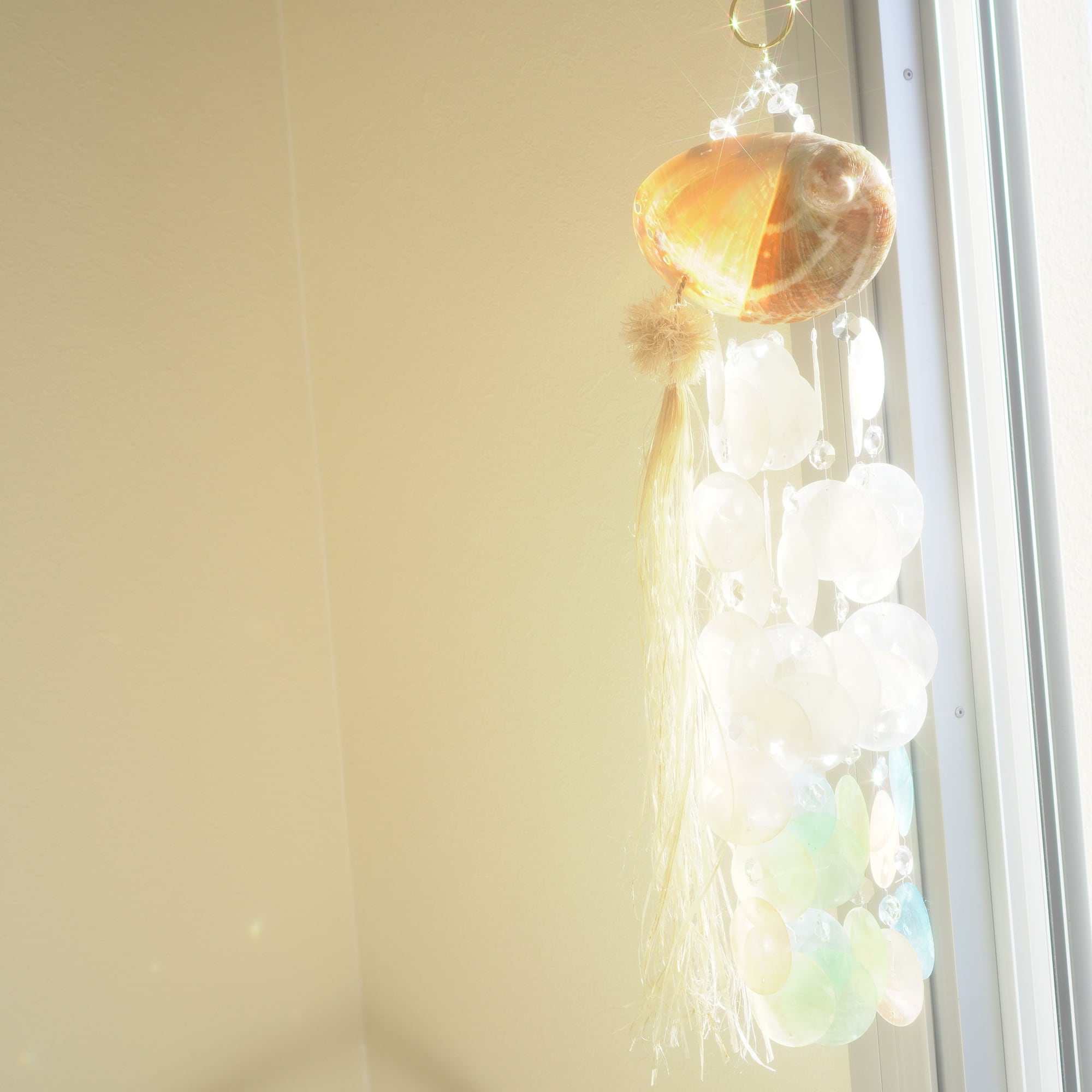 下部に乳白色~カラフルなカピスシェルと、水しぶきのような透明感を出すために小さなサンキャッチャーガラスを交互に編み込んでおり、また、シェル+シェルの重なりだけでなく、シェル+ガラスの重なりが加わることで、より微細な音色を奏でてくれます。(サンキャッチャー自体は小粒なので、光のプリズムは控えめ)