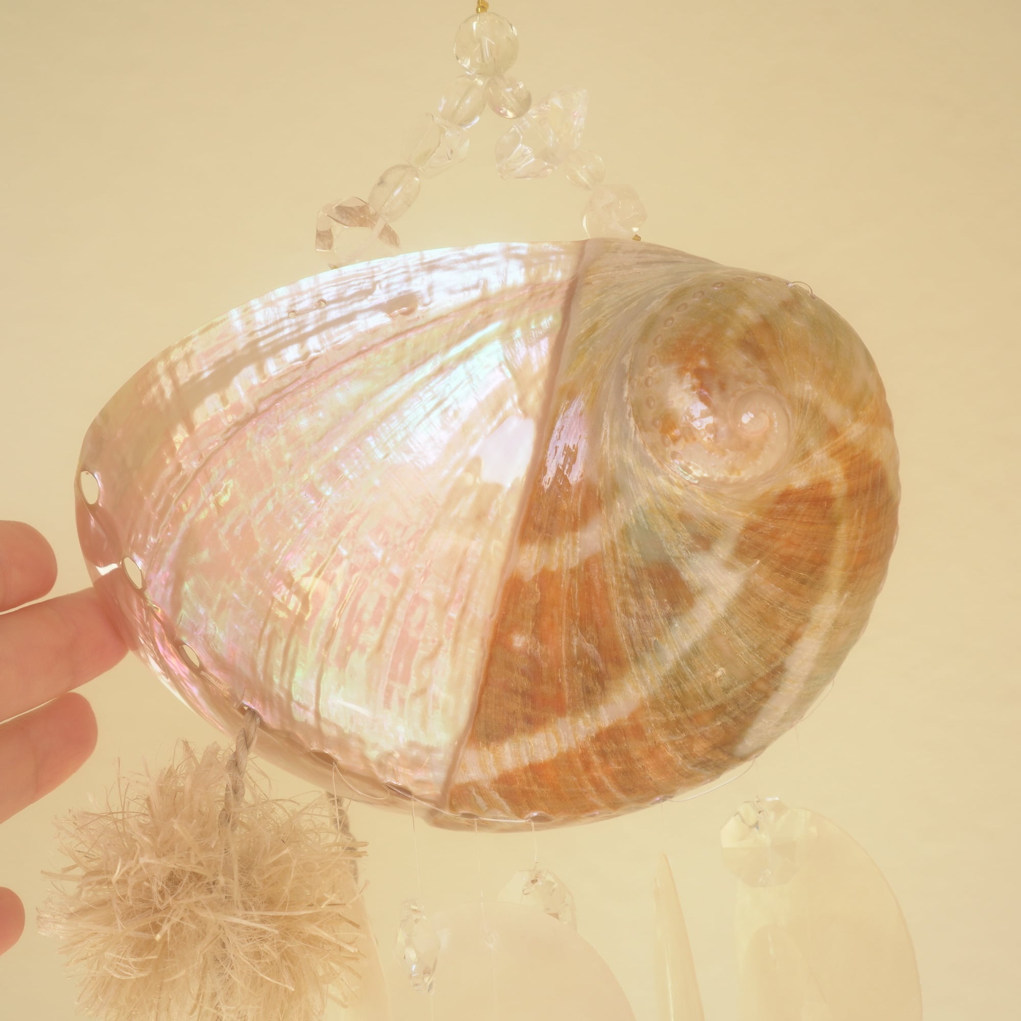 こちらは、大きなアバロンシェルやカピスシェルを編んだ海の光のチャイム。