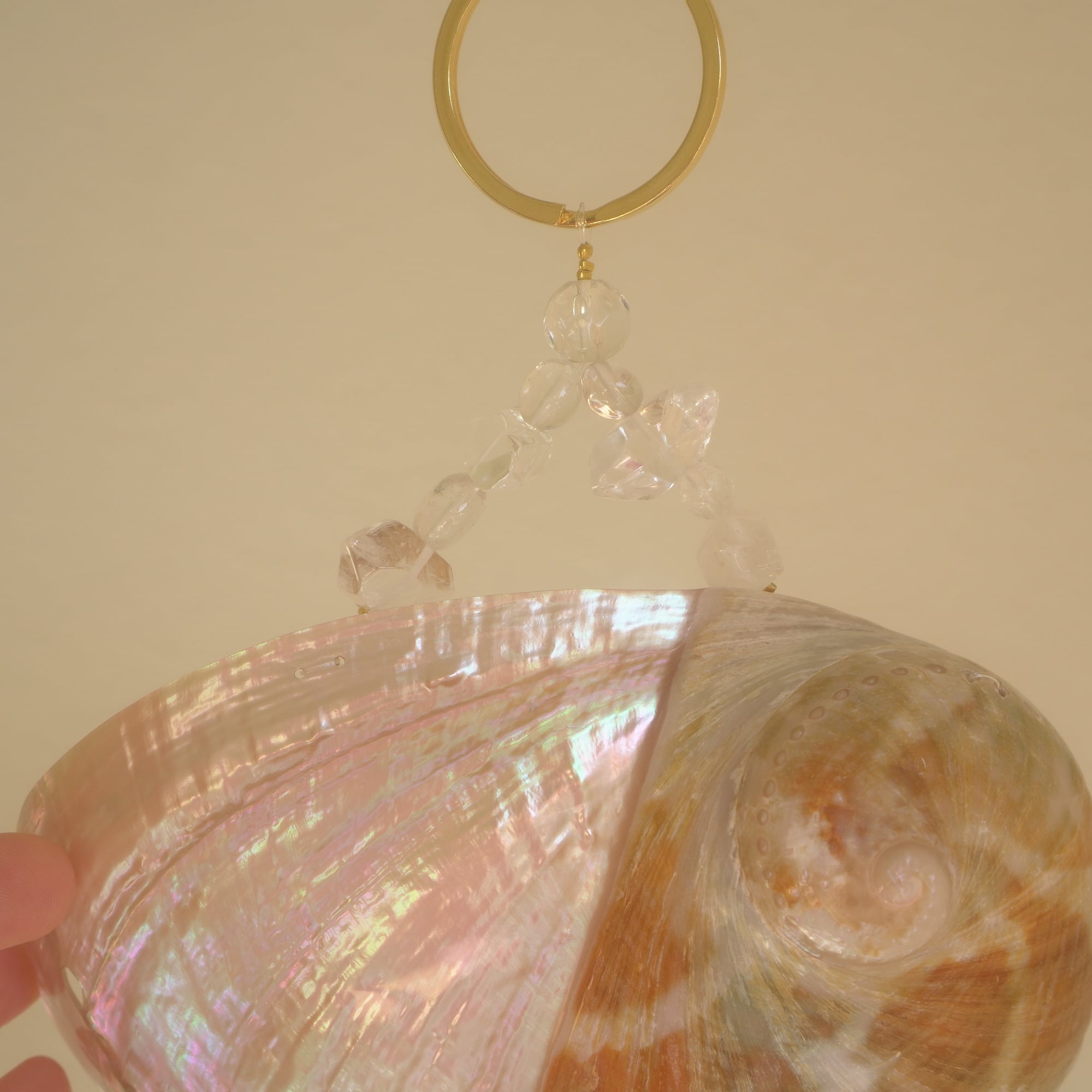 アバロンシェル自体も本来平置きでセージやパロサントなどの受け皿として使われることが多く、海の由来から浄化の意味を持っており、精麻も祓い清める・触れたものをゼロに戻し本来の力を取り戻させる等の作用があります。同じく海のパワーを持つカピス貝同士が重なり合うチャイムと合わさることで、そこに在るのを眺めるだけでほっと安心できるような、神聖な神具のような存在感のアイテムになればいいなと願っています。