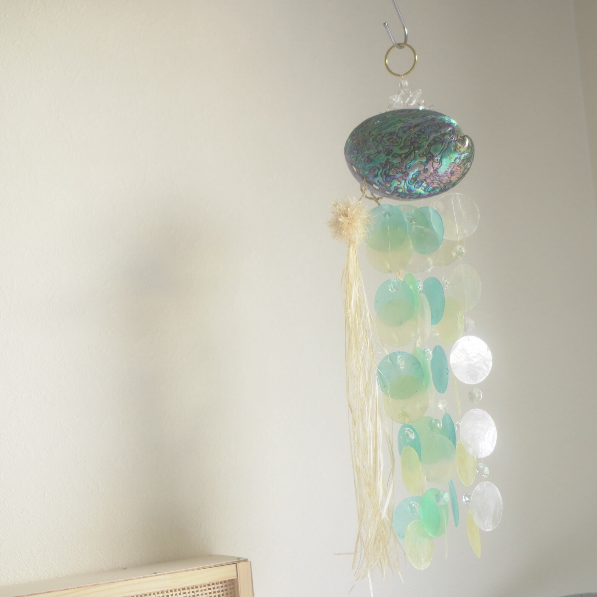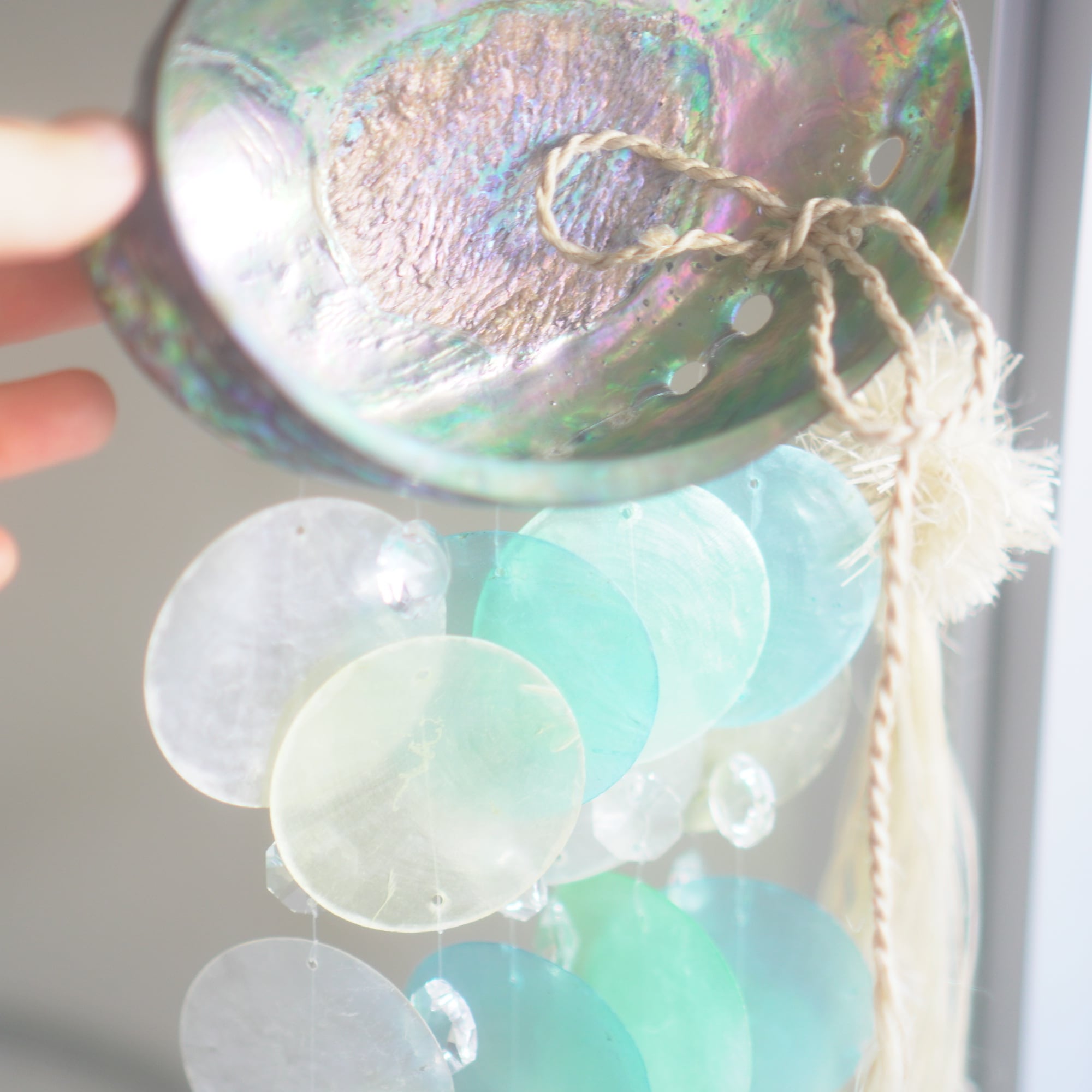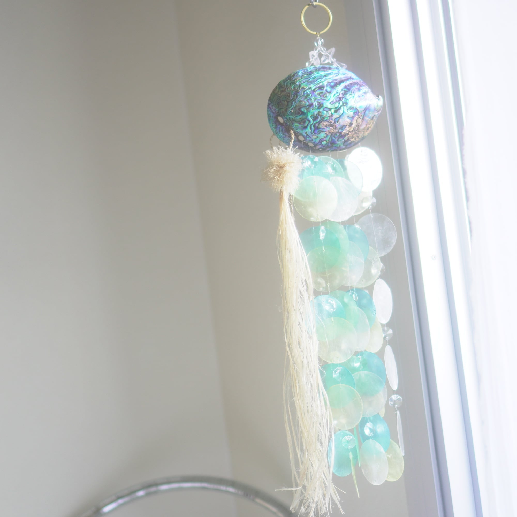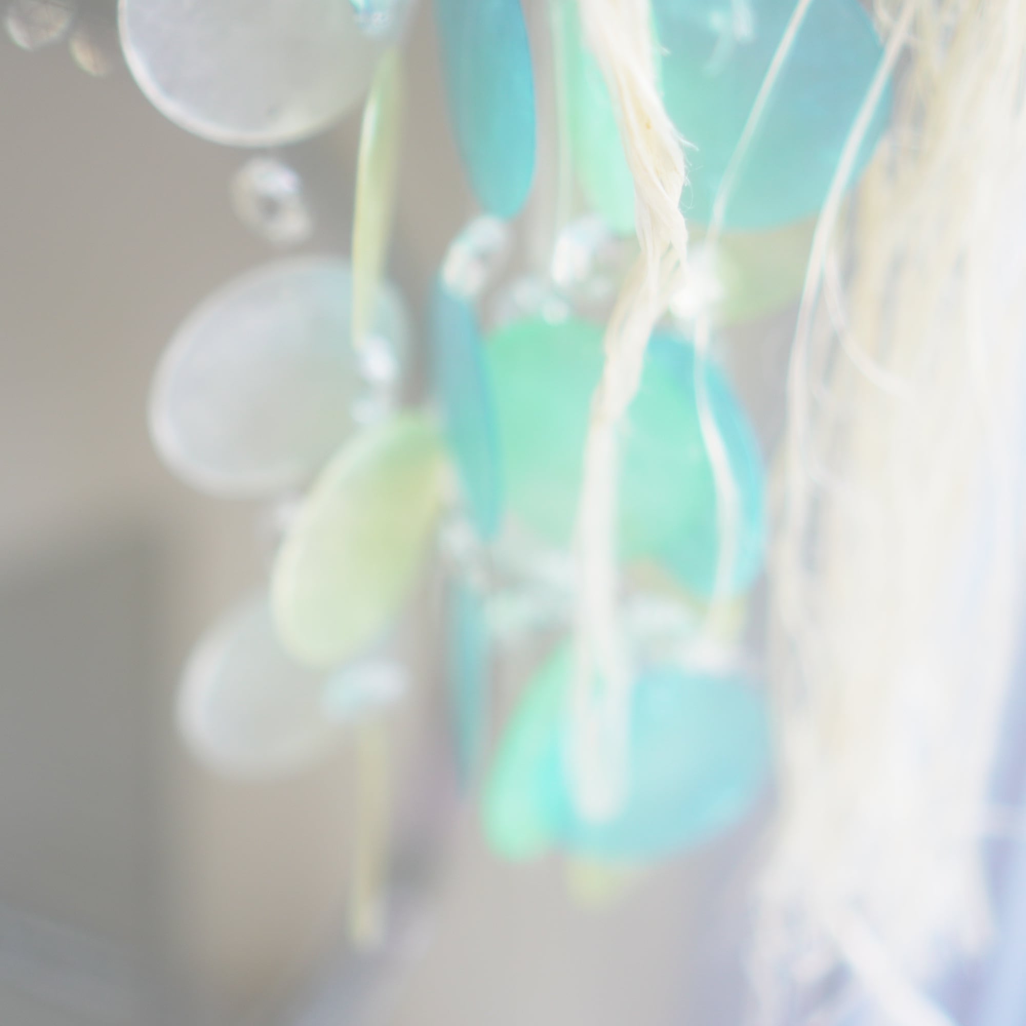 下部にブルー系グラデーションのカピスシェルと、水しぶきのような透明感を出すために小さなサンキャッチャーガラスを交互に編み込んでおり、また、シェル+シェルの重なりだけでなく、シェル+ガラスの重なりが加わることで、より微細な音色を奏でてくれます。(サンキャッチャー自体は小粒なので、光のプリズムは控えめ)
