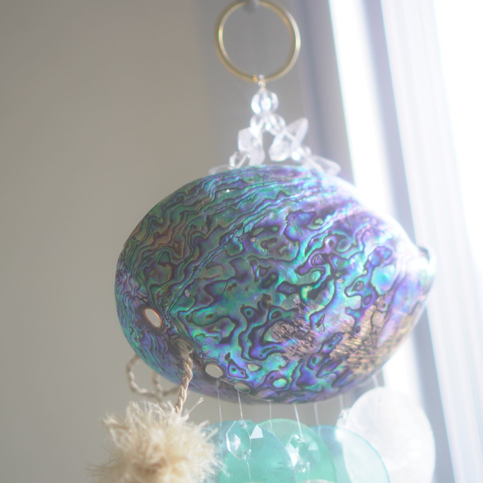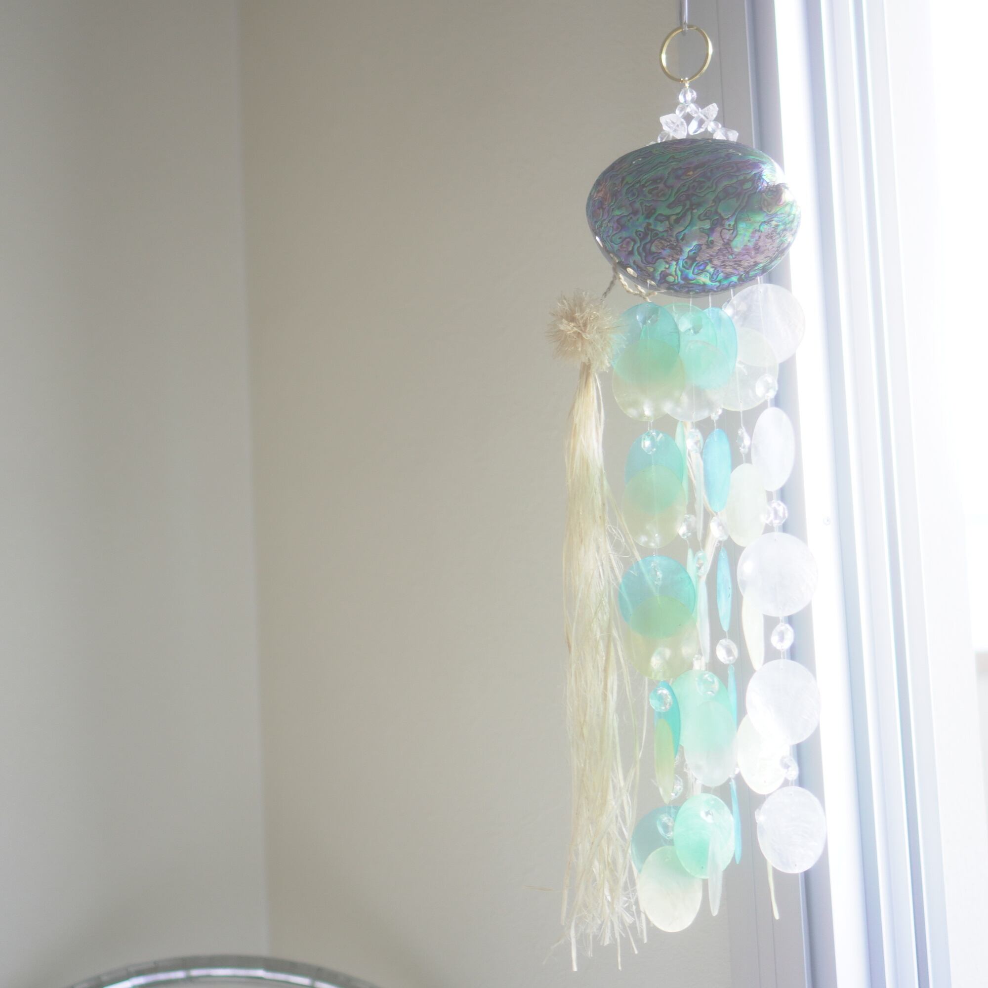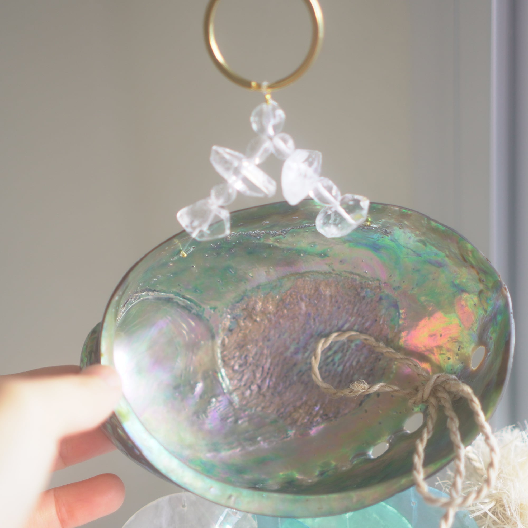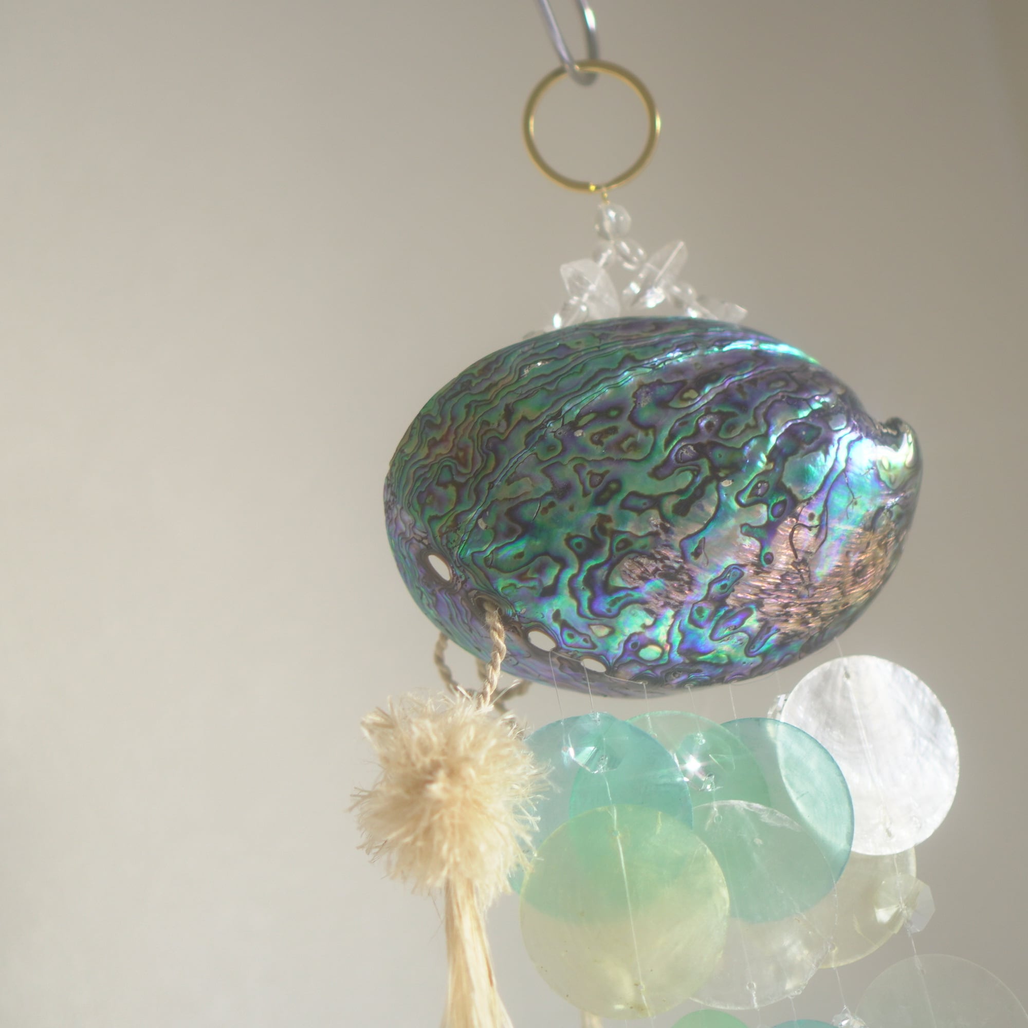下部にブルー系グラデーションのカピスシェルと、水しぶきのような透明感を出すために小さなサンキャッチャーガラスを交互に編み込んでおり、また、シェル+シェルの重なりだけでなく、シェル+ガラスの重なりが加わることで、より微細な音色を奏でてくれます。(サンキャッチャー自体は小粒なので、光のプリズムは控えめ)