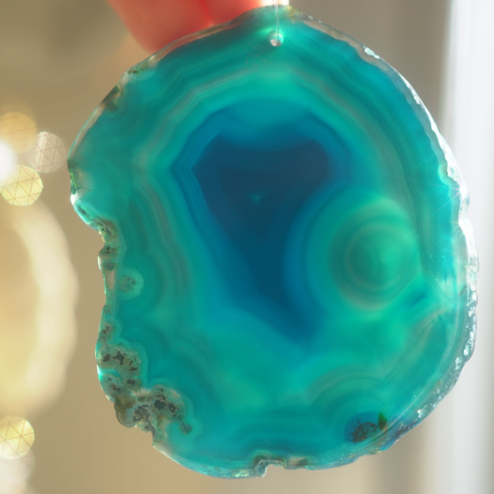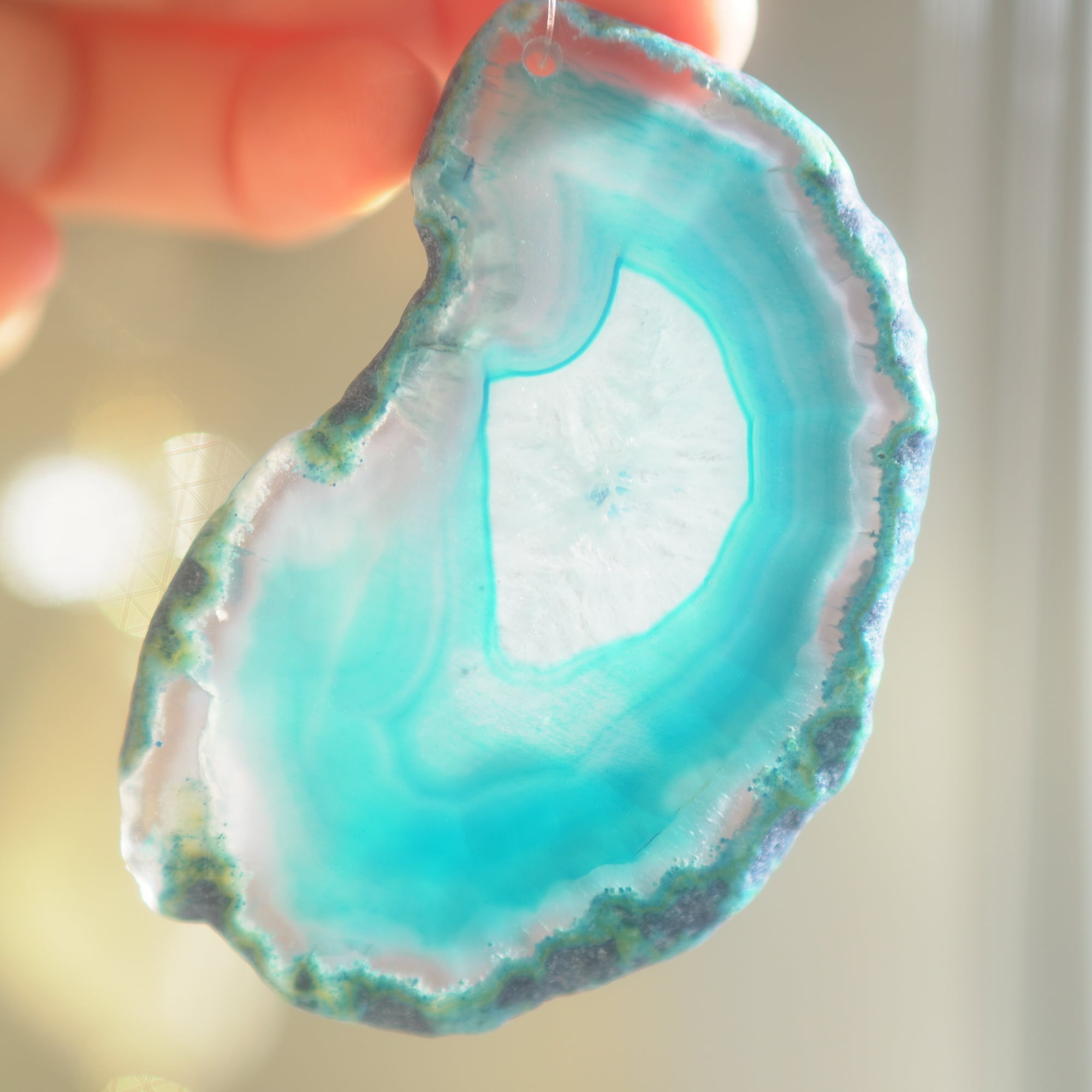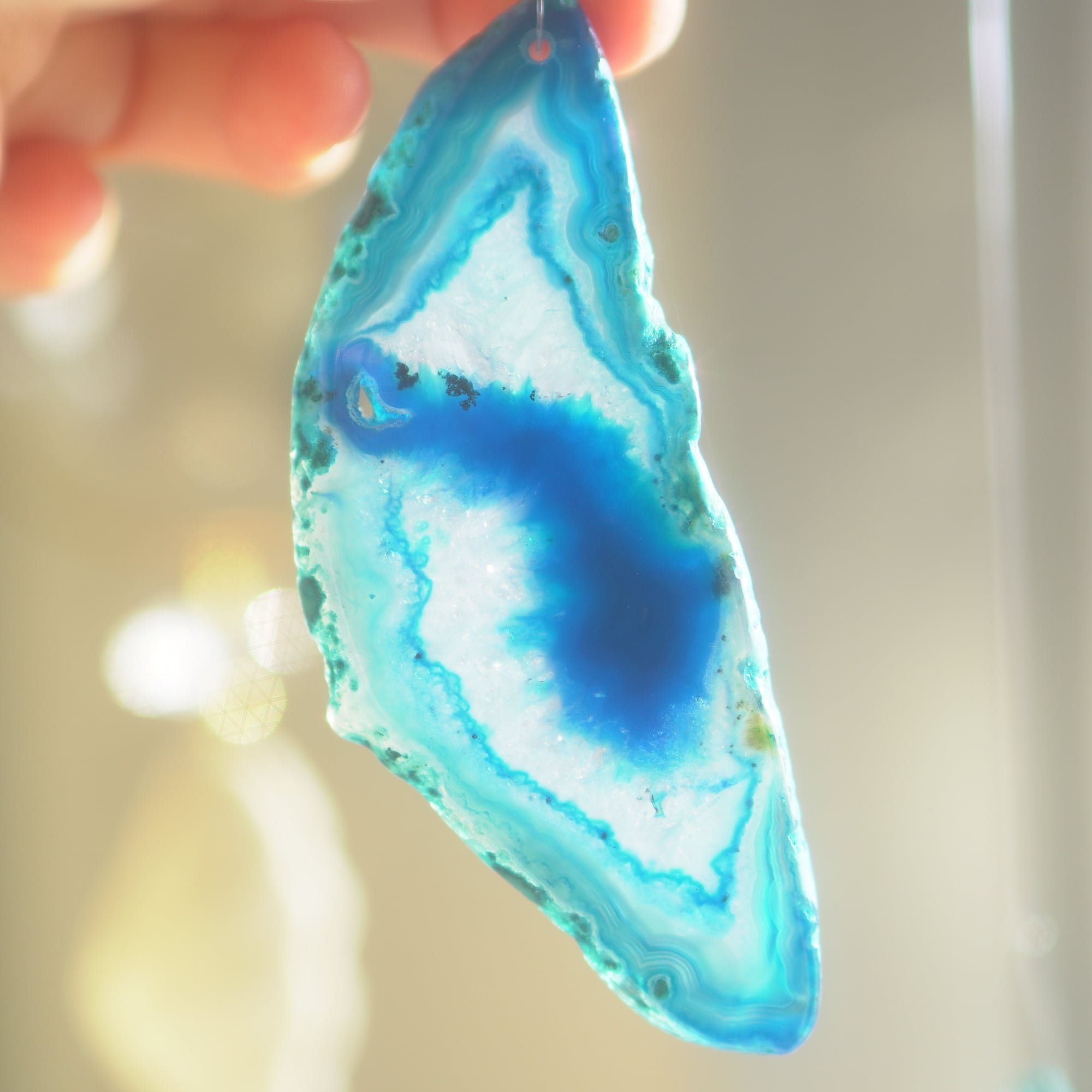 ✧染色の石なので耐光性(光による経年でのカラー変化の耐性)に優れているわけではなくベランダなど一日の中で長時間強い日光に当たるような場所に飾られるのはおすすめしないのですが、陽光に透かした時にだけ真価を発揮する美しさがありますので、是非、時折翳したりして光と一緒にお楽しみいただけたらと思います。特に濃い鮮やかな色など、色変化が気になられる場合は、日光のあまり当たらない場所に飾ってくださいね✧