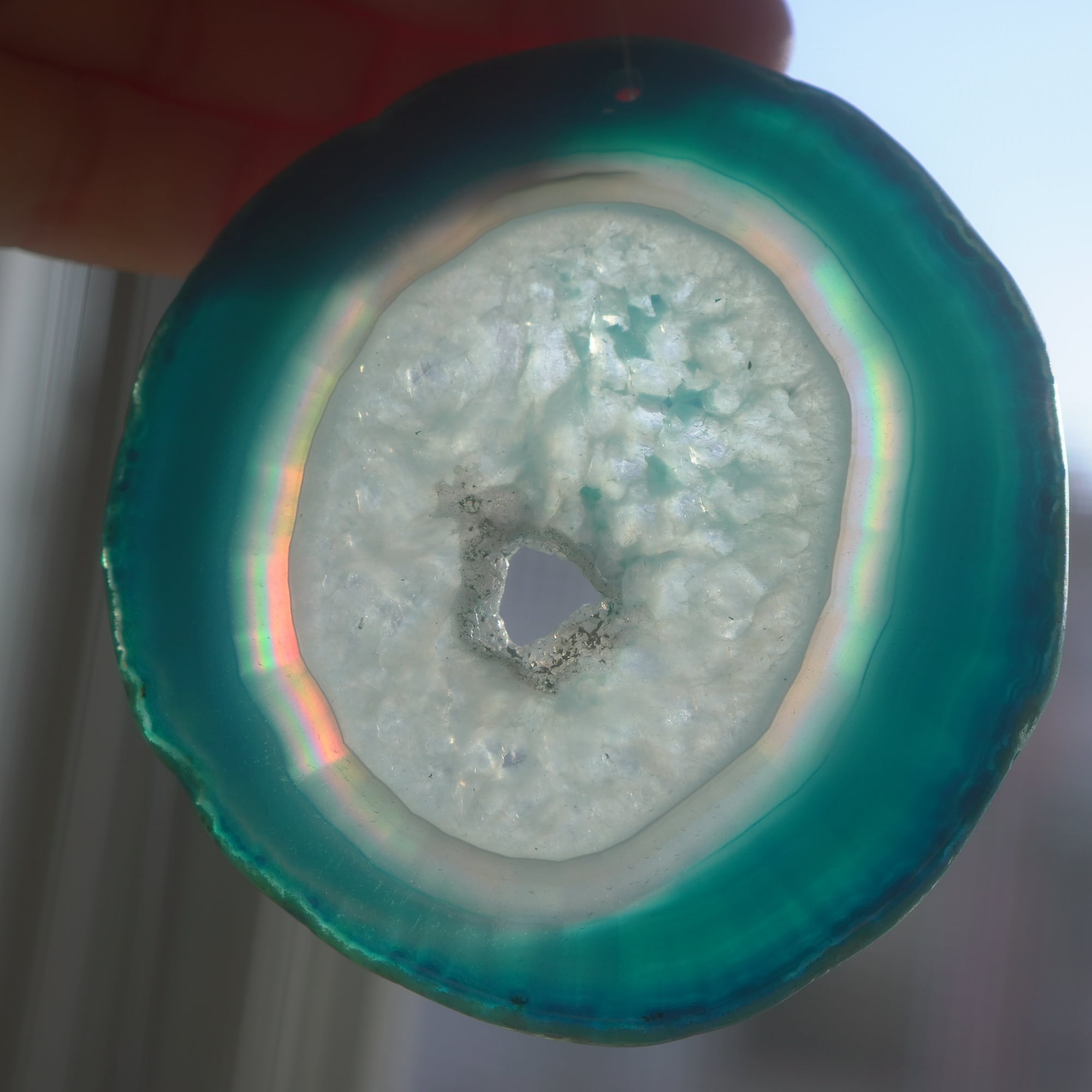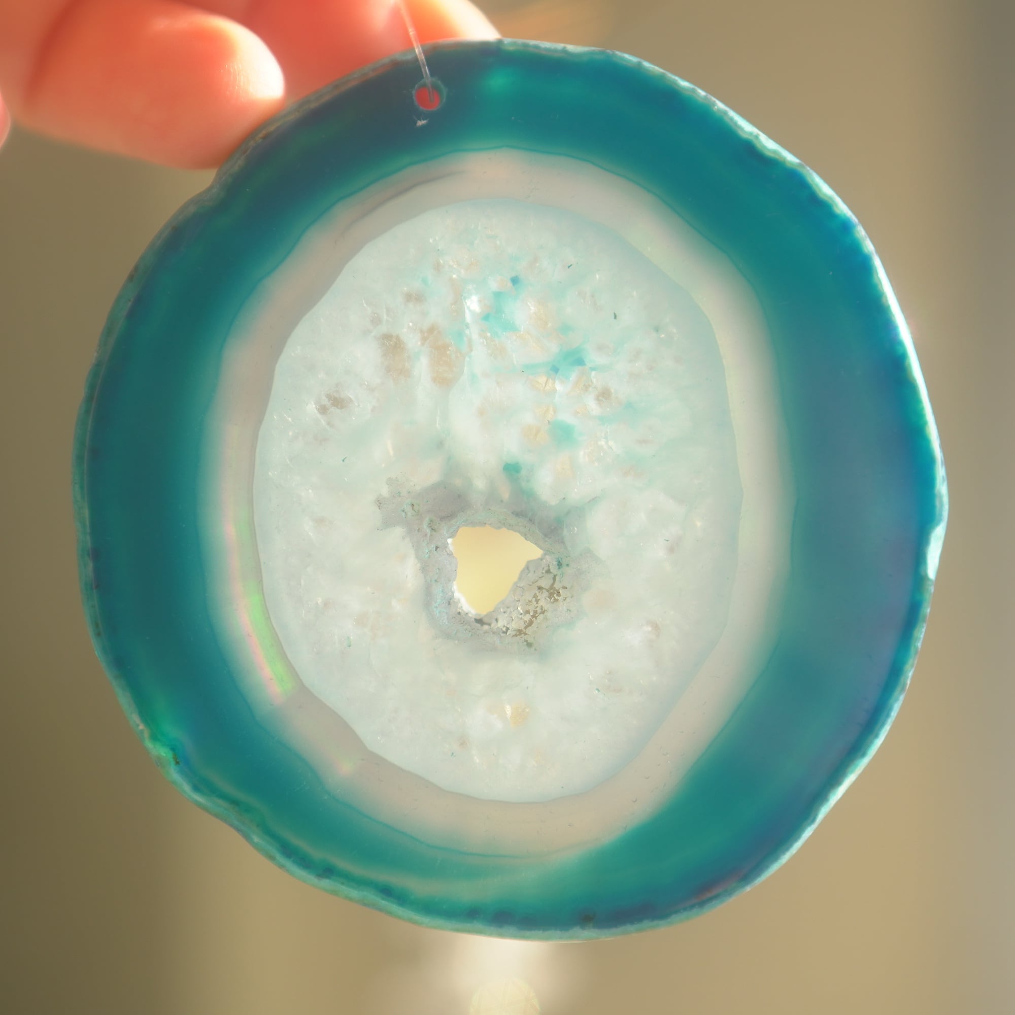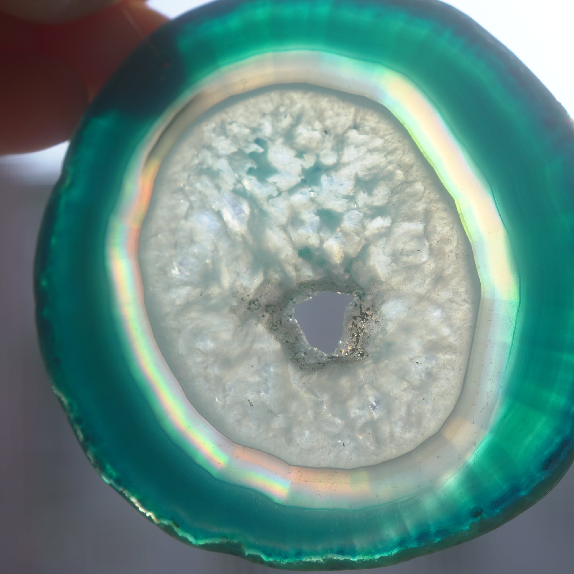 ✧染色の石なので耐光性(光による経年でのカラー変化の耐性)に優れているわけではなくベランダなど一日の中で長時間強い日光に当たるような場所に飾られるのはおすすめしないのですが、陽光に透かした時にだけ真価を発揮する美しさがありますので、是非、時折翳したりして光と一緒にお楽しみいただけたらと思います。特に濃い鮮やかな色など、色変化が気になられる場合は、日光のあまり当たらない場所に飾ってくださいね✧