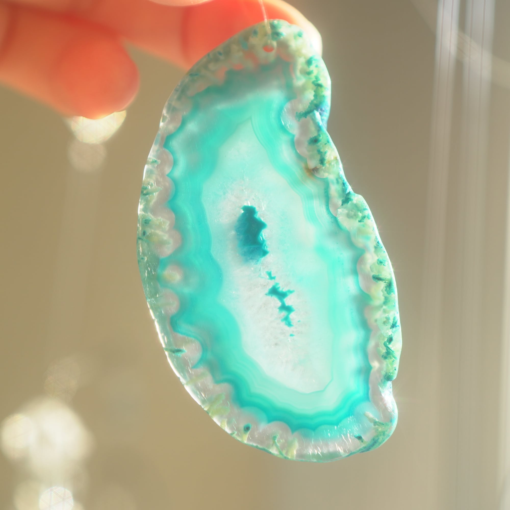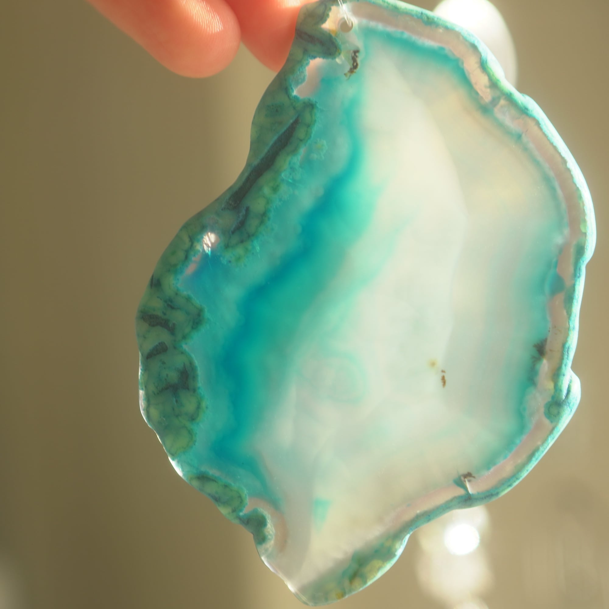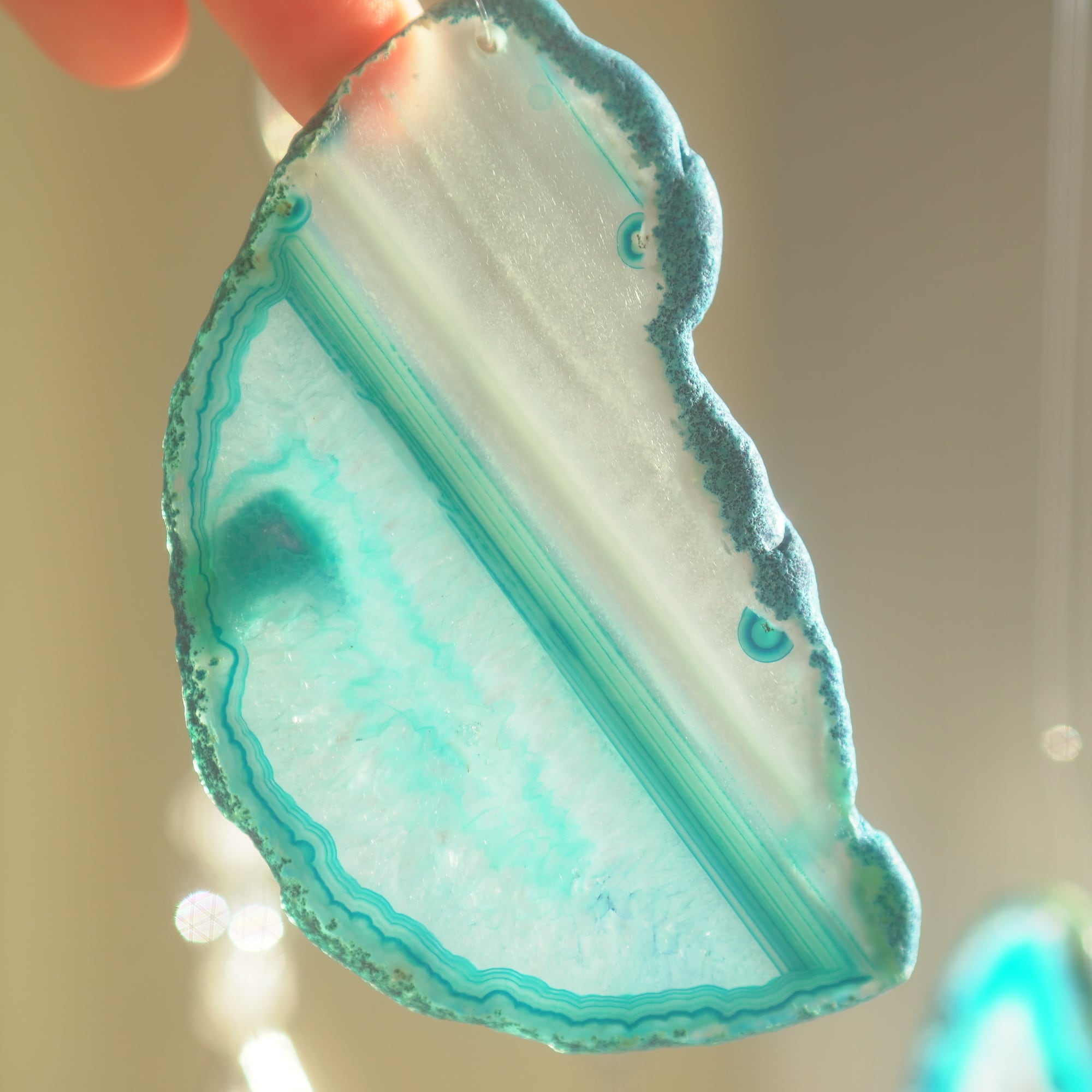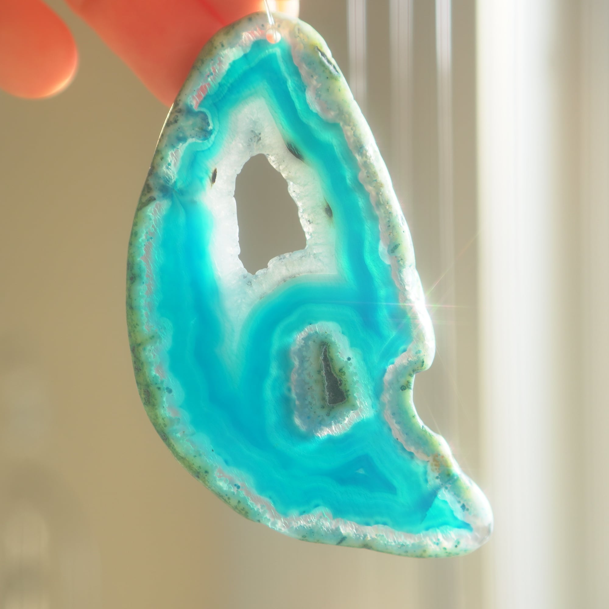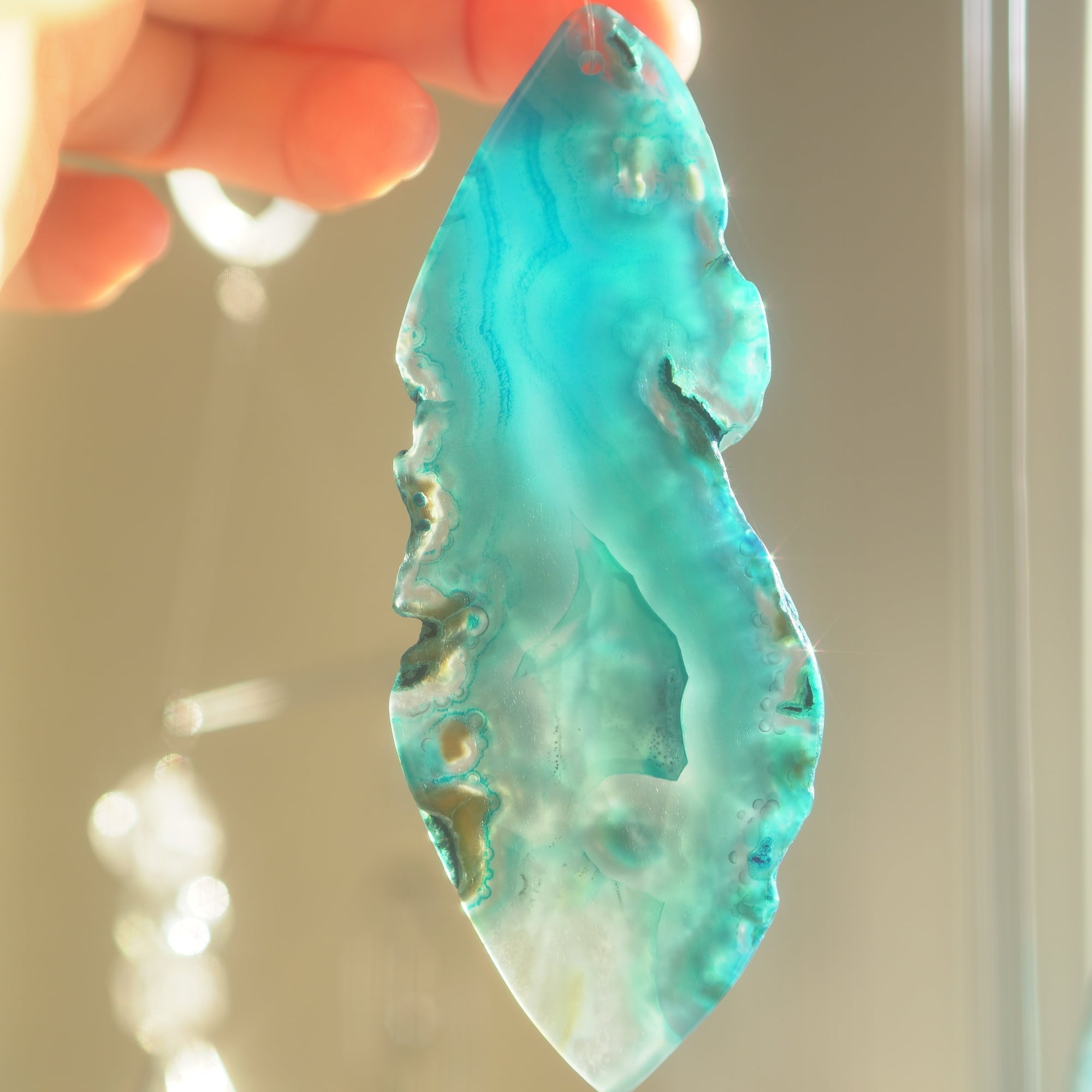 ✧染色の石なので耐光性(光による経年でのカラー変化の耐性)に優れているわけではなくベランダなど一日の中で長時間強い日光に当たるような場所に飾られるのはおすすめしないのですが、陽光に透かした時にだけ真価を発揮する美しさがありますので、是非、時折翳したりして光と一緒にお楽しみいただけたらと思います。特に濃い鮮やかな色など、色変化が気になられる場合は、日光のあまり当たらない場所に飾ってくださいね✧
