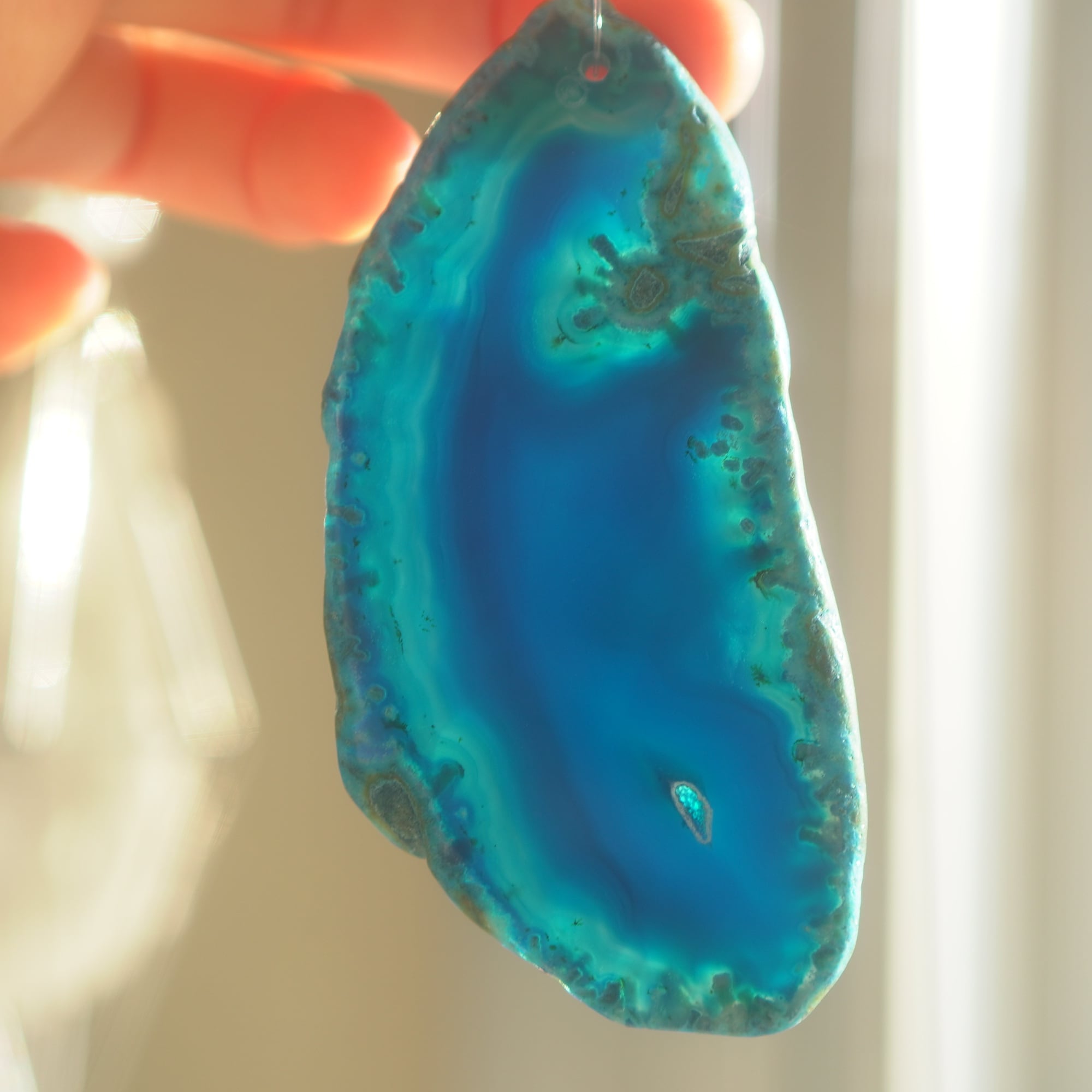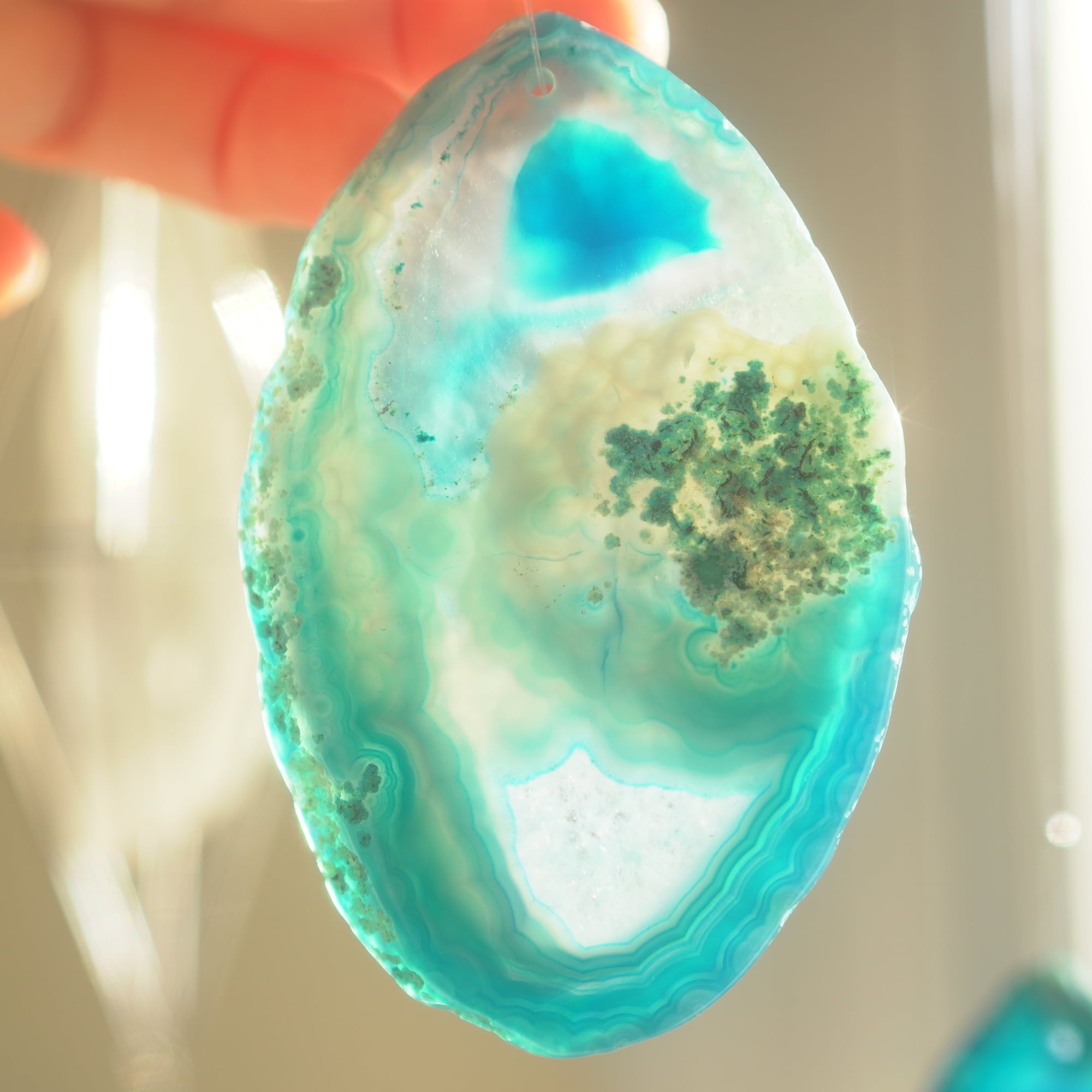 ✧染色の石なので耐光性(光による経年でのカラー変化の耐性)に優れているわけではなくベランダなど一日の中で長時間強い日光に当たるような場所に飾られるのはおすすめしないのですが、陽光に透かした時にだけ真価を発揮する美しさがありますので、是非、時折翳したりして光と一緒にお楽しみいただけたらと思います。特に濃い鮮やかな色など、色変化が気になられる場合は、日光のあまり当たらない場所に飾ってくださいね✧