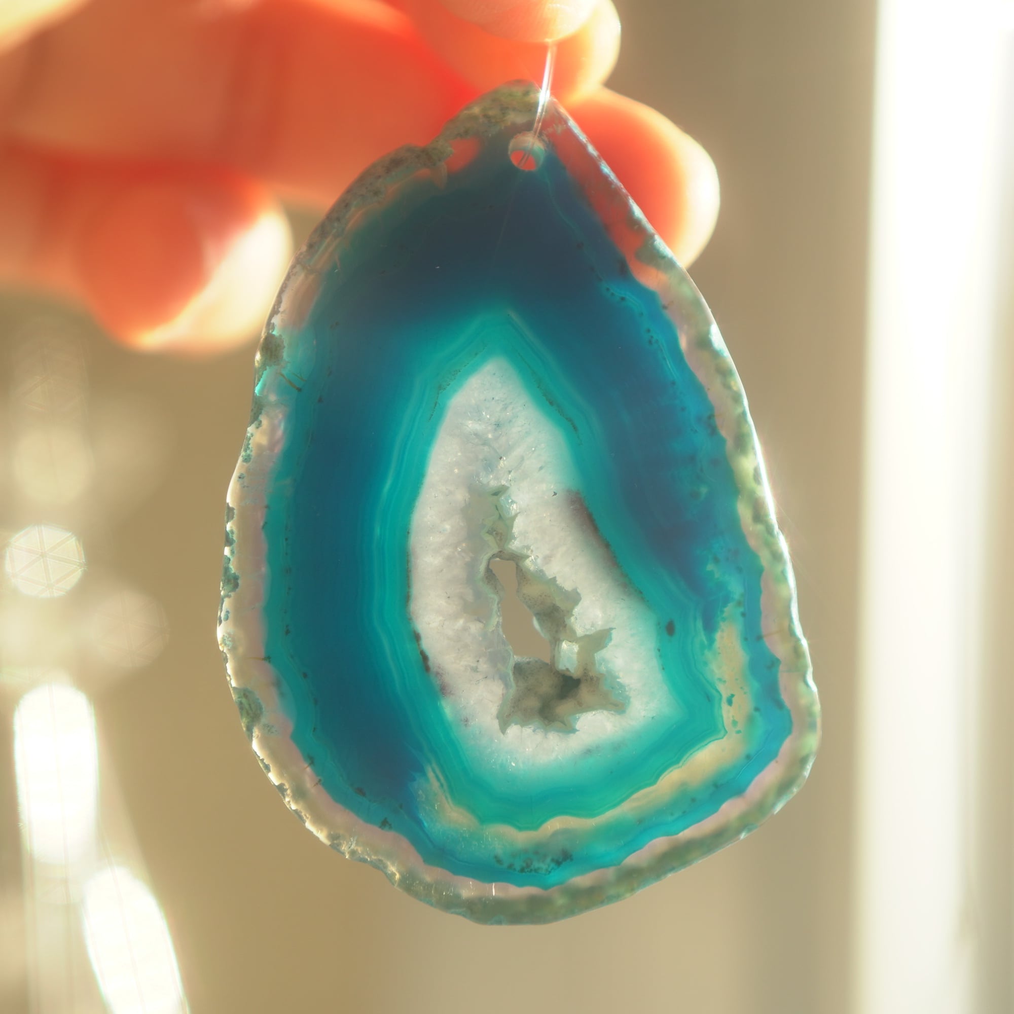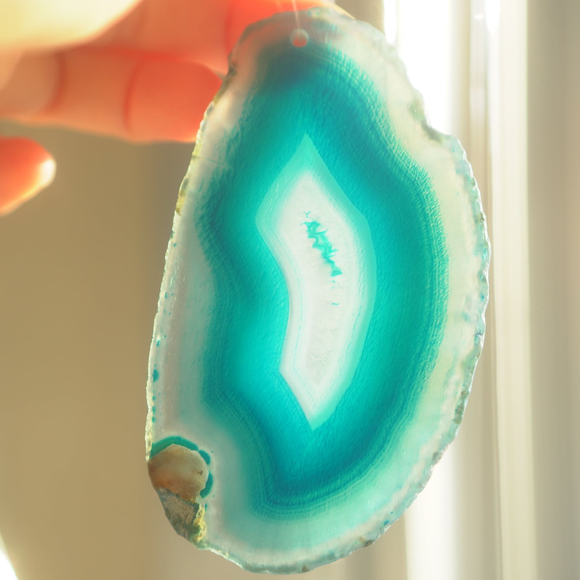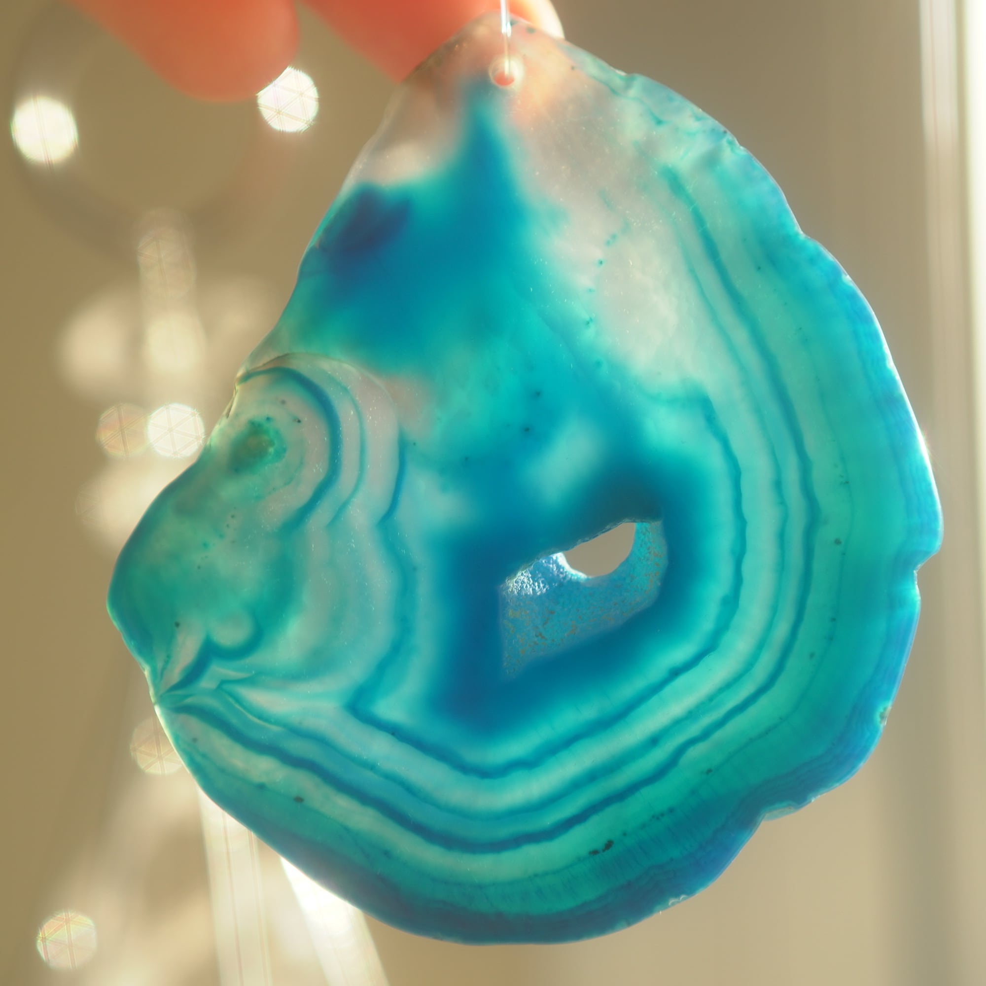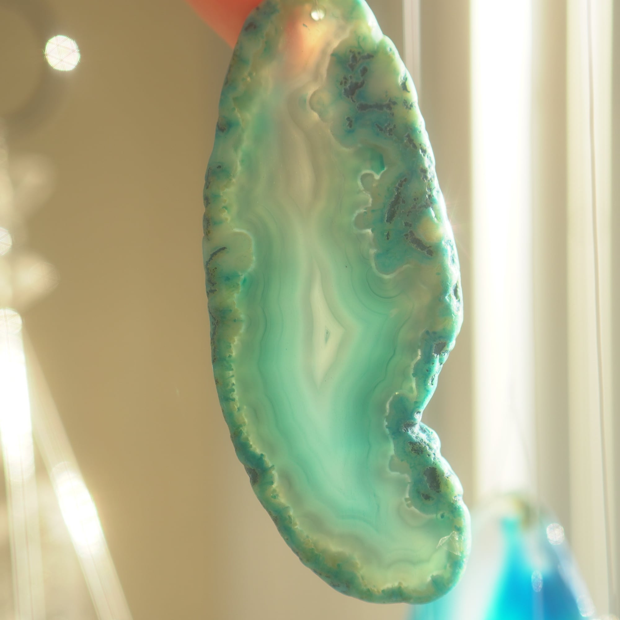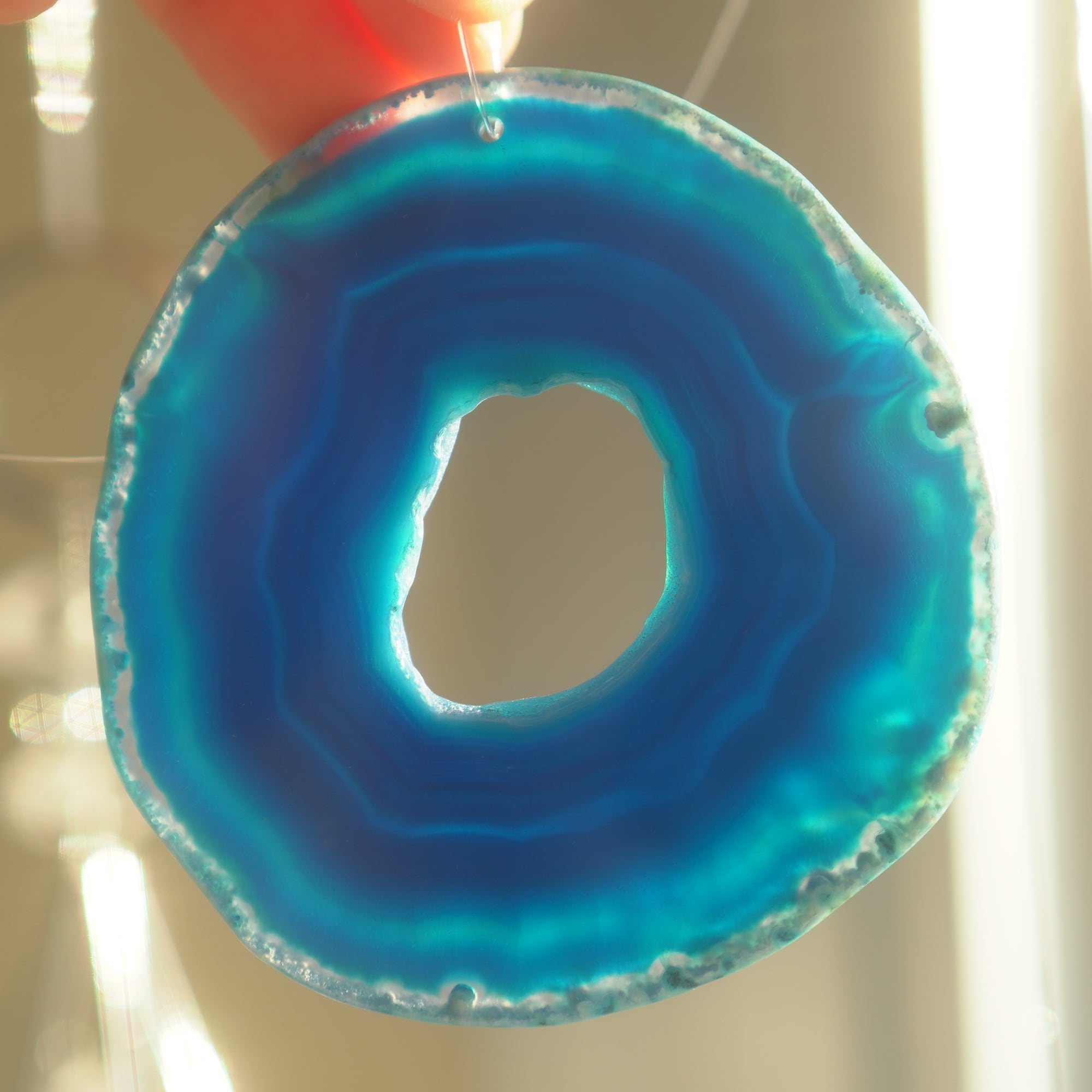 ✧染色の石なので耐光性(光による経年でのカラー変化の耐性)に優れているわけではなくベランダなど一日の中で長時間強い日光に当たるような場所に飾られるのはおすすめしないのですが、陽光に透かした時にだけ真価を発揮する美しさがありますので、是非、時折翳したりして光と一緒にお楽しみいただけたらと思います。特に濃い鮮やかな色など、色変化が気になられる場合は、日光のあまり当たらない場所に飾ってくださいね✧
