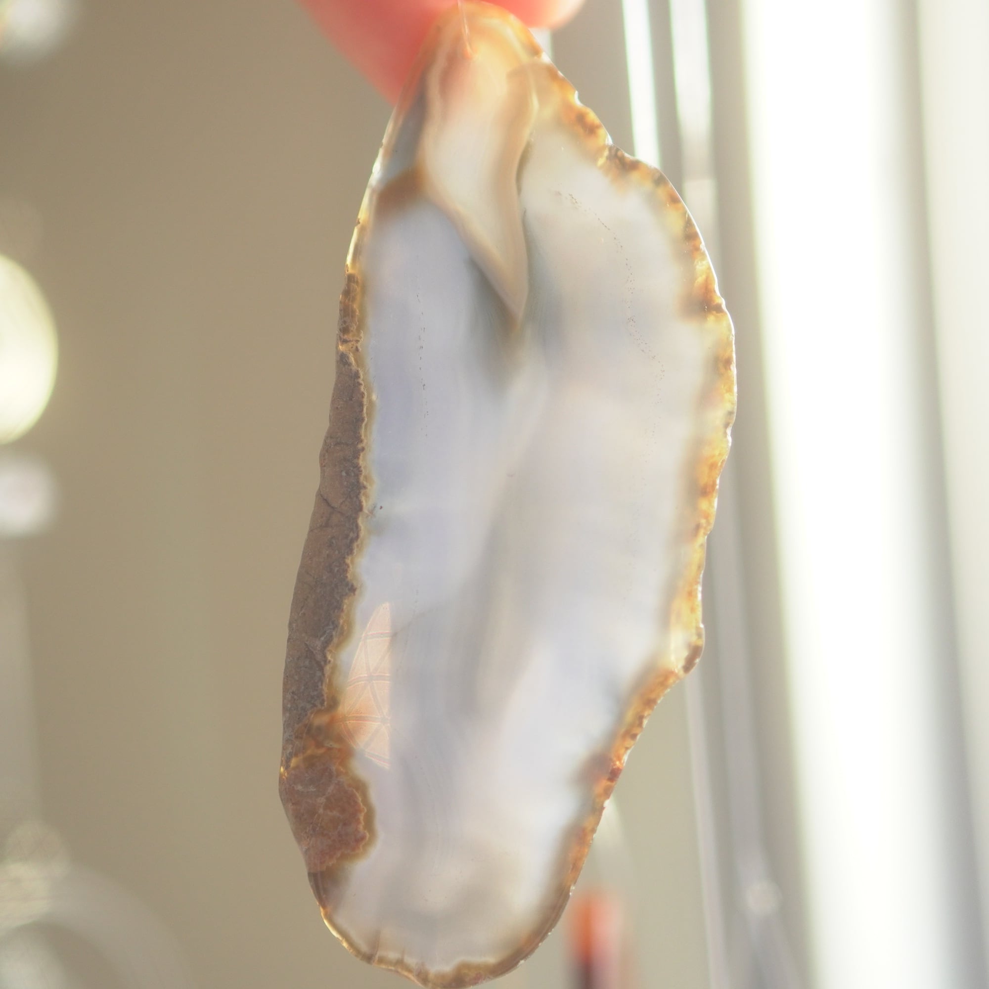 重ねる石同士の側面の加工状態によっても良い音が鳴ったり鳴らなかったり、石の見た目だけで組み合わせを決められないことが難しいポイントでもあるのですが、そんな中、たくさんの石の中から選ばれた5枚のスライスアゲートから出来上がったチャイムたちは、どこか悠々自適に空を泳ぐ妖精のようでもあり、それぞれの音を楽しそうに奏でてくれます。
