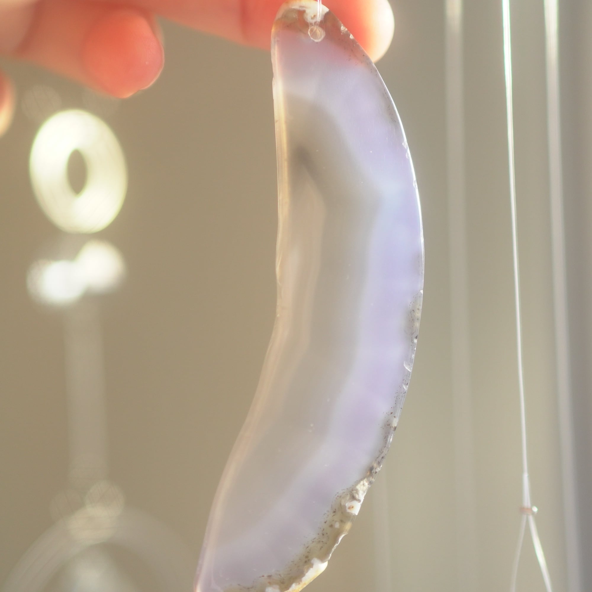 元々の瑪瑙風鈴とは使っている石の大きさや厚みが異なり、こちらのものはそれ同士重ねるだけでは特別音が鳴らない厚さのスライスアゲートを使用しているのですが、間に2本、細長い形状のアゲートを挟むことによって音が鳴る仕組みになっています。(もう少し変則的な組み合わせ方で音が鳴っていることもあります)