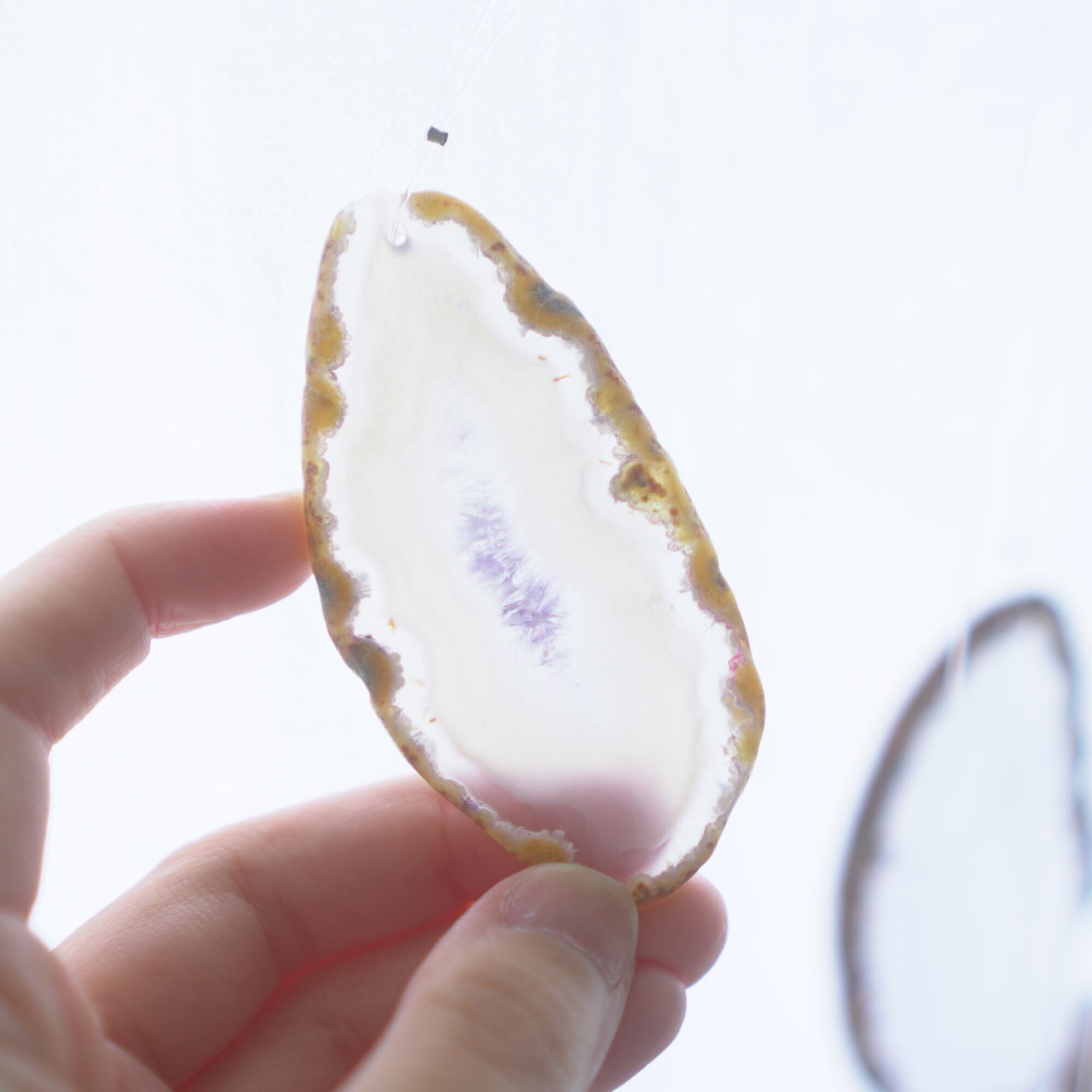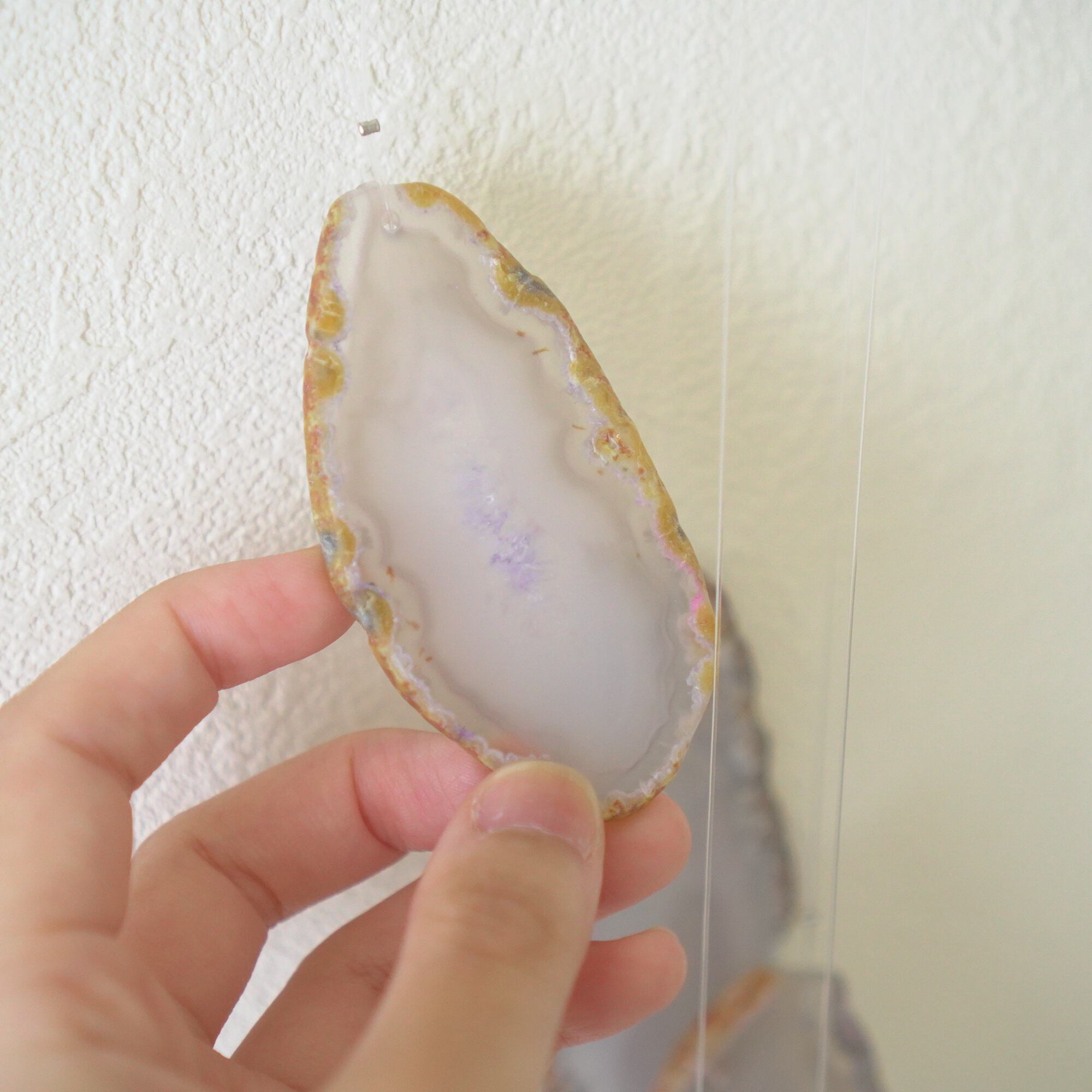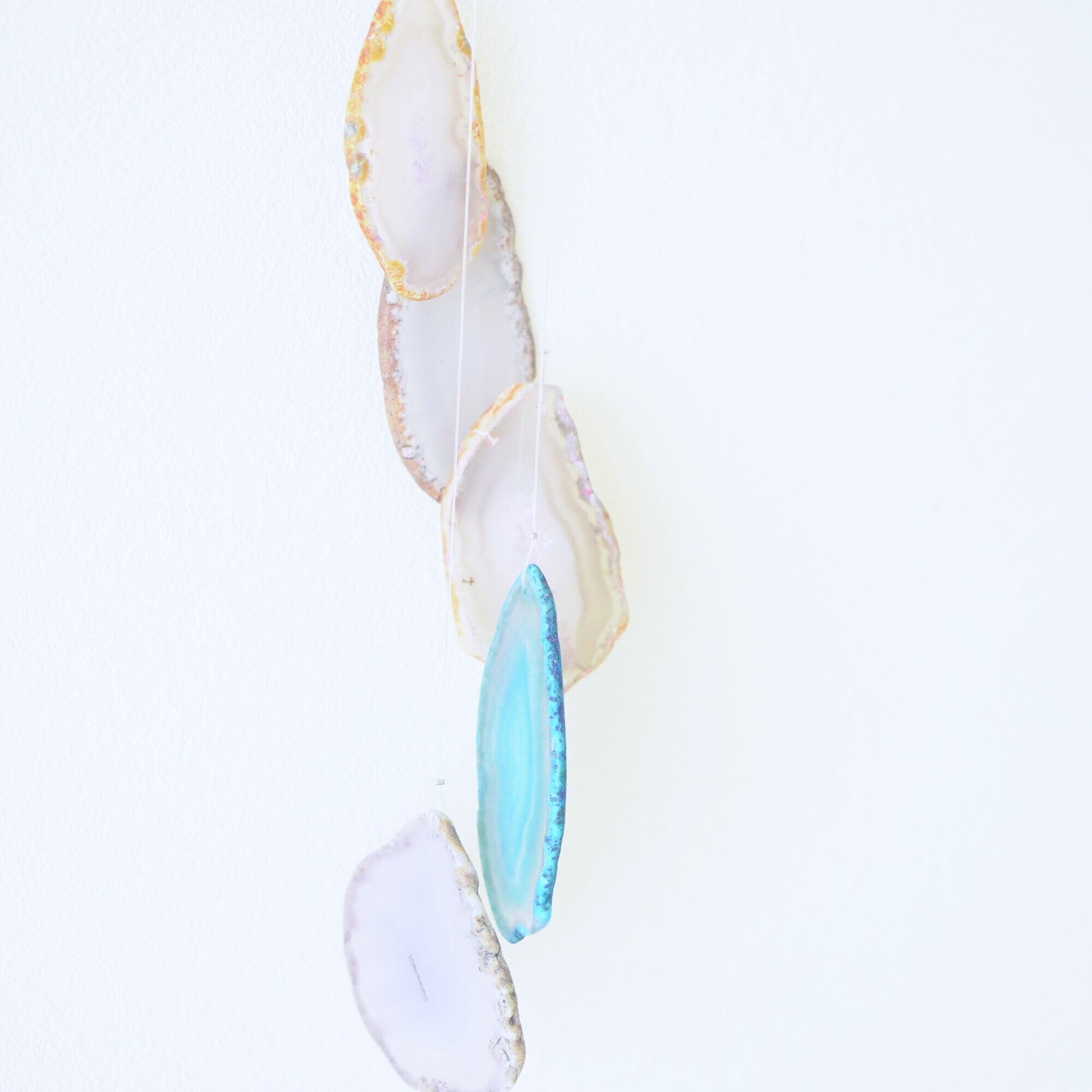 ウィンドチャイムですが、一枚一枚出方の異なるアゲートの個性的な柄は吊るすだけでおしゃれなインテリアにもなります。