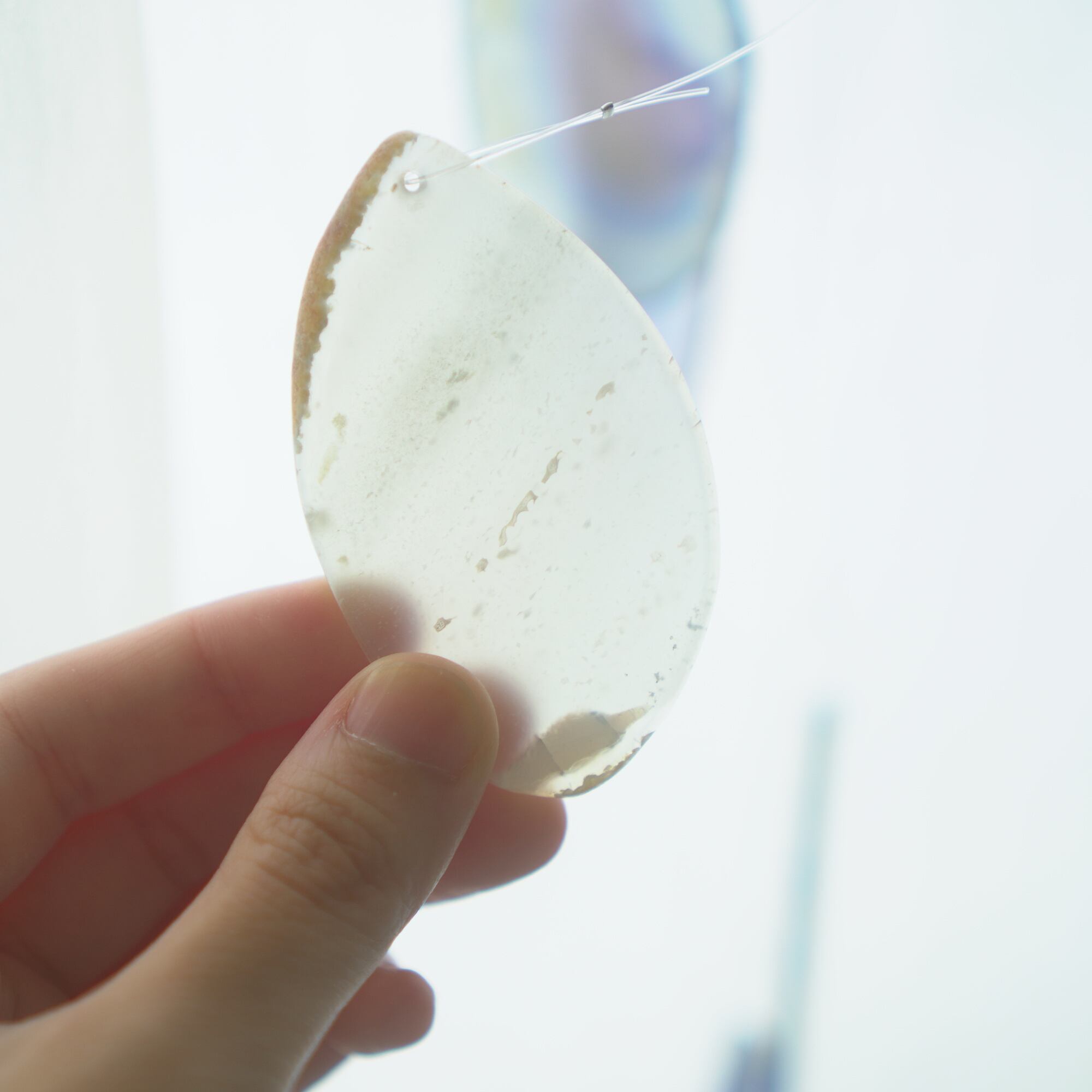 また、透明感が魅力でもあるので、窓際で自然光を通した際と、室内灯の下で光を通さずに見る際、異なる表情を見せてくれますのでその違いも是非お楽しみください。(写真の前半は自然光を透かせたもので、後半の2枚は光を透かさず壁を背景に撮影したものです)