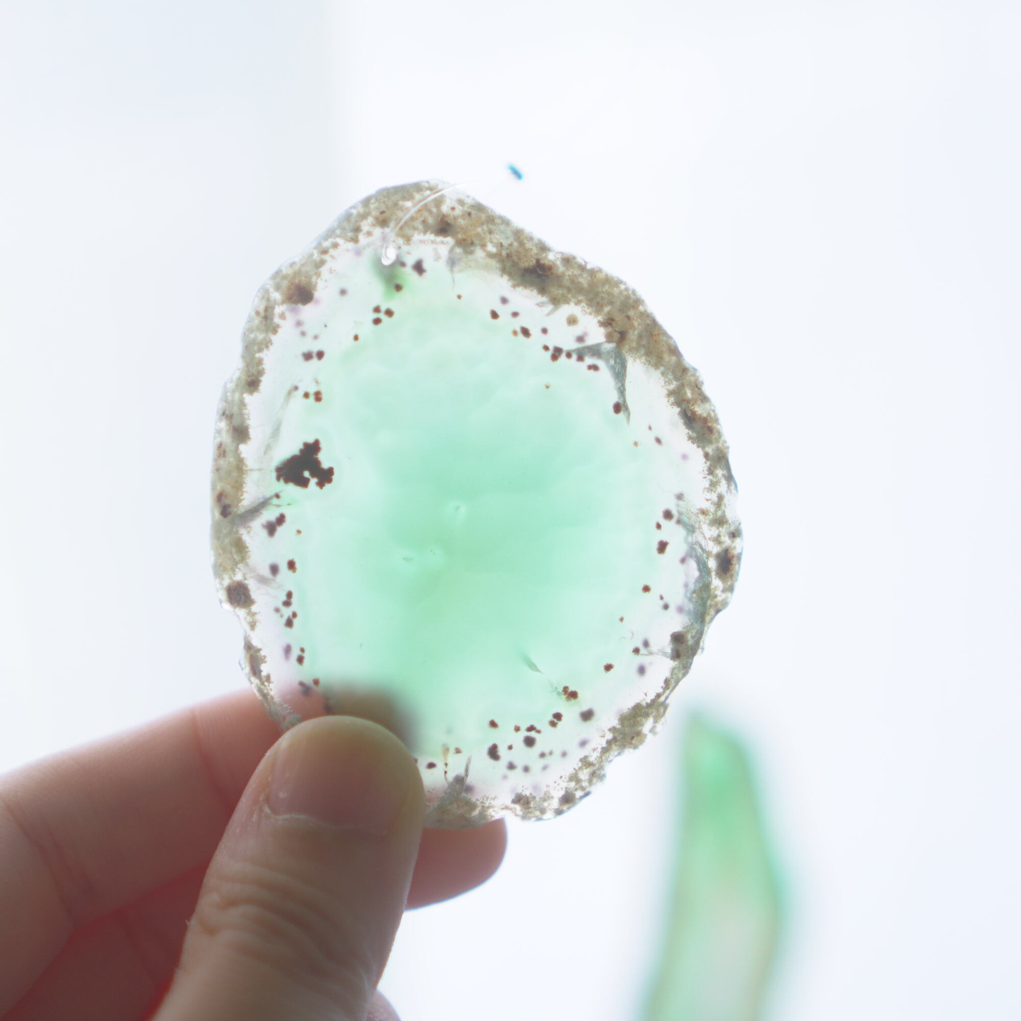 また、透明感が魅力でもあるので、窓際で自然光を通した際と、室内灯の下で光を通さずに見る際、異なる表情を見せてくれますのでその違いも是非お楽しみください。(写真の前半は自然光を透かせたもので、後半の2枚は光を透かさず壁を背景に撮影したものです)