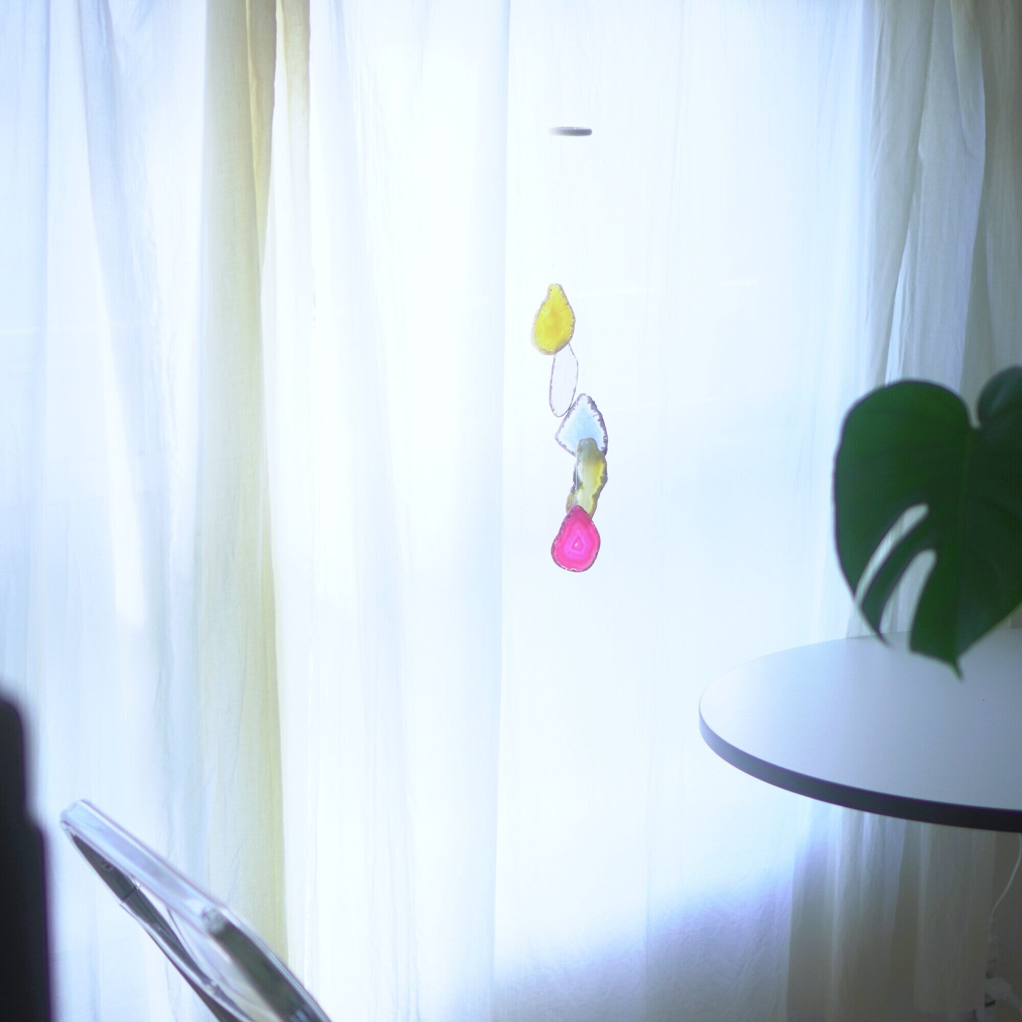 そしてカーテン越しではなく直射日光を当てた際のサンキャッチャーとしてのチャイムも、美しい光をお部屋の中に運んでくれます。(このページの下部に動画あり)