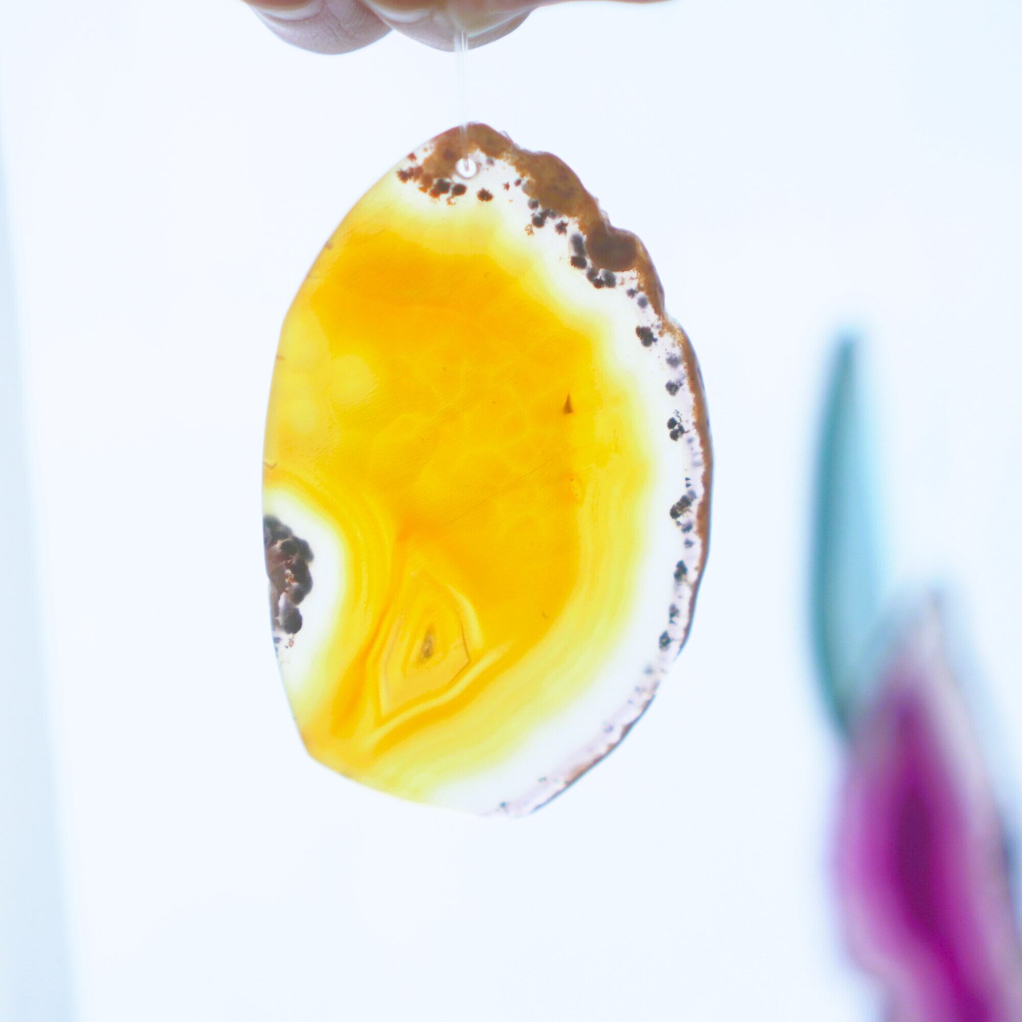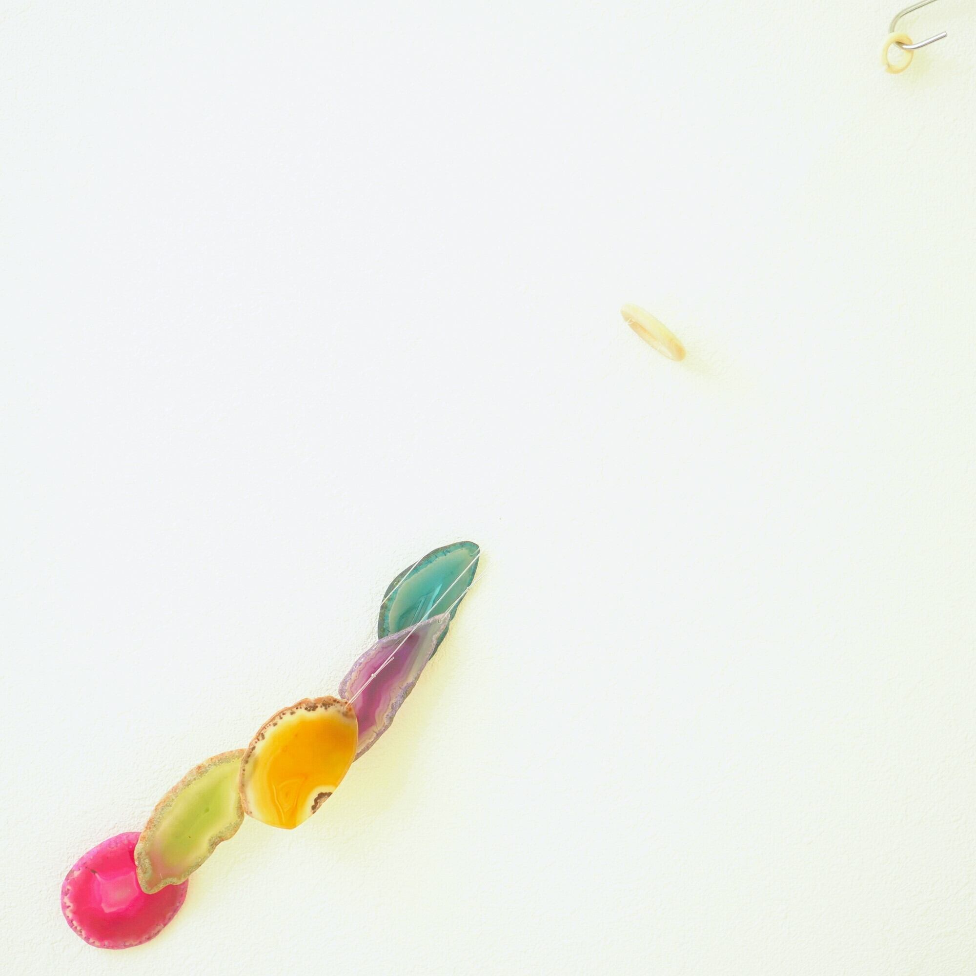 (瑪瑙の濃い色は染色によるもので、水に濡れたり布で擦ると多少色落ちします。飾るものなので大丈夫かと思いますが白いお洋服などには触れないようにされてください。また、画像のような細かなヒビ・カケはスライスメノウの加工上かなり多くあるので、チャイムとしての機能や全体の外観を著しく損なうものを除き、見た目の完璧さ<音色の響き重視で選んで使用しております、よろしくお願い致します)