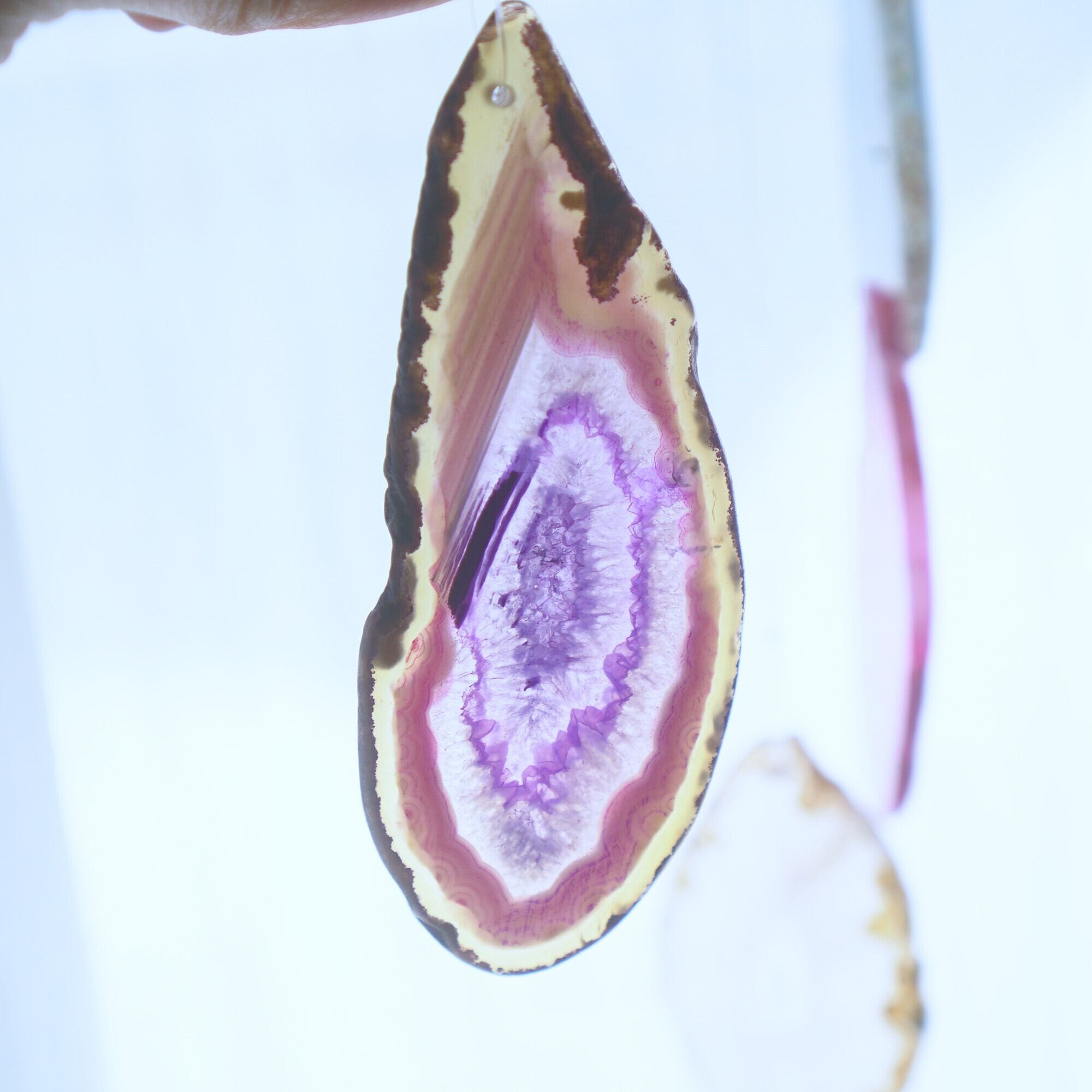✧✧✧瑪瑙の濃い色は染色によるもので、水に濡れたり布で擦ると多少色落ちします。飾るものなので大丈夫かと思いますが白いお洋服などには触れないようにされてください。また、画像のような細かなヒビ・カケはスライスメノウの加工上かなり多くあるので、チャイムとしての機能や全体の外観を著しく損なうものを除き、見た目の完璧さ<音色の響き重視で選んで使用しております、よろしくお願い致します✧✧✧