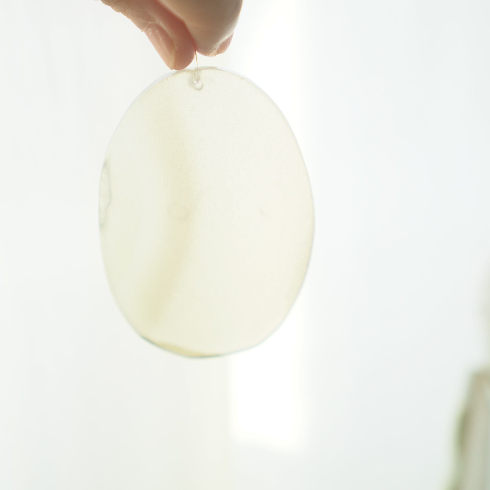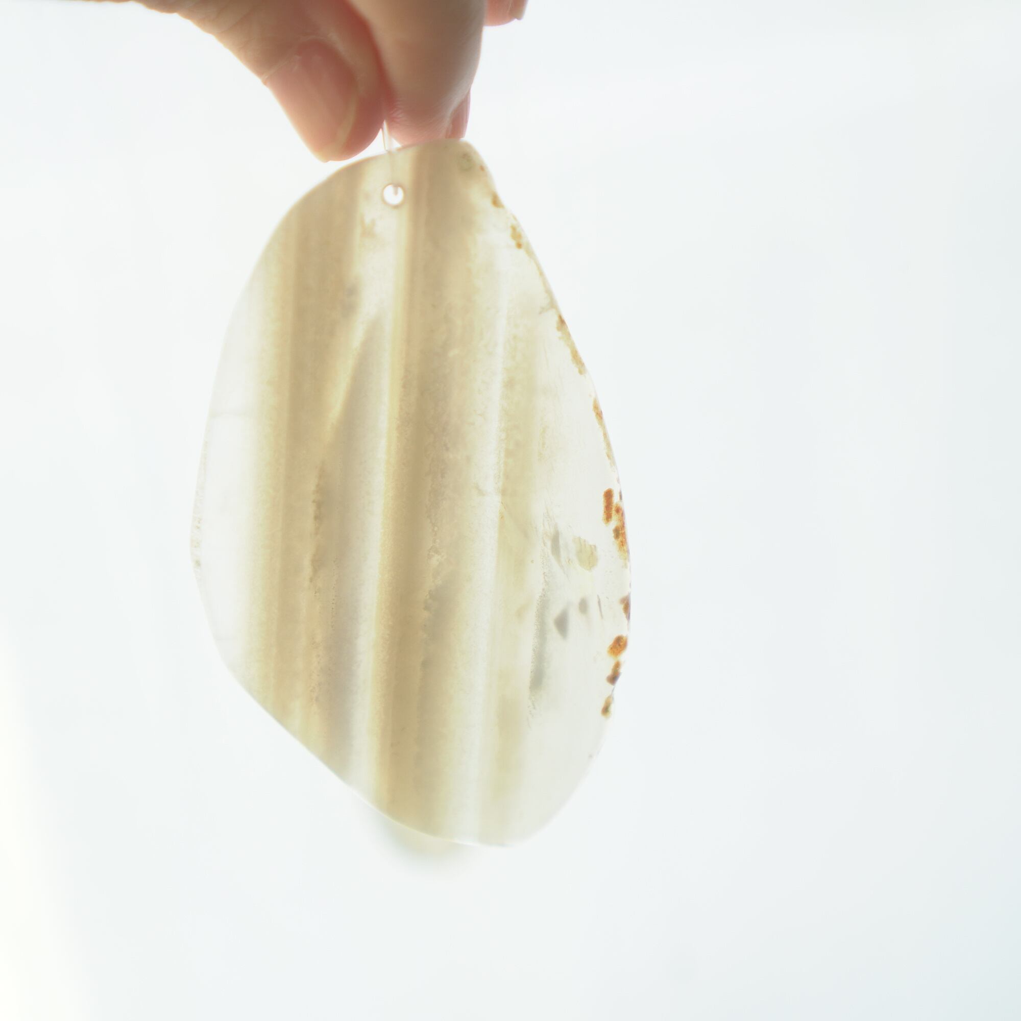 また、透明感が魅力でもあるので、窓際で自然光を通した際と、室内灯の下で光を通さずに見る際、異なる表情を見せてくれますのでその違いも是非お楽しみください。(写真の前半は自然光を透かせたもので、後半の2枚は光を透かさず壁を背景に撮影したものです)