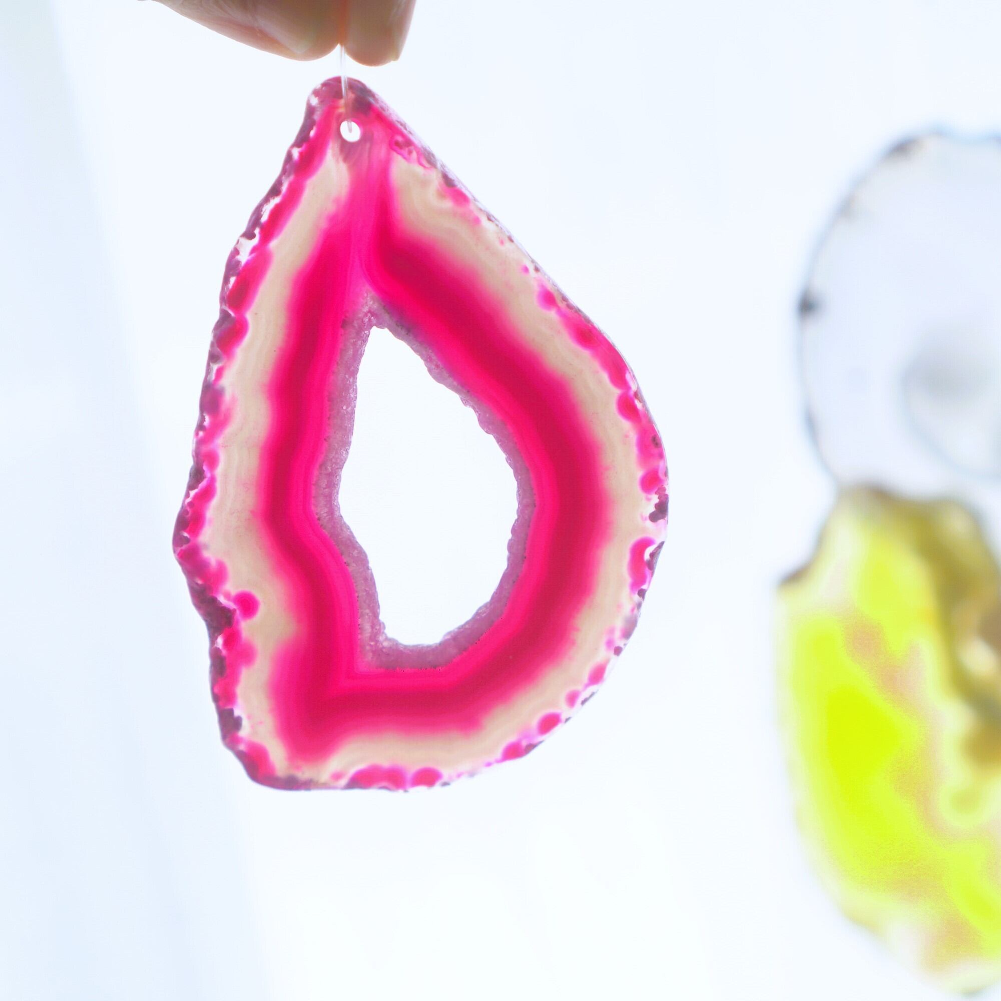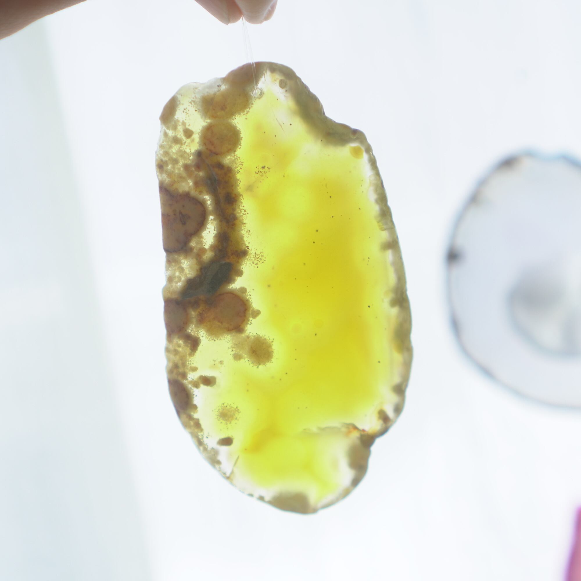 (瑪瑙の濃い色は染色によるもので、水に濡れたり布で擦ると多少色落ちします。飾るものなので大丈夫かと思いますが白いお洋服などには触れないようにされてください。また、画像のような細かなヒビ・カケはスライスメノウの加工上かなり多くあるので、チャイムとしての機能や全体の外観を著しく損なうものを除き、見た目の完璧さ<音色の響き重視で選んで使用しております、よろしくお願い致します)