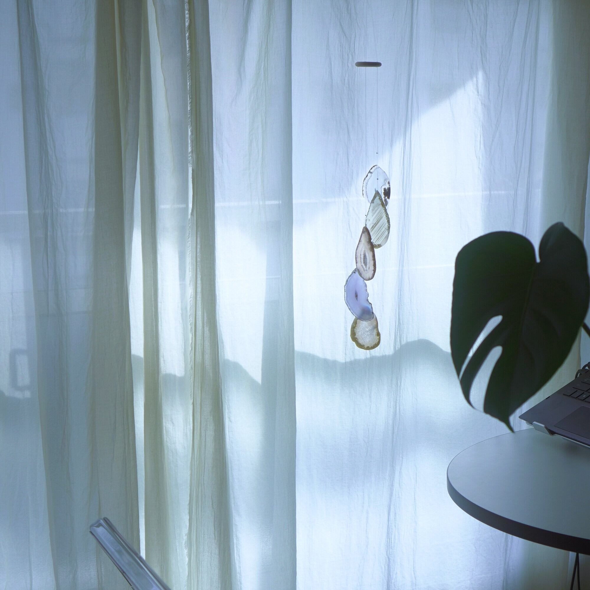 そしてカーテン越しではなく直射日光を当てた際のサンキャッチャーとしてのチャイムも、美しい光をお部屋の中に運んでくれます。(このページの下部に動画あり)