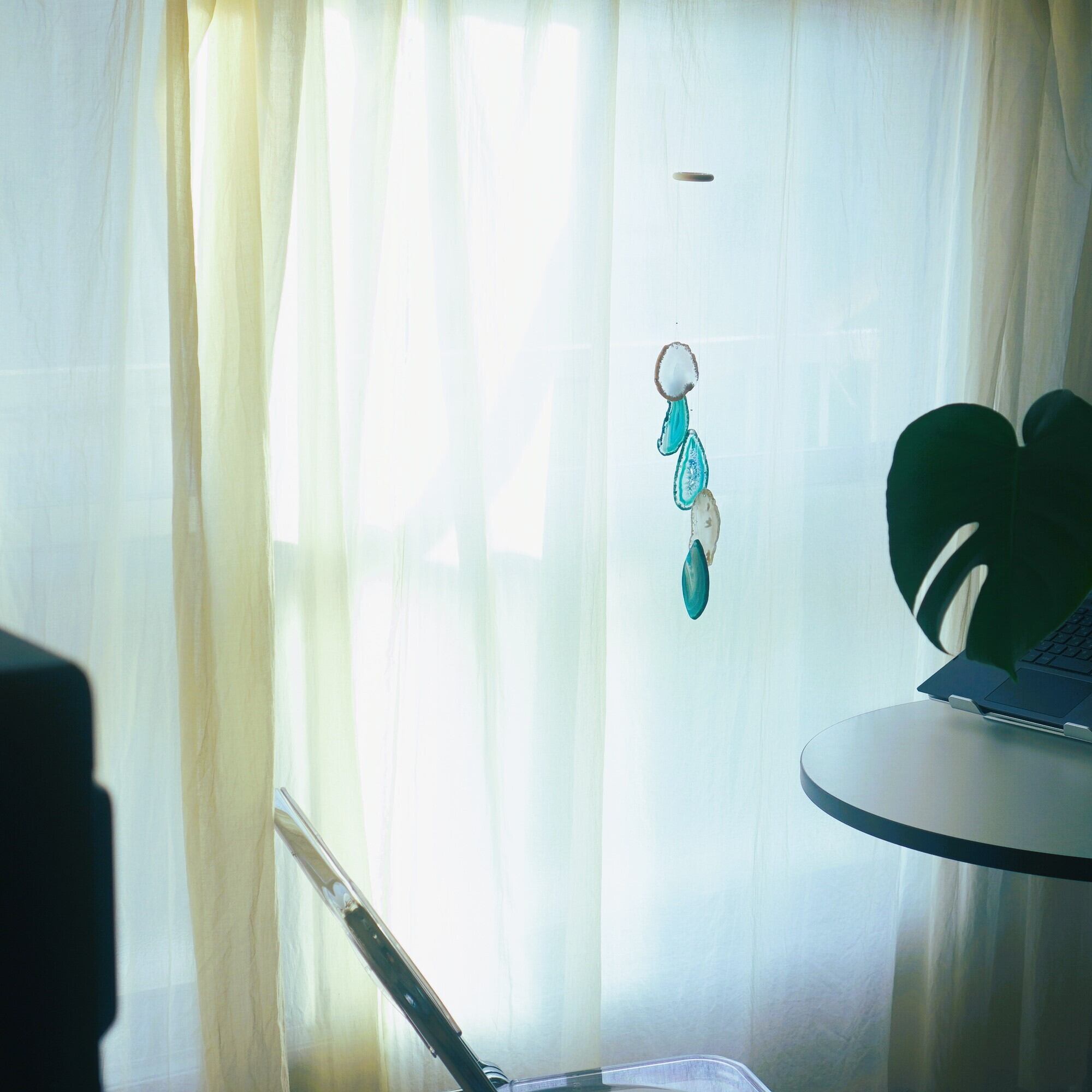 そしてカーテン越しではなく直射日光を当てた際のサンキャッチャーとしてのチャイムも、美しい光をお部屋の中に運んでくれます。(このページの下部に動画あり)