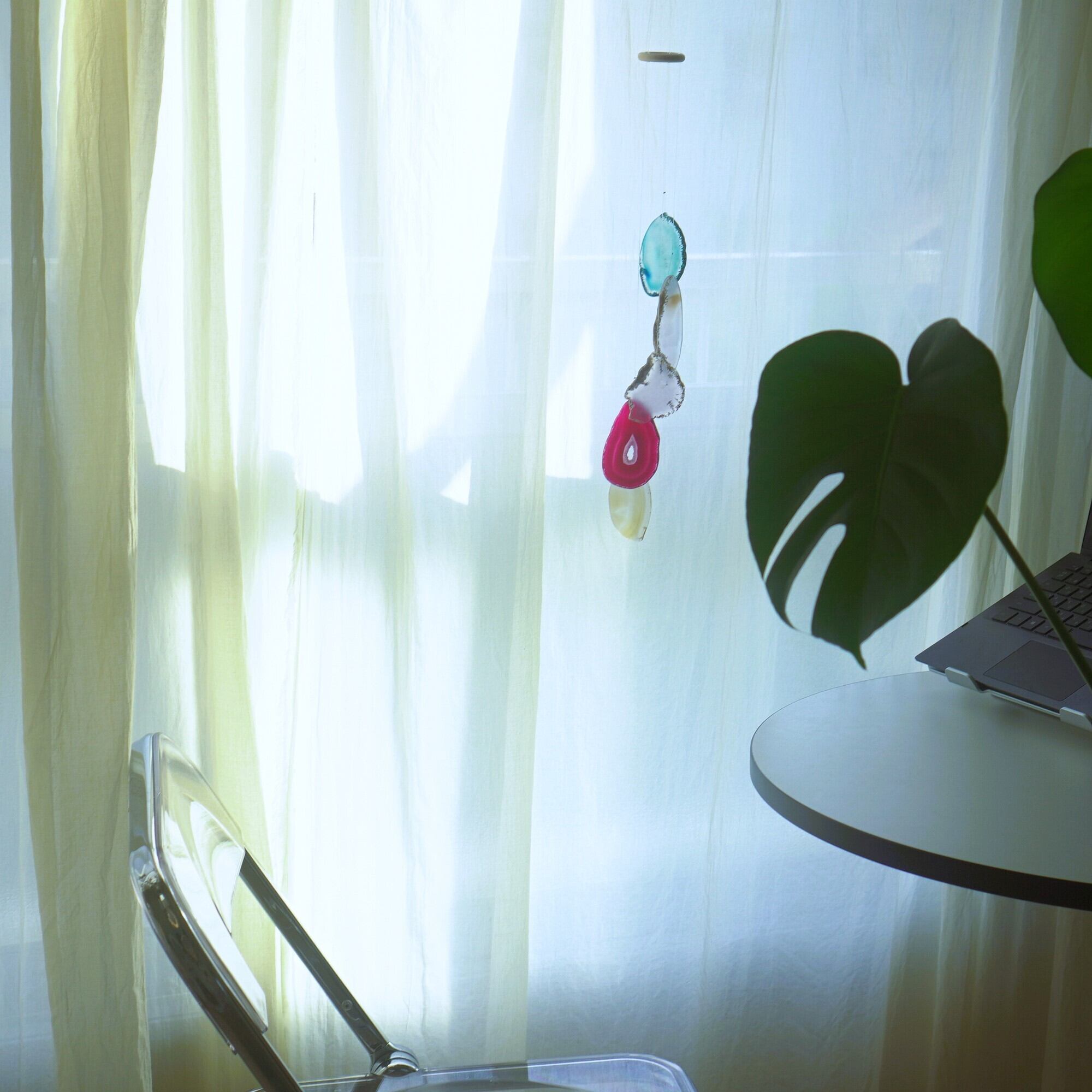 そしてカーテン越しではなく直射日光を当てた際のサンキャッチャーとしてのチャイムも、美しい光をお部屋の中に運んでくれます。(このページの下部に動画あり)