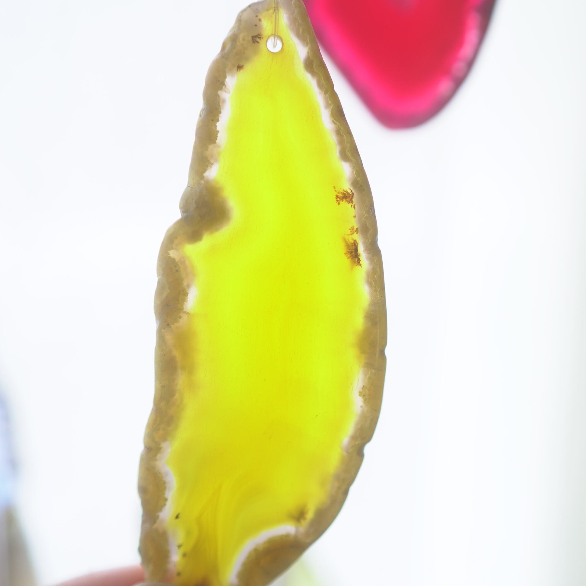 ✧✧✧瑪瑙の濃い色は染色によるもので、水に濡れたり布で擦ると多少色落ちします。飾るものなので大丈夫かと思いますが白いお洋服などには触れないようにされてください。また、画像のような細かなヒビ・カケはスライスメノウの加工上かなり多くあるので、チャイムとしての機能や全体の外観を著しく損なうものを除き、見た目の完璧さ<音色の響き重視で選んで使用しております、よろしくお願い致します✧✧✧