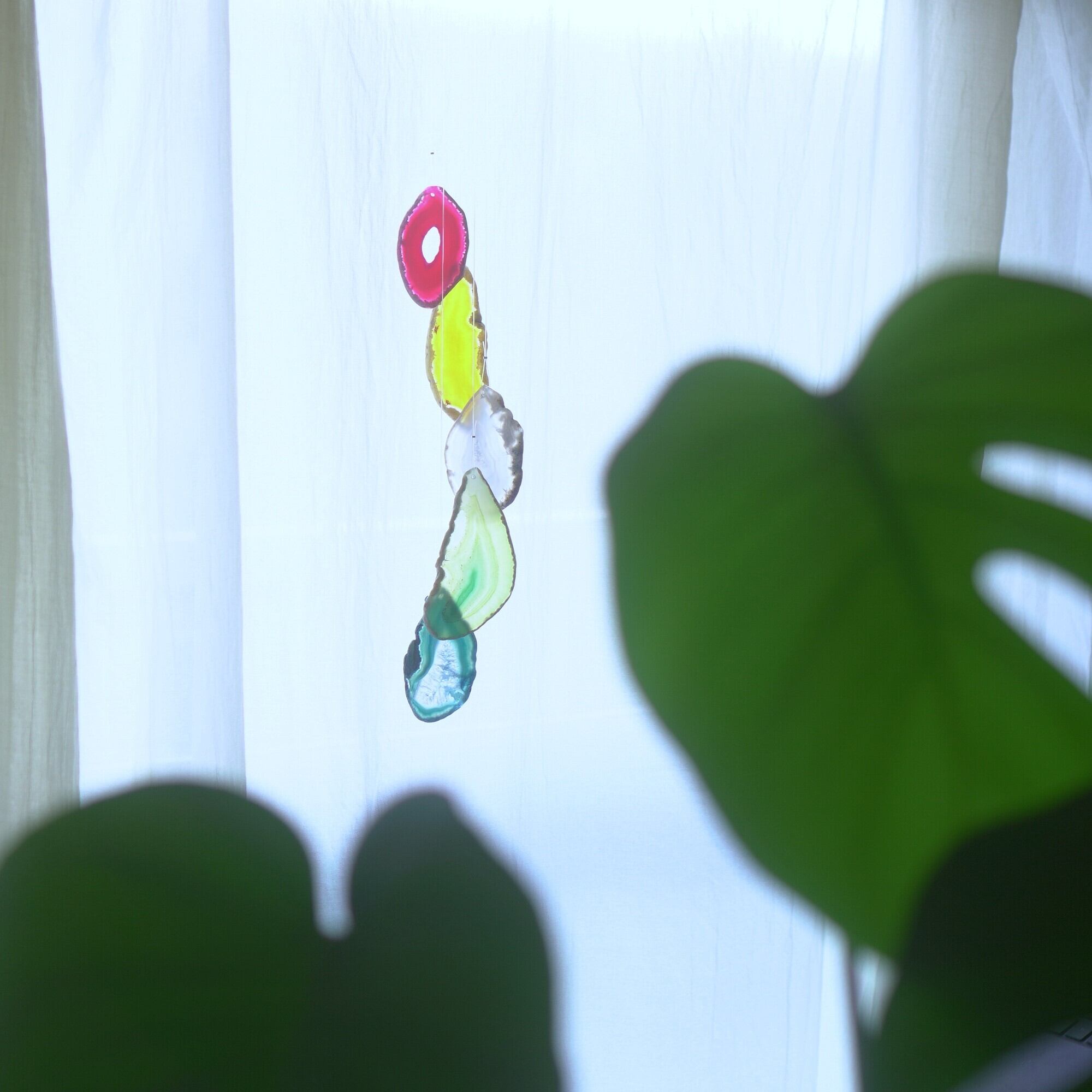 そしてカーテン越しではなく直射日光を当てた際のサンキャッチャーとしてのチャイムも、美しい光をお部屋の中に運んでくれます。(このページの下部に動画あり)