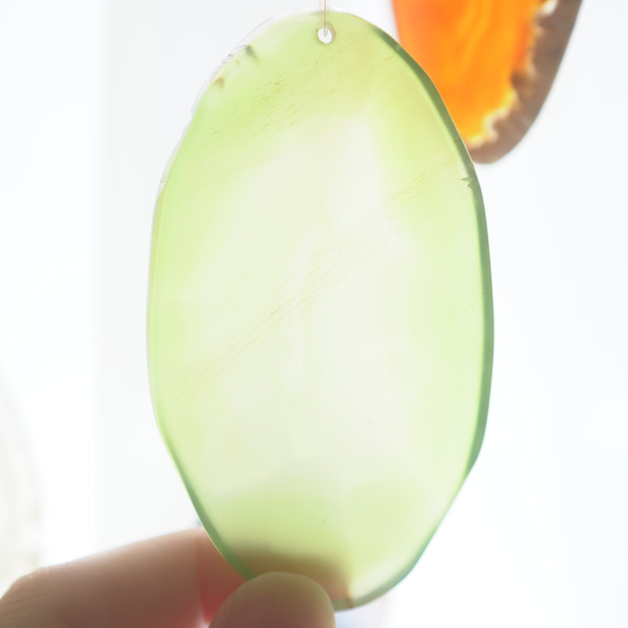 また、透明感が魅力でもあるので、窓際で自然光を通した際と、室内灯の下で光を通さずに見る際、異なる表情を見せてくれますのでその違いも是非お楽しみください。(写真の前半は自然光を透かせたもので、後半の2枚は光を透かさず壁を背景に撮影したものです)