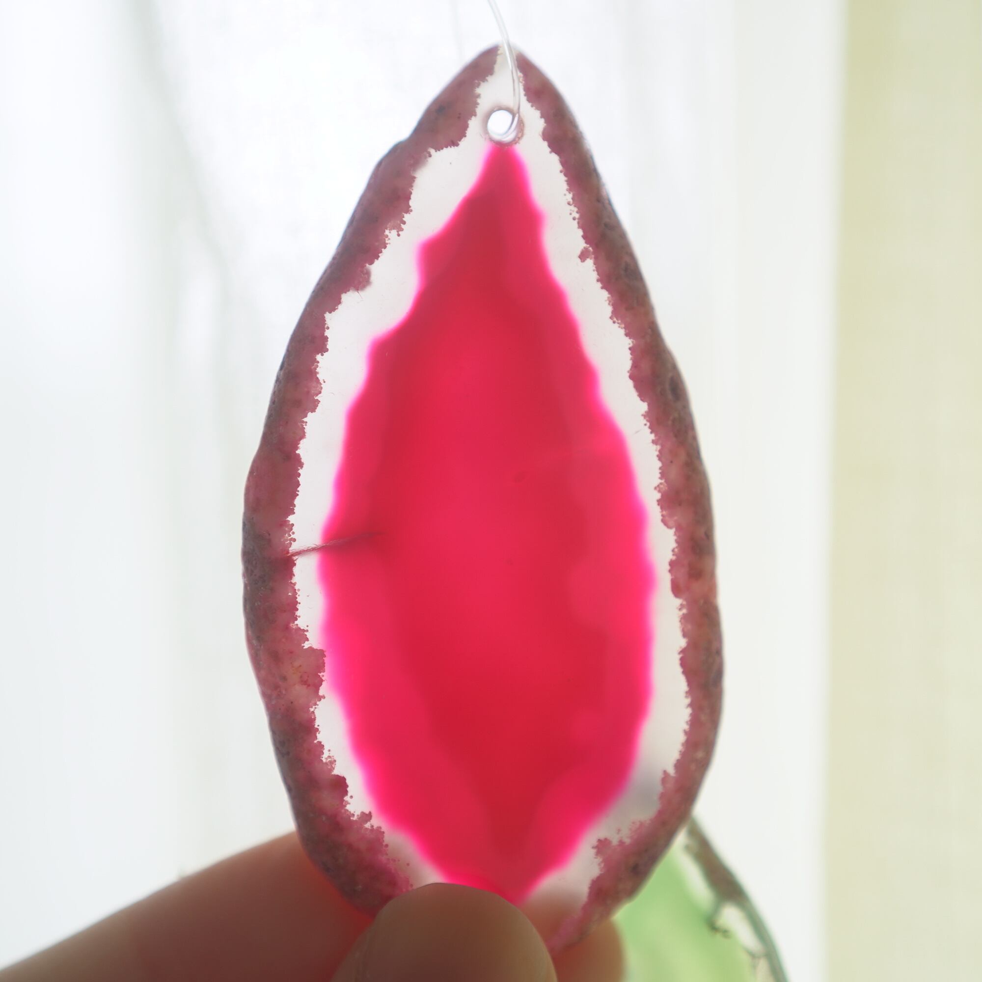 ✧✧✧瑪瑙の濃い色は染色によるもので、水に濡れたり布で擦ると多少色落ちします。飾るものなので大丈夫かと思いますが白いお洋服などには触れないようにされてください。また、画像のような細かなヒビ・カケはスライスメノウの加工上かなり多くあるので、チャイムとしての機能や全体の外観を著しく損なうものを除き、見た目の完璧さ<音色の響き重視で選んで使用しております、よろしくお願い致します✧✧✧