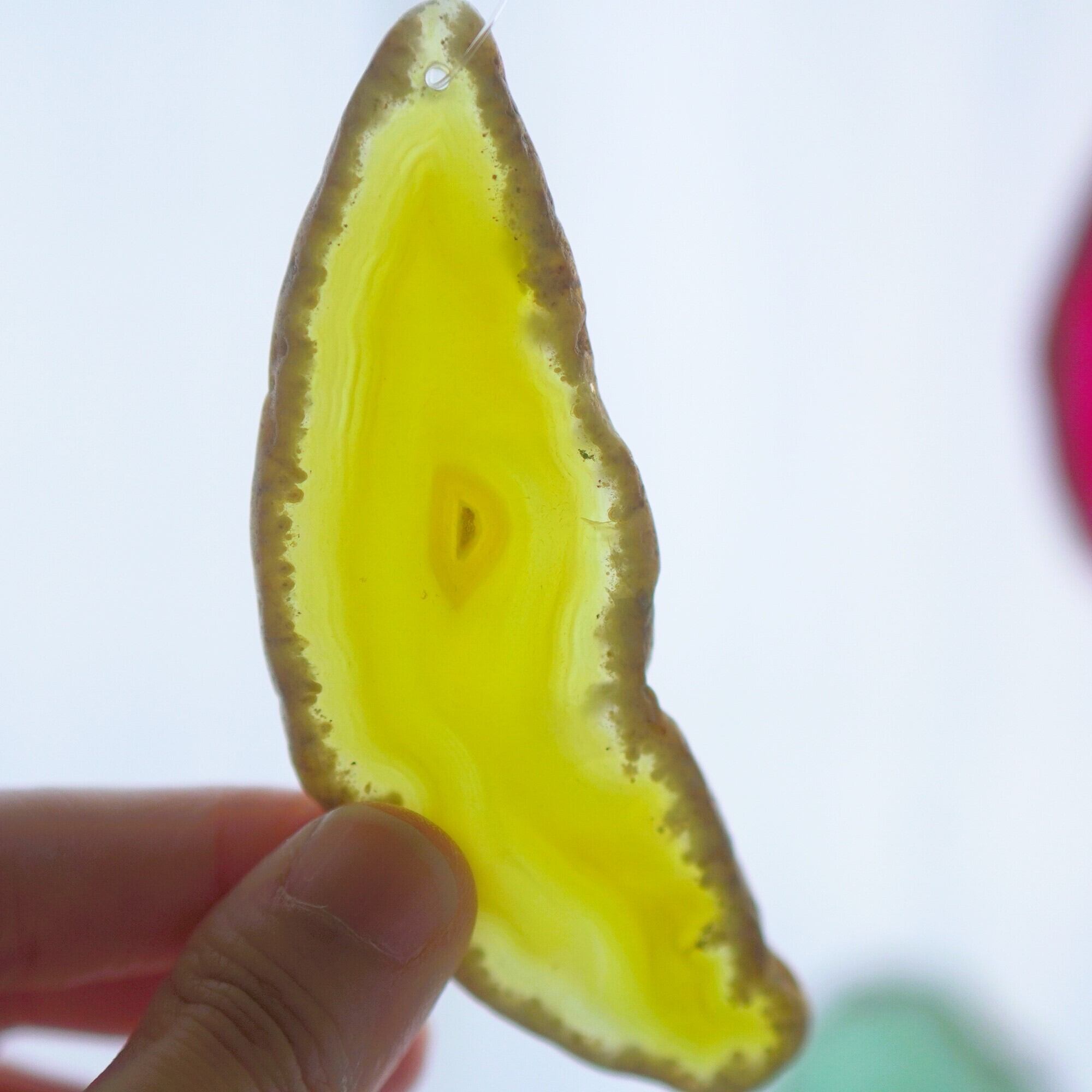 ✧✧✧瑪瑙の濃い色は染色によるもので、水に濡れたり布で擦ると多少色落ちします。飾るものなので大丈夫かと思いますが白いお洋服などには触れないようにされてください。また、画像のような細かなヒビ・カケはスライスメノウの加工上かなり多くあるので、チャイムとしての機能や全体の外観を著しく損なうものを除き、見た目の完璧さ<音色の響き重視で選んで使用しております、よろしくお願い致します✧✧✧