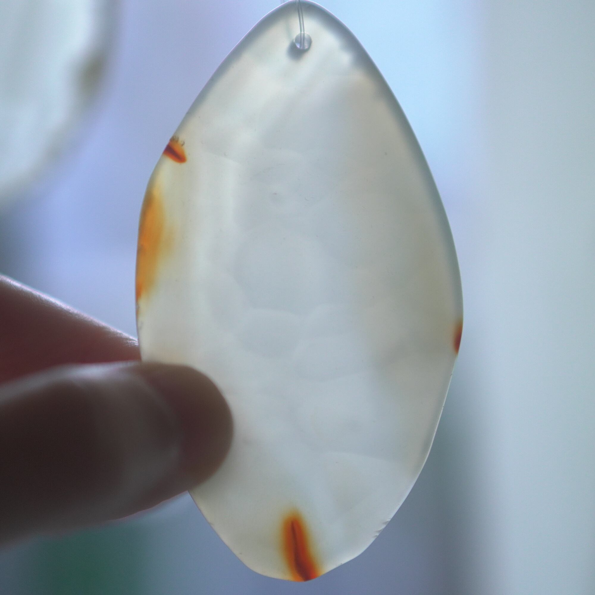 ✧✧✧瑪瑙の濃い色は染色によるもので、水に濡れたり布で擦ると多少色落ちします。飾るものなので大丈夫かと思いますが白いお洋服などには触れないようにされてください。汚れが気になる時は若干の色落ち前提で水を軽く含ませた布やティッシュでやさしく拭いていただくことは大丈夫です。また、画像のような細かなヒビ・カケはスライスメノウの加工上かなり多くあるので、チャイムとしての機能や全体の外観を著しく損なうものを除き、見た目の完璧さ<音色の響き重視で選んで使用しております、よろしくお願い致します✧✧✧