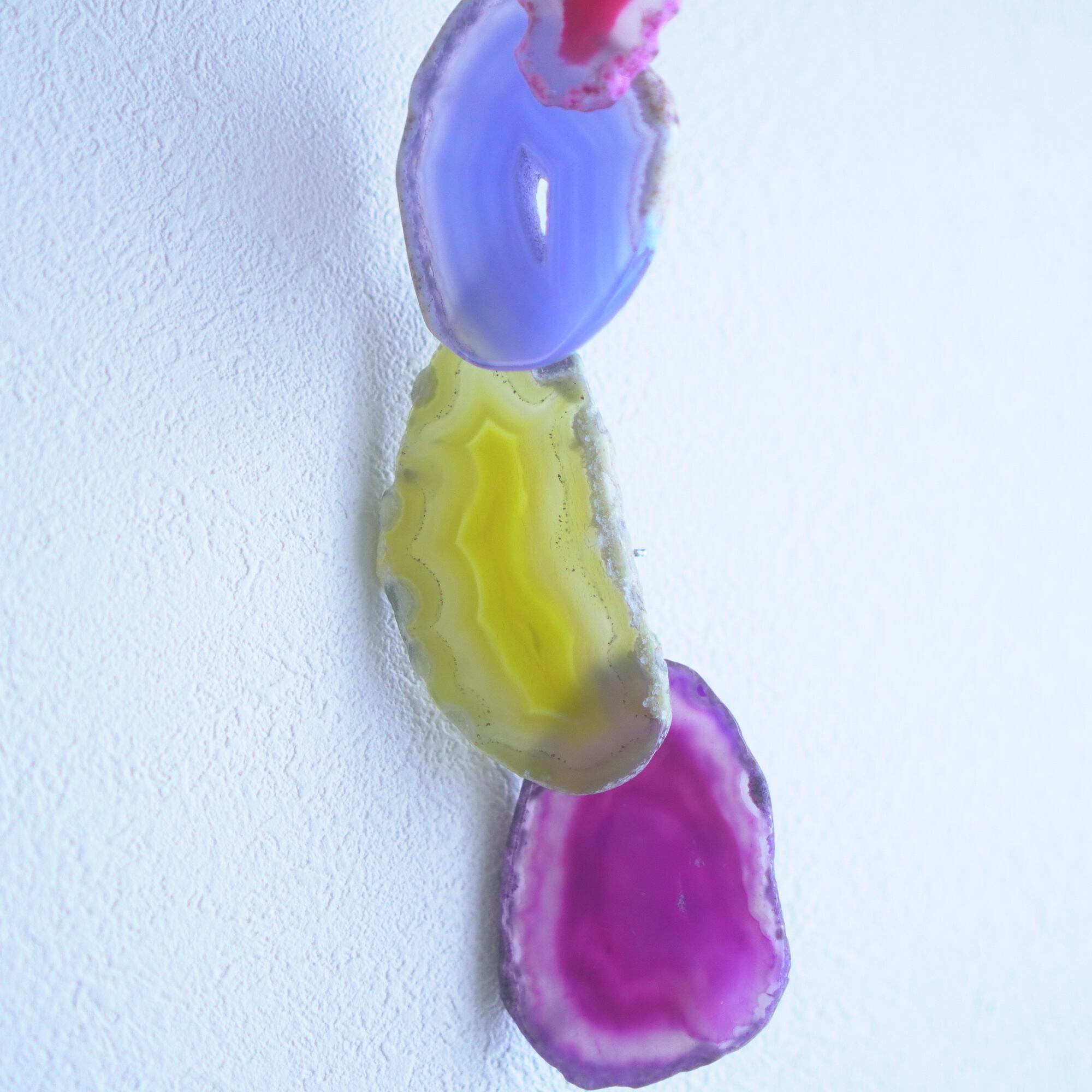✧✧✧瑪瑙の濃い色は染色によるもので、水に濡れたり布で擦ると多少色落ちします。飾るものなので大丈夫かと思いますが白いお洋服などには触れないようにされてください。汚れが気になる時は若干の色落ち前提で水を軽く含ませた布やティッシュでやさしく拭いていただくことは大丈夫です。また、画像のような細かなヒビ・カケはスライスメノウの加工上かなり多くあるので、チャイムとしての機能や全体の外観を著しく損なうものを除き、見た目の完璧さ<音色の響き重視で選んで使用しております、よろしくお願い致します✧✧✧