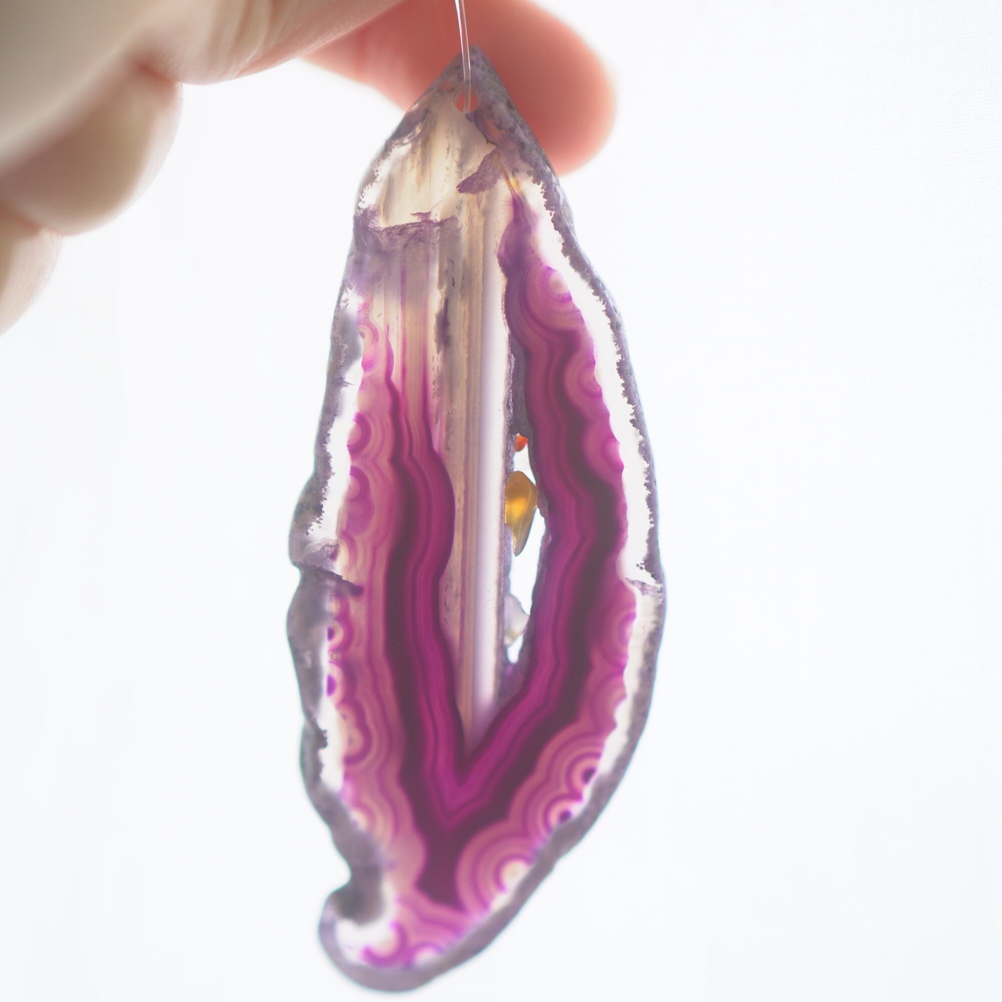 ✧✧✧瑪瑙の濃い色は染色によるもので、水に濡れたり布で擦ると多少色落ちします。飾るものなので大丈夫かと思いますが白いお洋服などには触れないようにされてください。汚れが気になる時は若干の色落ち前提で水を軽く含ませた布やティッシュでやさしく拭いていただくことは大丈夫です。また、画像のような細かなヒビ・カケはスライスメノウの加工上かなり多くあるので、チャイムとしての機能や全体の外観を著しく損なうものを除き、見た目の完璧さ<音色の響き重視で選んで使用しております、よろしくお願い致します✧✧✧
