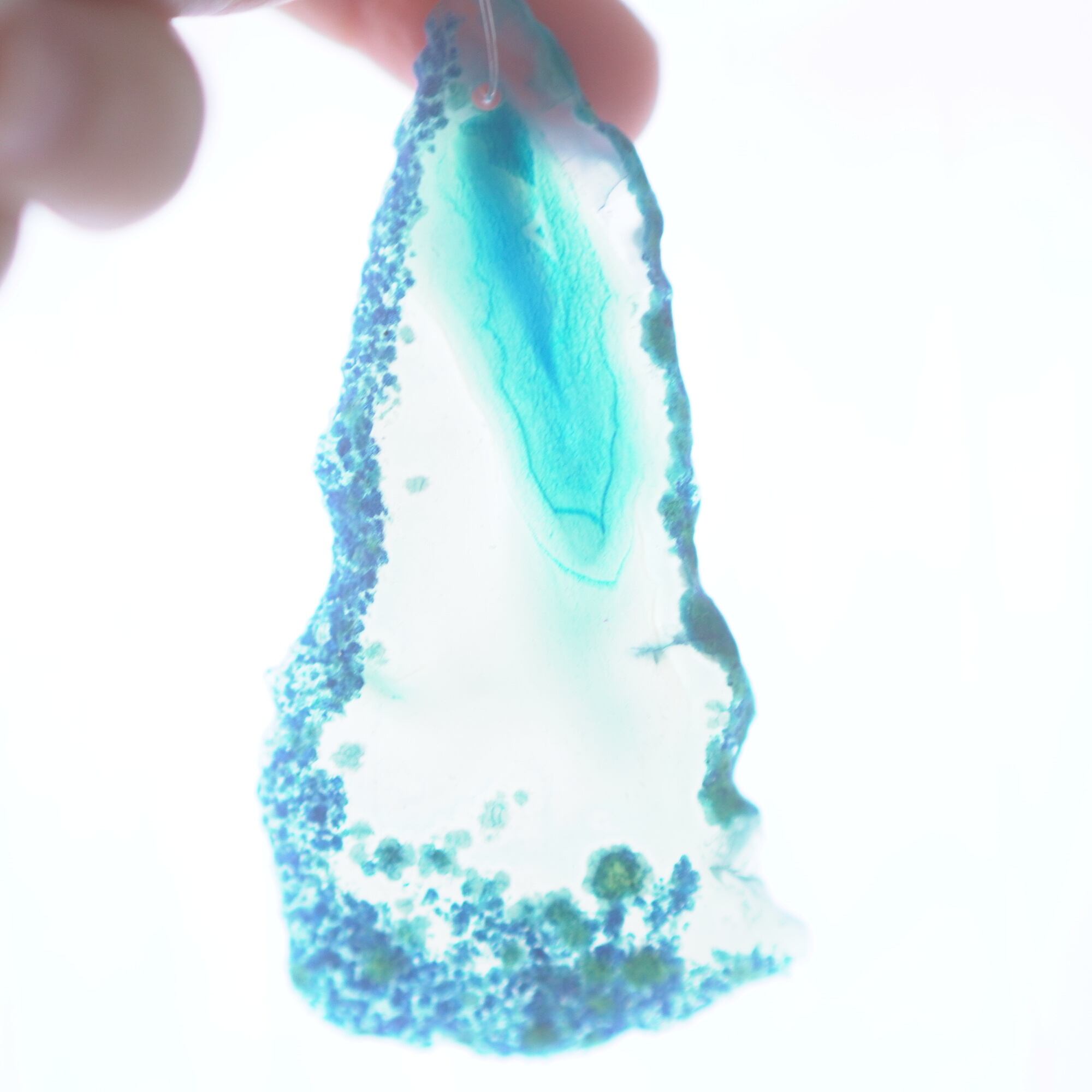 ✧✧✧染色の石なので耐光性(光による経年でのカラー変化の耐性)に優れているわけではなく一日の中で長時間強い日光に当たるような場所に飾られるのはおすすめしないのですが、陽光に透かした時にだけ真価を発揮する美しさがありますので、是非たまに翳したりして光と一緒にお楽しみいただけたらと思っております。特に濃い鮮やかな色など、気になられる場合は、日光のあまり当たらない場所に飾っていただけたらと思います✧✧✧