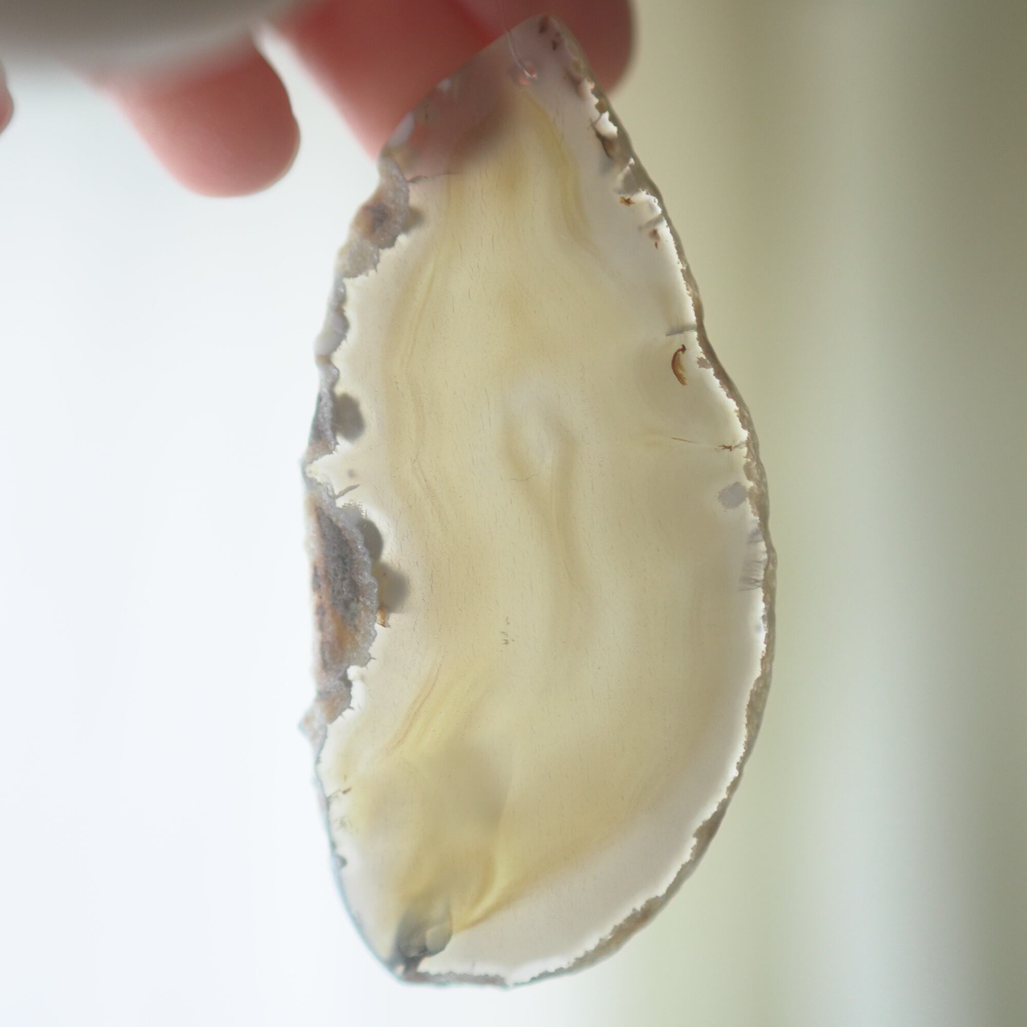 雪が積もったような白いフチの、飴色の半月型の石が珍しく可愛いです。